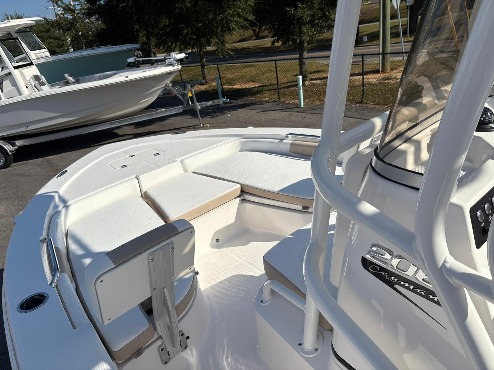 The 2026 Robalo 206 Cayman comes loaded with premium features that enhance both its functionality and aesthetics. The crisp white canvas color gives the boat a clean, modern look, while the sand-colored cockpit interior adds a touch of luxury and comfort. Trim tabs with indicators allow for precise control and a smoother ride, adapting to changing water conditions with ease. The Garmin GPSMap 943XSV provides advanced navigation and fish-finding capabilities, ensuring you stay on course and maximize your time on the water.A custom anchor adds convenience and reliability when you need to secure your position, while the white powder-coated ski tow opens up a world of watersports possibilities. The Seadek helm mat in white offers superior comfort and traction at the helm, making long days on the water more enjoyable. Removable bow seating backrests provide flexible seating arrangements, allowing you to customize the layout for fishing, lounging, or socializing. The included standard trailer makes transport and storage a breeze, and the 5-year premium level limited component warranty offers peace of mind, ensuring your investment is protected for years to come.