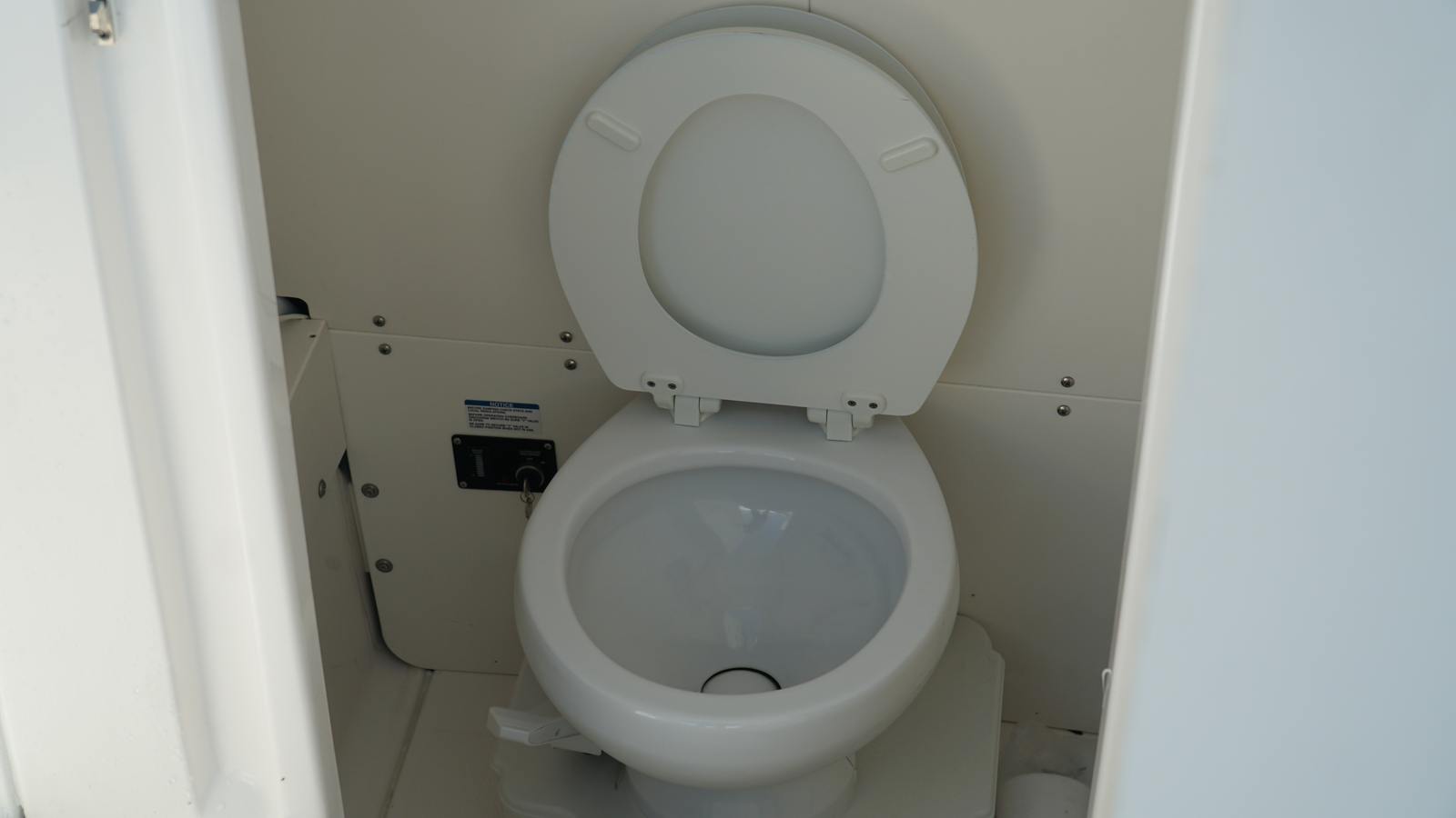 - Gravity Discharge Porcelain Toilet System with 6.5 Gallon Holding Tank and Overboard Discharge