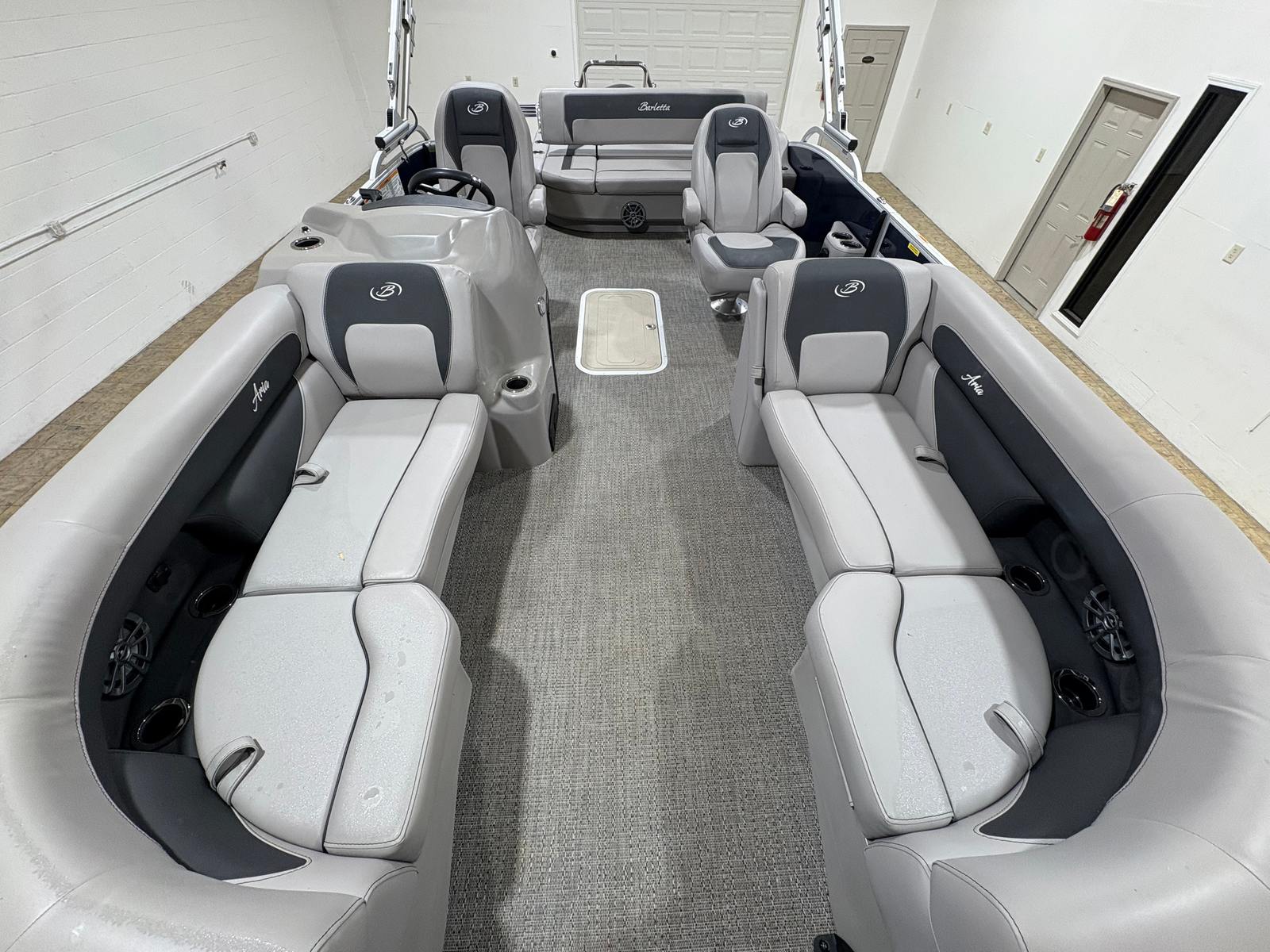 The 2025 Barletta Aria A22UC is a 21-foot pontoon boat that captures attention with its sleek lines and modern design. As a used pontoon boat, it offers the unique advantage of premium features at a more accessible price point, making it an attractive option for boating enthusiasts seeking quality and value. The Aria A22UC’s generous length provides ample space for passengers to move about comfortably, ensuring that every outing is both enjoyable and memorable. The combination of the Triple Toon Package and the striking Blue Sapphire Railskin creates a visual statement that is sure to turn heads at any marina or lake.