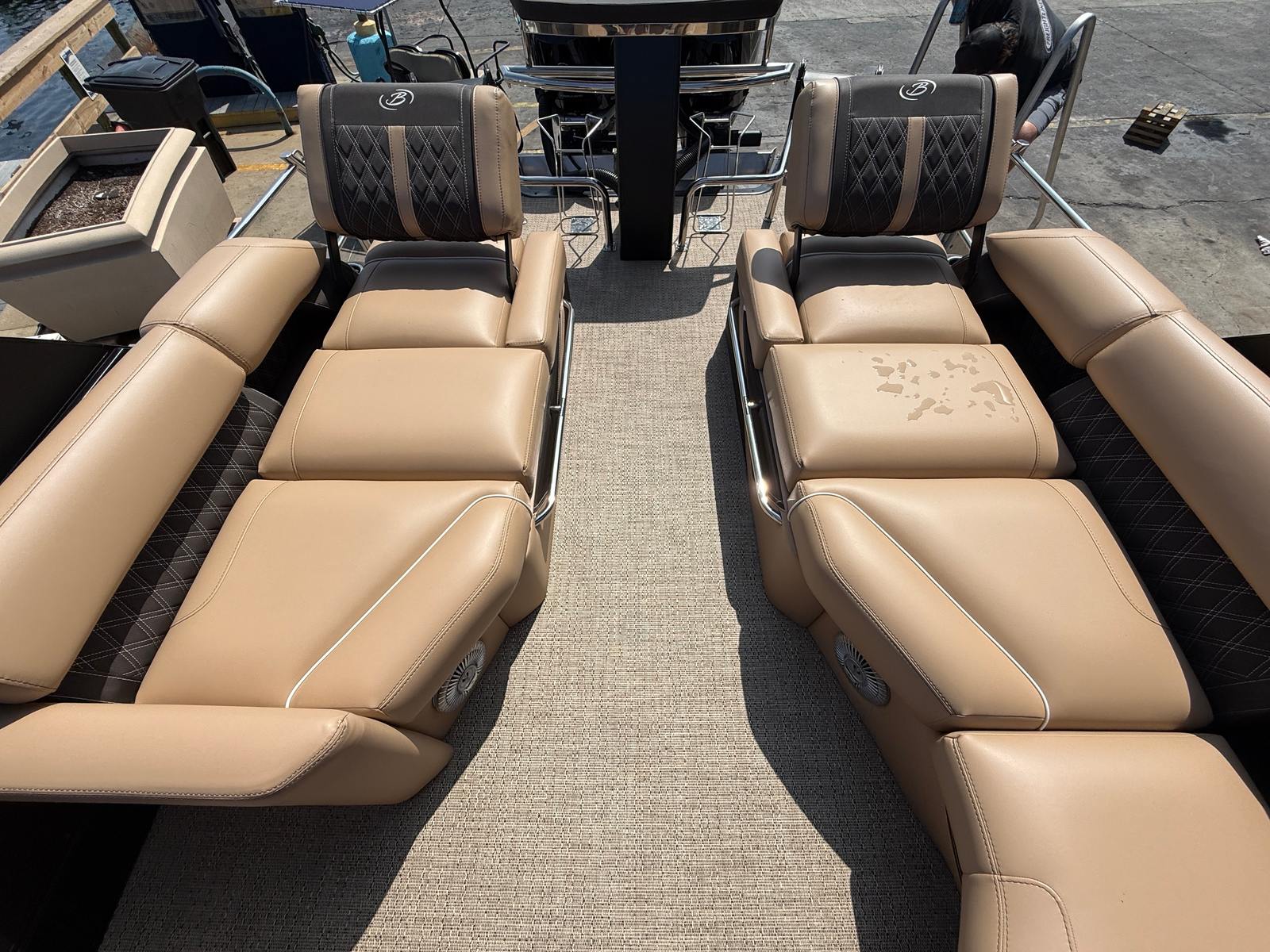In addition to its recreational appeal, the Lusso L25MAT offers practical benefits that make ownership easy and enjoyable. The pontoon design provides excellent stability, making it ideal for families with children or those who prefer a smooth, steady ride. The spacious layout allows for convenient storage of gear, water toys, and personal items, ensuring everything you need is within reach. The dual engines not only enhance performance but also contribute to efficient fuel usage, helping you spend more time on the water and less at the pump. Docking and maneuvering are simplified by the responsive controls, making this pontoon boat for sale a pleasure to operate.