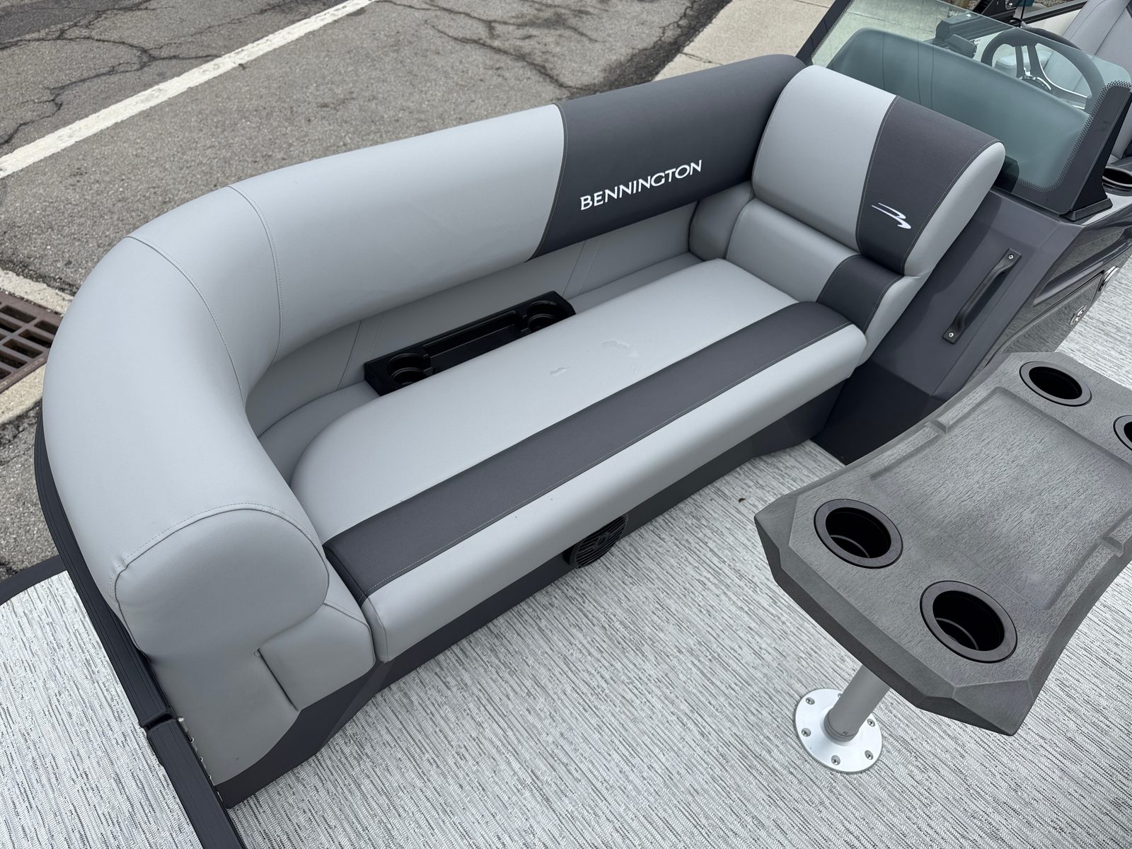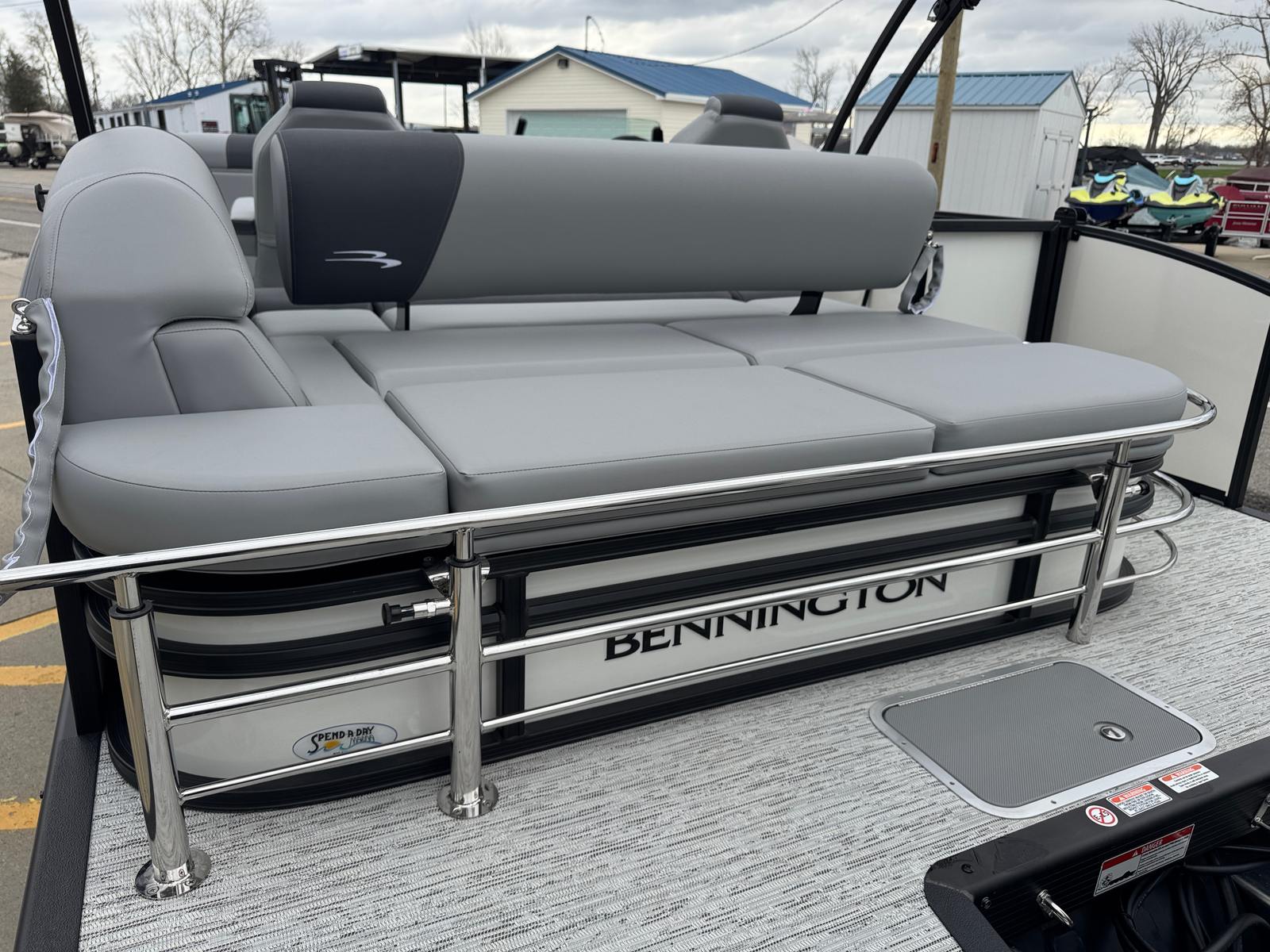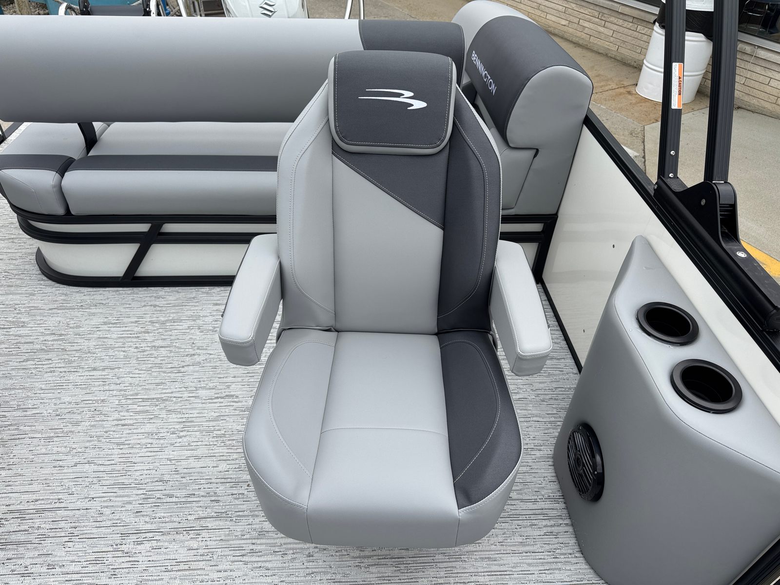The Bennington 21 SSB SPS is packed with special features designed to maximize convenience, safety, and enjoyment. The Water Fuel Separator Large and Water Fuel Separator Box work together to keep your engine running clean and efficiently, reducing maintenance and ensuring longevity. The single switch battery system offers straightforward power management, making it easy to operate and maintain your boat’s electrical systems. The blackout logos and smooth metallic white panels not only enhance the boat’s aesthetics but also reflect Bennington’s commitment to quality and style. The canvas in midnight black and shadow grey provides durable protection from the elements, while the ironwood dash accent adds a touch of elegance to the helm.