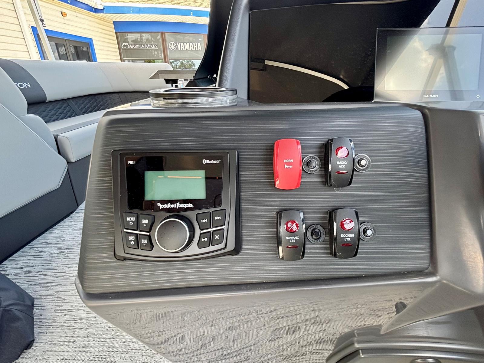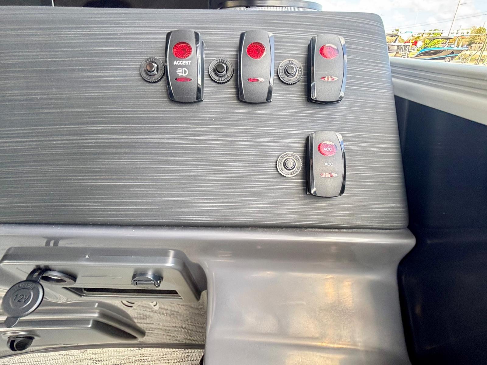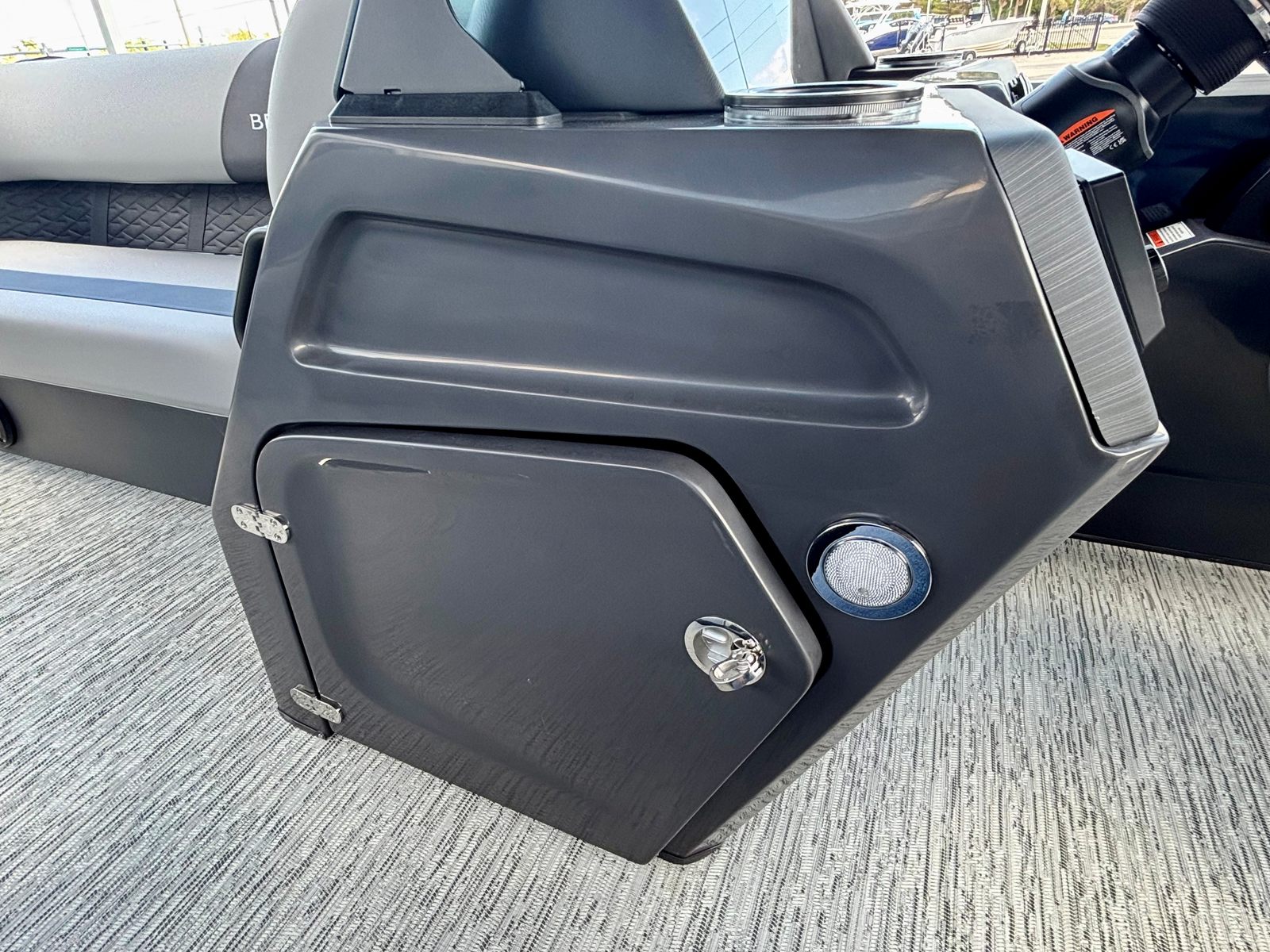 The Bennington 21 SSR SPS is loaded with special features designed to elevate your boating experience. The Sunshine Package brings a vibrant atmosphere to your deck, perfect for sunny days and lively gatherings. The Lillipad Ladder (top mount) provides easy access for swimmers and water enthusiasts, making it simple to get in and out of the water. The Ironwood Dash Accent adds a touch of sophistication to the helm, complementing the smooth metallic silver and shadow grey accents throughout the boat. The double bimini standard (16.5 feet) offers extensive shade, ensuring comfort during hot afternoons and providing shelter when needed. The Valencia grey upholstery delivers both style and durability, creating a welcoming environment for guests. The SPS Performance Package, with its 33-gallon transom direct fill, supports extended cruising and enhances overall performance.