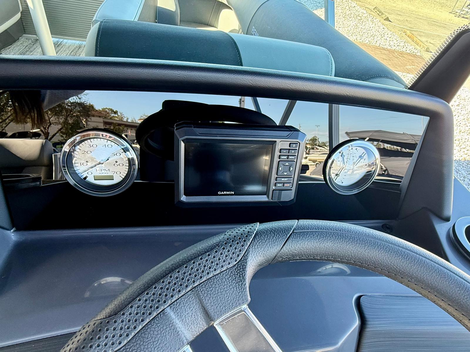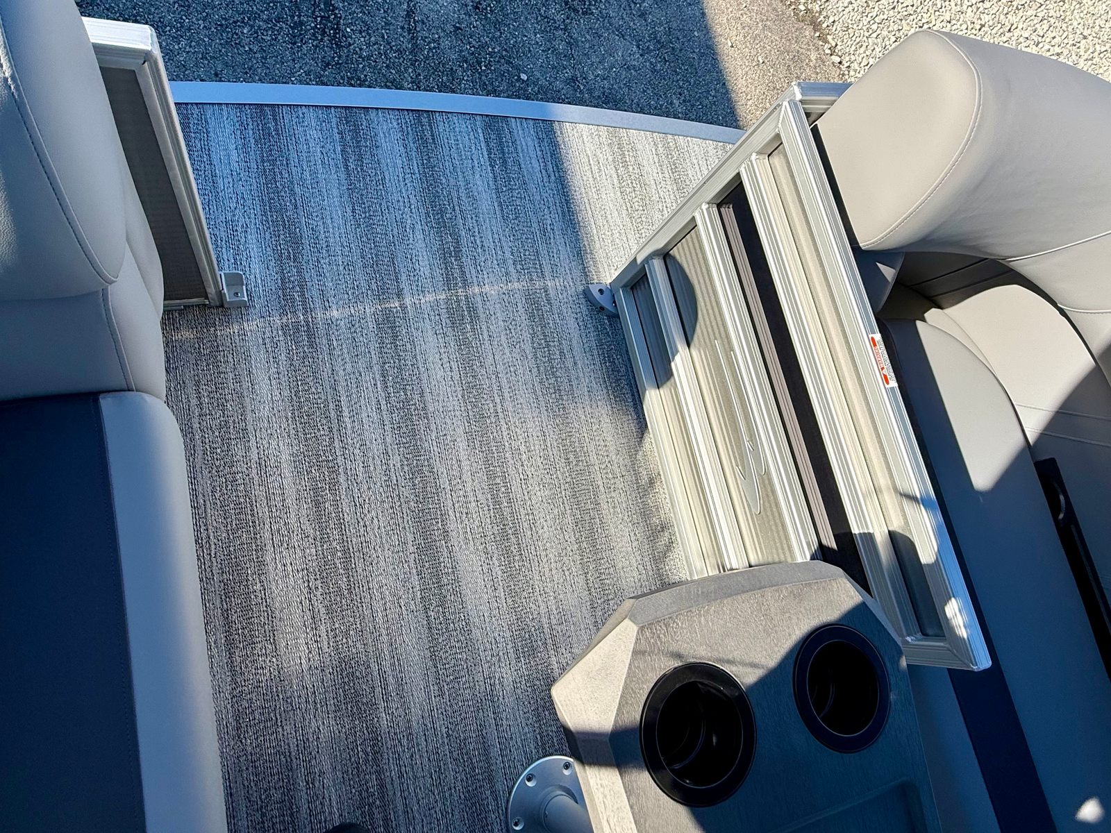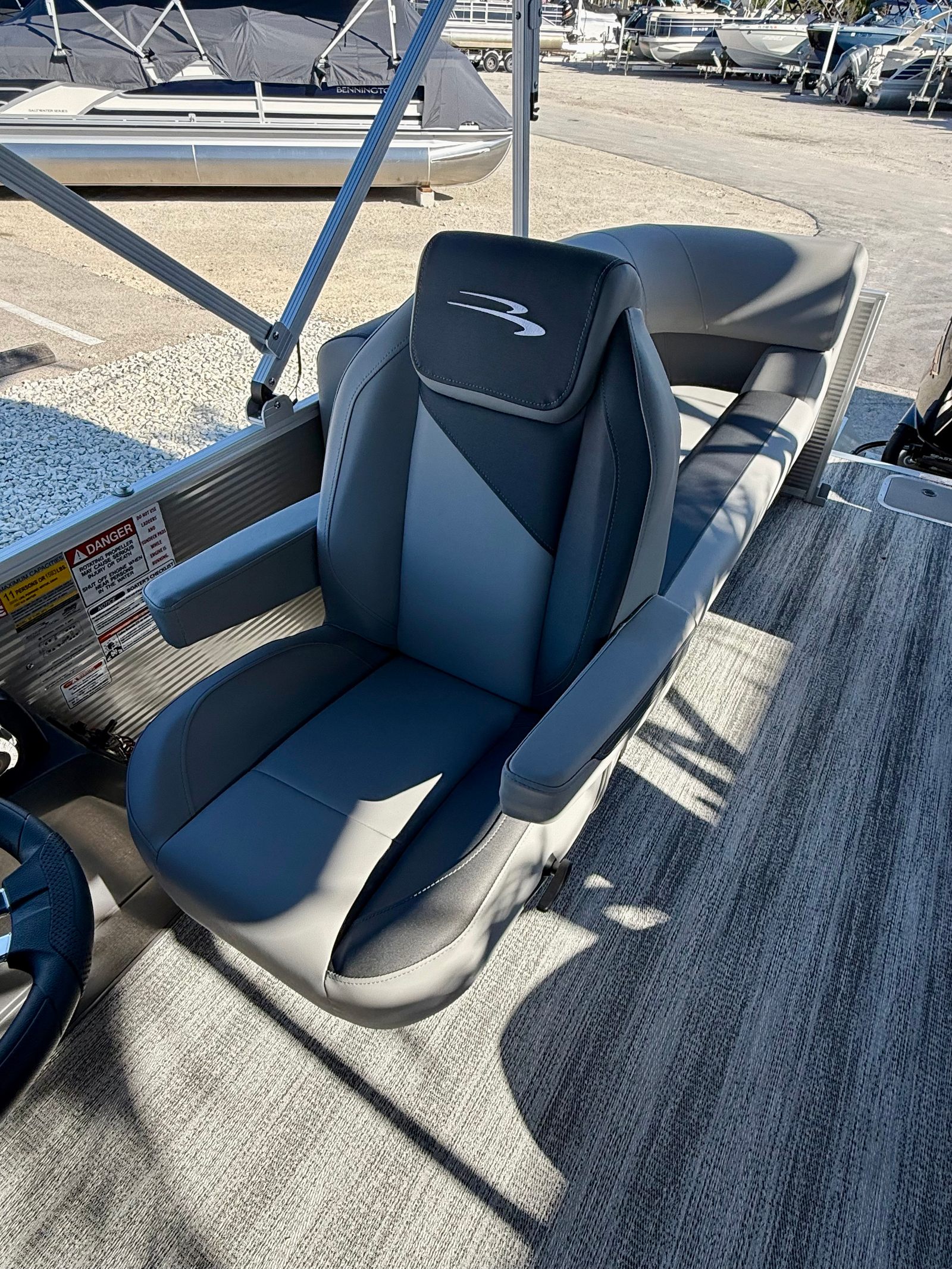The Bennington 21 SSR SPS is loaded with special features that enhance both its aesthetics and functionality. The Sunshine Package bathes the interior in natural light, creating a warm and inviting atmosphere for all your guests. The Serene Soft Touch Vinyl with Simtex Accents offers a plush, comfortable seating experience, while also being durable and easy to maintain. The panel in Metallic Silver, paired with the Canvas in Midnight Black and Shadow Grey, gives the boat a modern, sophisticated look that’s sure to turn heads at the marina.The Ironwood Dash Accent adds a touch of elegance to the helm, complementing the overall design. One of the standout features is the Double Bimini Standard (16.5'), which provides extensive shade and protection from the sun, ensuring comfort during long days on the water. The Shoreline Grey flooring is both stylish and practical, offering a non-slip surface that’s easy to clean and maintain.