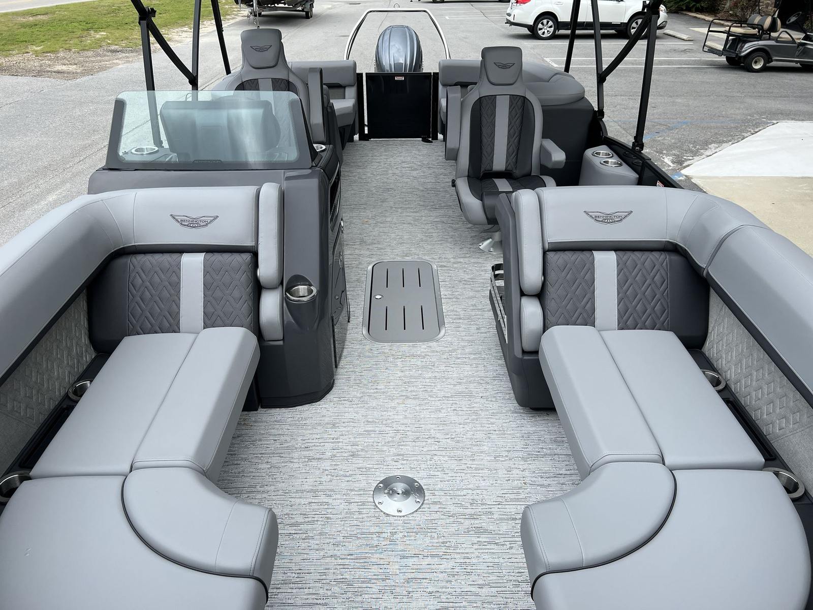 The 2026 Bennington 22 MFB SPS Pontoon stands out with its impressive length of 24.25 feet, offering ample space for relaxation, entertainment, and recreation. As a brand-new pontoon boat, it boasts the latest advancements in design and technology, ensuring you enjoy every moment on the water. The sleek exterior is enhanced by smooth metallic silver accents and Zebrawood Matte Slate finishes, creating a modern and sophisticated look that turns heads at any marina or lakeside gathering.