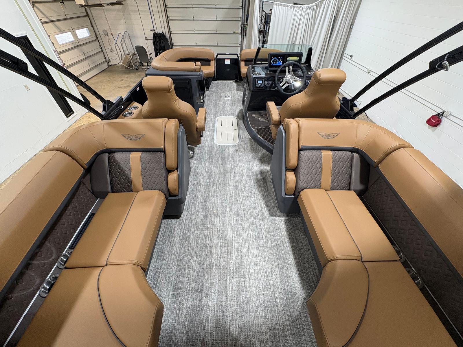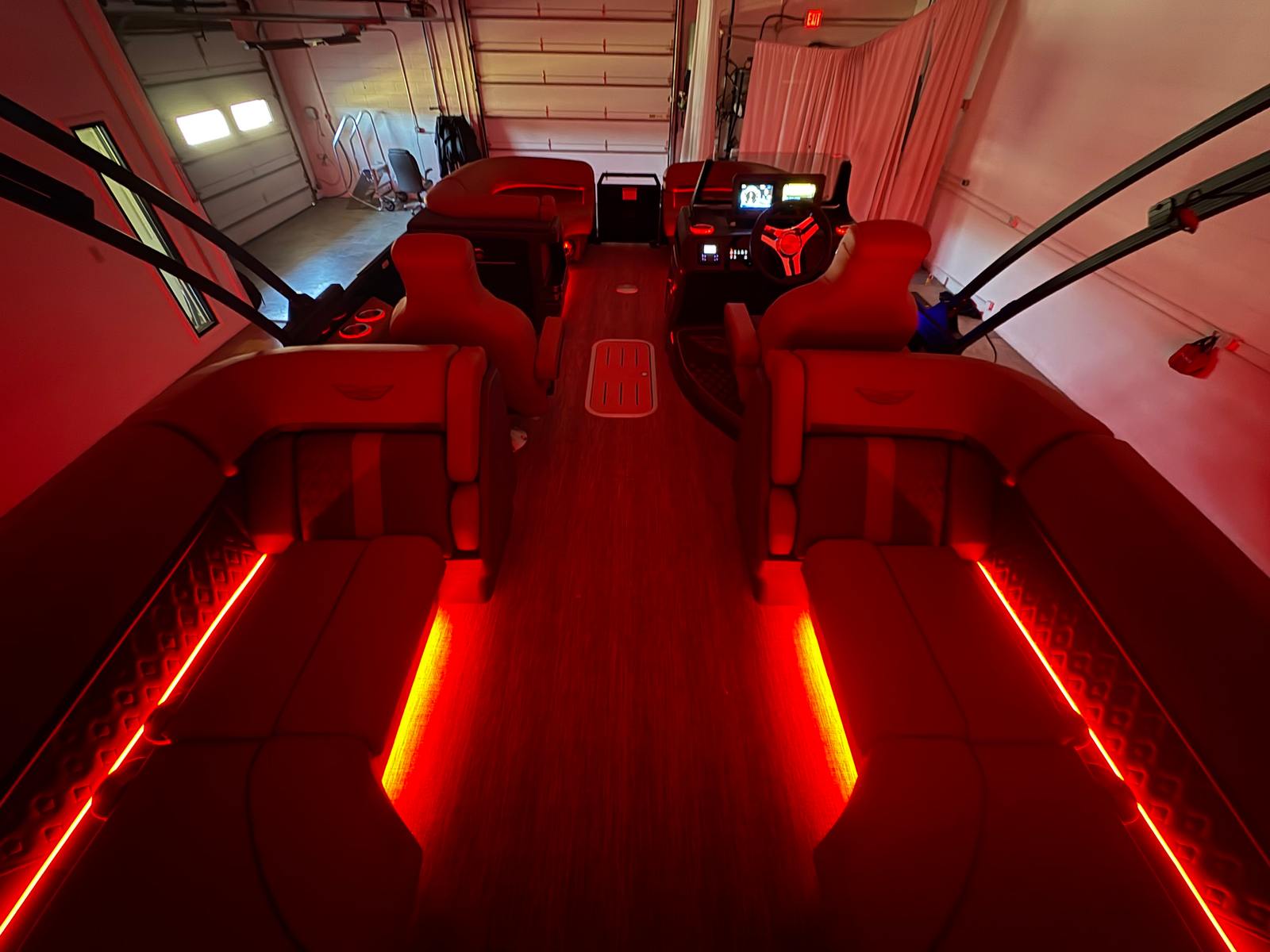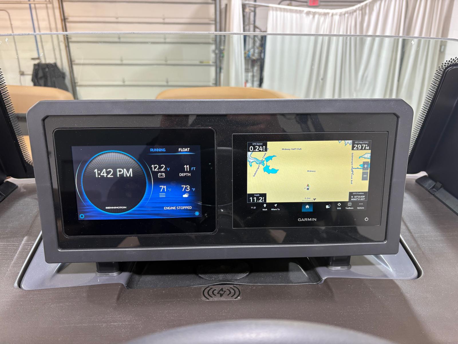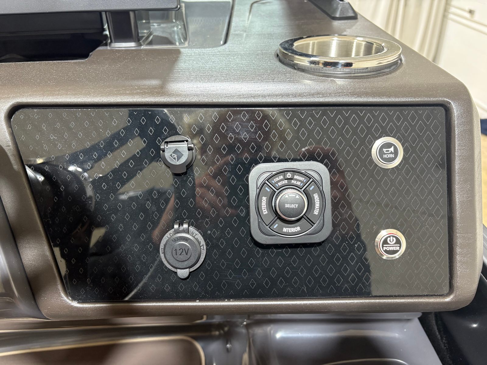 The Bennington 22 MFB SPS is loaded with premium features designed to enhance your time on the water. The RGB Control M Series lighting system allows you to set the perfect mood, with customizable colors that illuminate the deck and create a vibrant atmosphere for evening gatherings. Exterior side lighting and underwater lighting not only add to the boat’s striking appearance but also improve visibility and safety during nighttime excursions.For those who appreciate comfort and convenience, the Bimini - Electric Power Top Curved 12B S/M Blk offers effortless shade at the touch of a button, allowing you to relax in comfort no matter the weather. The toekick lights (1-37" and 3-41") provide subtle illumination along the deck, enhancing both safety and ambiance.Entertainment is taken to the next level with six Rockford Fosgate Ml Lighted Speakers, delivering crystal-clear sound throughout the boat. Whether you are hosting a lively party or enjoying a quiet afternoon, the audio experience is second to none. The twelve illuminated cupholders ensure that your favorite beverages are always within reach, even after the sun goes down. The elevated console Mythos provides a commanding view and intuitive control layout, making every journey smooth and enjoyable.