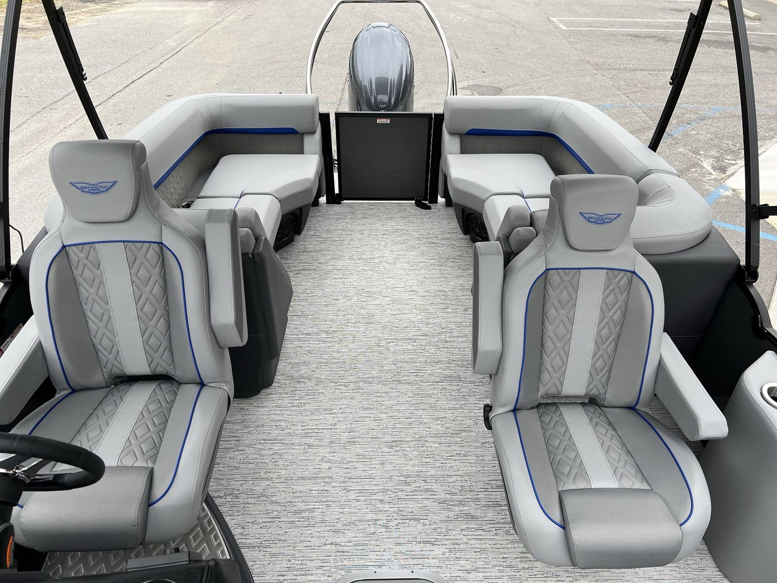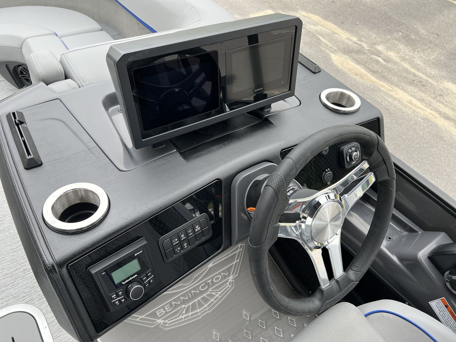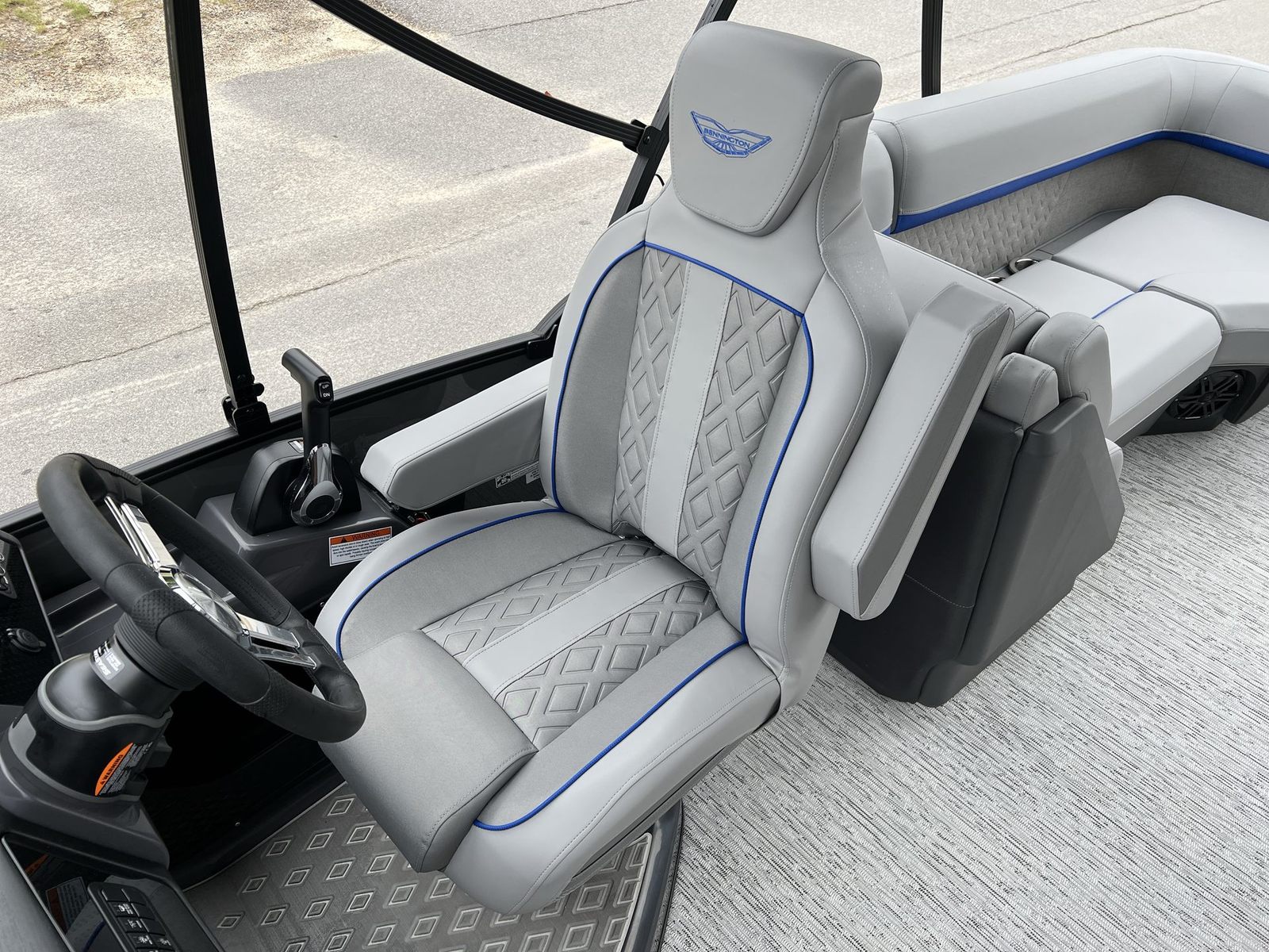 The Bennington 22 MFB SPS is loaded with special features that set it apart from other pontoon boats for sale. The RGB Control M Series allows you to customize the boat’s lighting to match your mood or the occasion, creating a vibrant and inviting atmosphere on board. The RGB Speakers and Rockford Fosgate M1 Lighted Speakers deliver high-quality sound, ensuring your favorite playlists sound incredible whether you are anchored or underway. Exterior Side Lighting and Toekick Lights (1-37", 3-41") add a touch of elegance and safety, illuminating the deck and making evening cruises both beautiful and secure.The Elevated Console with Pocket Mythos provides a commanding view and easy access to controls, while the Base Furniture M Series offers plush, comfortable seating for all passengers. The interior is finished with Zebrawood Matte Slate accents, adding a sophisticated and modern touch to the overall design. Every detail has been thoughtfully crafted to enhance your comfort and enjoyment on the water.