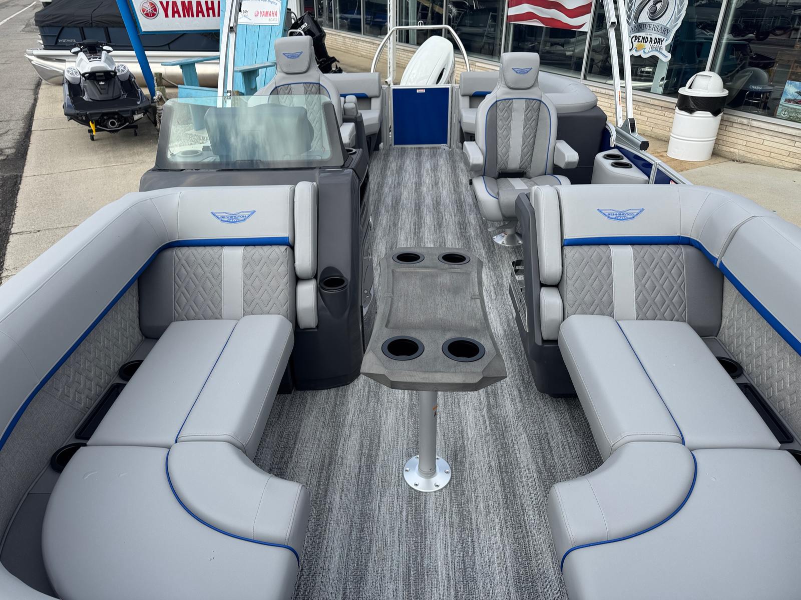 The 2026 Bennington 22 MFB SPS pontoon stands out with its impressive 24.25-foot length, offering ample space for relaxation and socializing. As a new Bennington boat for sale, this model showcases the brand’s commitment to craftsmanship, comfort, and cutting-edge design. The sleek exterior features a Smooth Metallic Luminous Blue panel with Smooth Metallic White accents, complemented by a sophisticated Shoreline Grey finish. Inside, the Luminous Blue Simtex interior accent adds a touch of elegance and modern flair, creating a welcoming atmosphere for every adventure.
