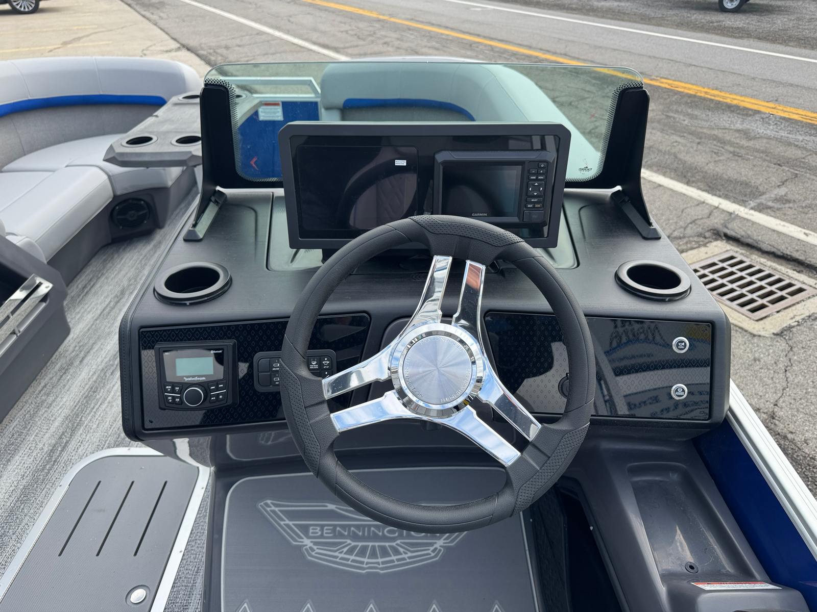 The Bennington 22 MFB SPS is loaded with special features that elevate your boating experience. The exterior’s Smooth Metallic Luminous Blue panel and Smooth Metallic White accent create a striking visual impression, while the Shoreline Grey finish adds a touch of sophistication. Inside, the Luminous Blue Simtex interior accent provides both comfort and style, making every seat the best in the house.This pontoon is equipped with a Removable Flag Pole with an American Flag, allowing you to showcase your patriotic spirit as you cruise the waterways. The Bimini - Electric Power Top Curved 12B S/M Slv offers convenient, push-button shade, ensuring you and your guests stay cool and comfortable even on the sunniest days. The Elevated Console with Pocket Mythos provides a commanding view and additional storage, keeping your essentials organized and within reach.