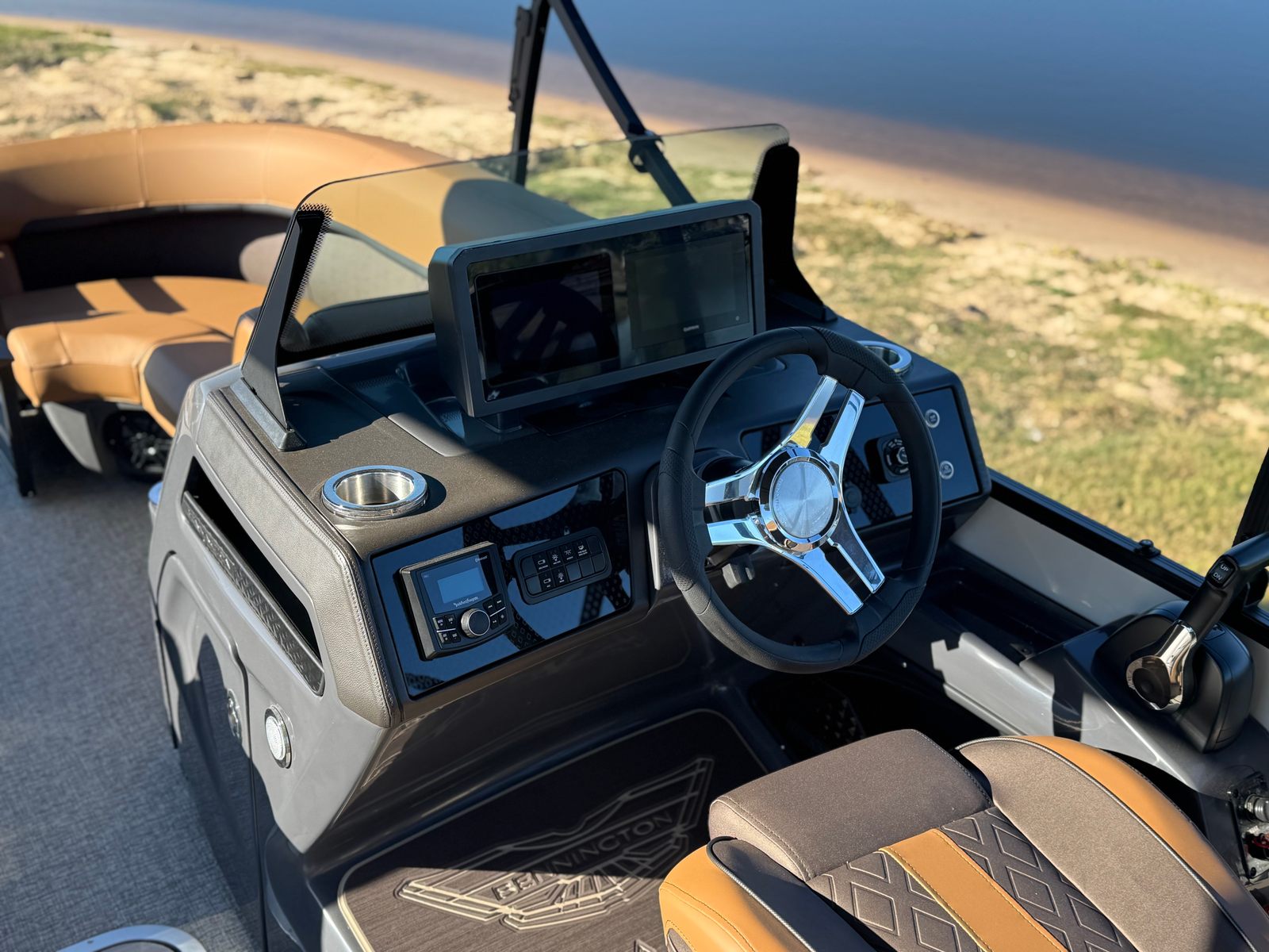 The Bennington 22 MSB SPS is loaded with features that elevate your boating experience to new heights. The dual battery switch with fuse ensures reliable power management, giving you peace of mind during extended outings. The RGB Control M Series lighting system, complemented by toekick lights and illuminated cupholders, creates a vibrant, customizable atmosphere for evening cruises or dockside gatherings. Rockford Fosgate M1 lighted speakers provide premium sound quality, turning your pontoon into a floating entertainment hub. The elevated console with pocket Mythos offers enhanced visibility and convenient storage, while the smooth metallic white paneling adds a touch of elegance to the boat’s overall aesthetic.