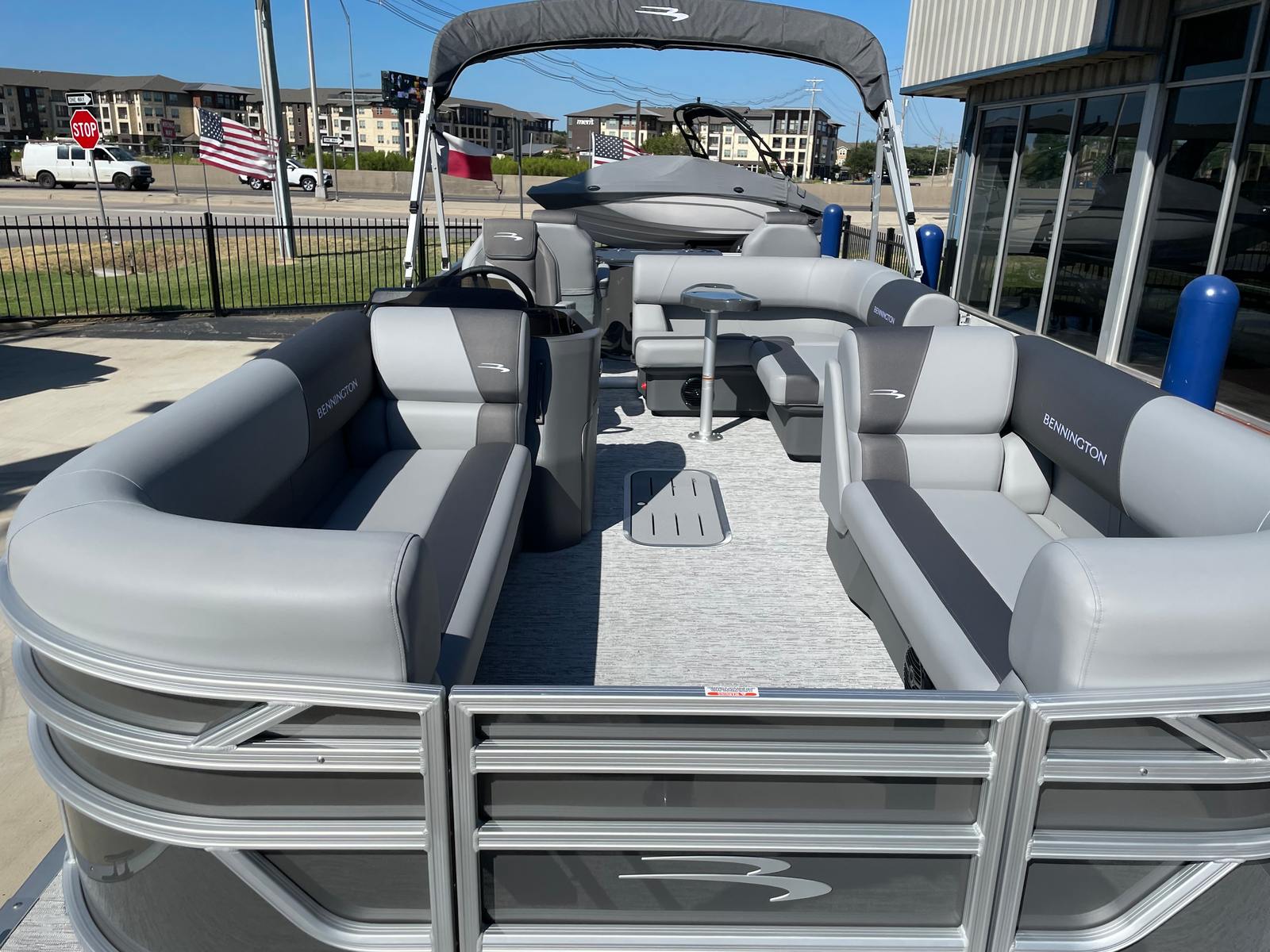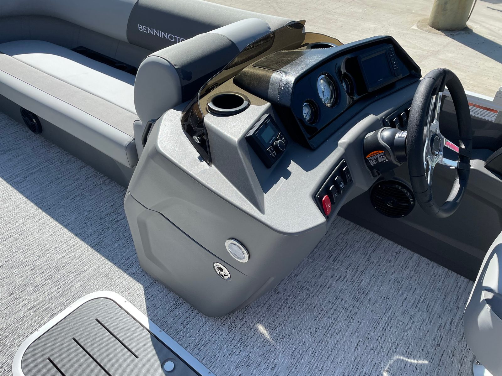 The 2026 Bennington 22 SS SPS stands out with its impressive length of nearly 23 feet, offering ample space for relaxation and recreation. As a new model, it showcases the latest advancements in pontoon design, ensuring you benefit from cutting-edge technology and modern aesthetics. The sleek Shadow Grey and Carbon color scheme, complemented by Ironwood dash accents, gives this Bennington boat for sale a sophisticated and contemporary look that will turn heads at any marina or lakeside dock.