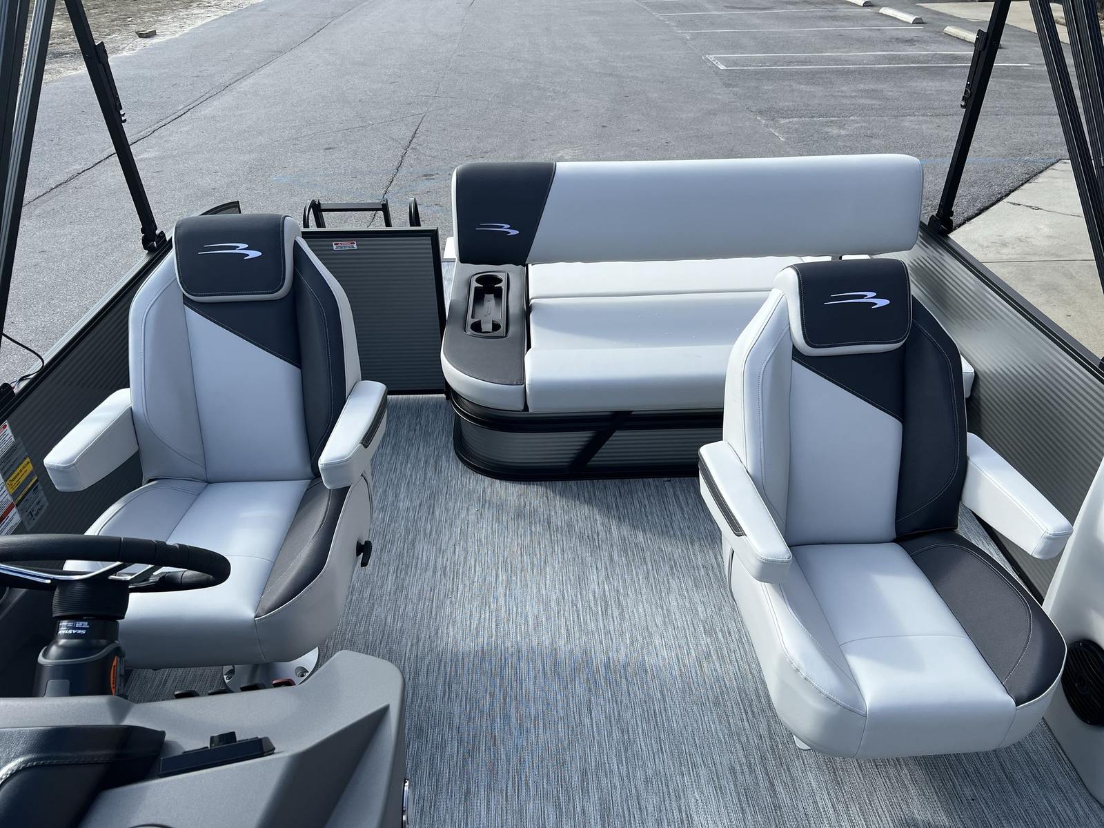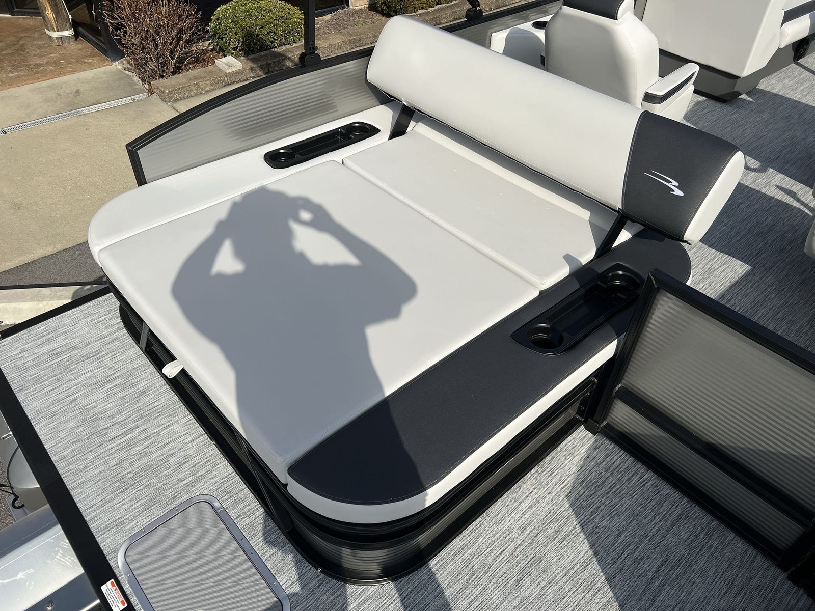 Step aboard and discover a host of special features designed to maximize comfort, convenience, and enjoyment. The analog rocker switching and Veethree gauges provide intuitive control and easy monitoring of your boat’s systems. Navigation is a breeze with the Garmin Echomap 52CV Chartplotter, ensuring you always know your location and can plan your route with confidence. The panel and canvas in Metallic Silver, paired with Leon Light Silver accents, create a sophisticated and modern aesthetic. Blackout logos and the Blackout Luxe Package add a touch of elegance and exclusivity, making this pontoon truly stand out on the water.