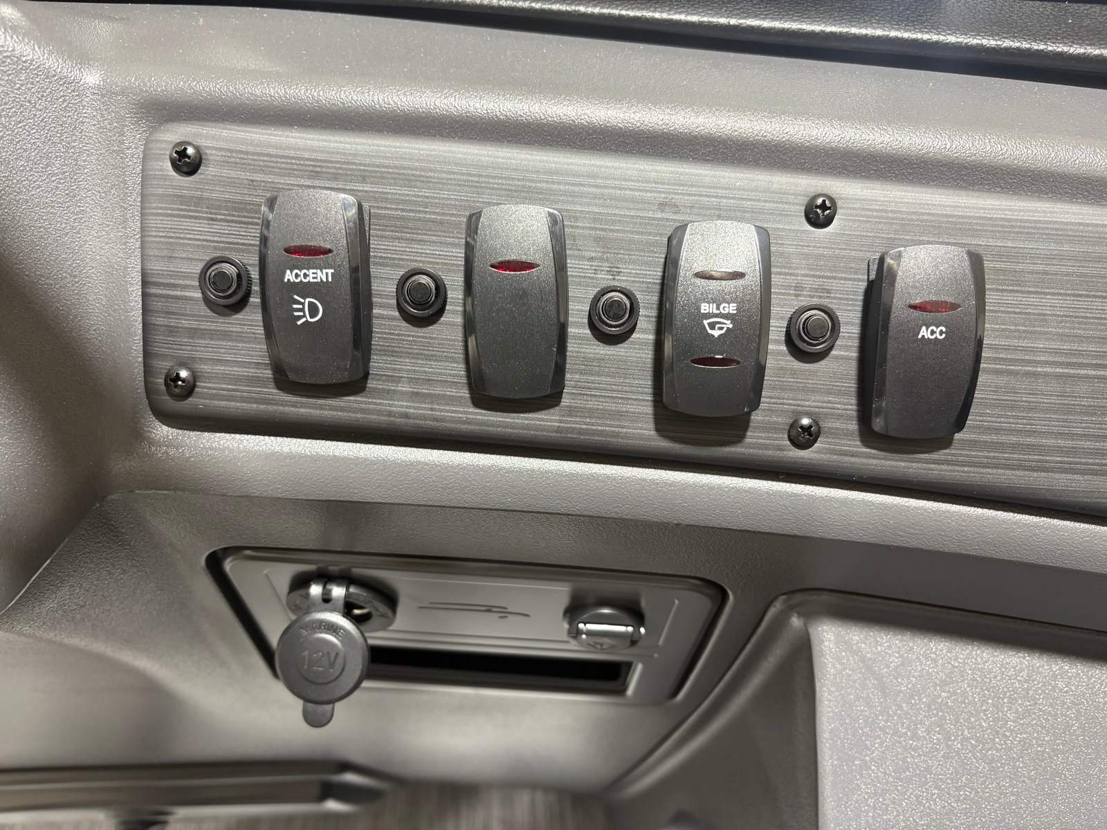 The Bennington 22 SSB SPS is loaded with premium features that elevate your boating experience. The Ironwood Dash Accent adds a touch of elegance to the helm, while the wireless charger (S) keeps your devices powered up throughout your adventures. The Blackout Luxe Package (S) and Blackout Logos create a bold, modern aesthetic, and the No Accent - Textured finish ensures a clean, sophisticated look. The ski tow bar - SPS (No Ext Aft Deck) is ideal for watersports enthusiasts, making it easy to tow skiers, wakeboarders, or inflatable tubes. The Bimini - 8.5x10 - Black provides generous shade, allowing you to relax comfortably even on the sunniest days. The black rub rail insert not only enhances the boat’s appearance but also offers added protection against bumps and scrapes.