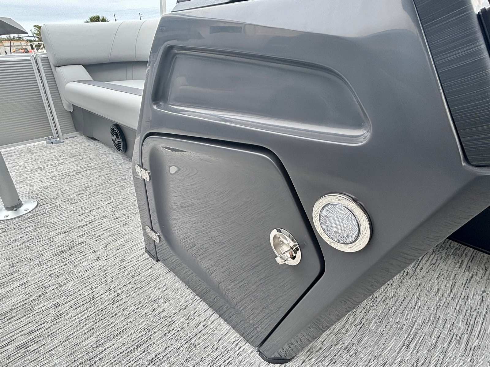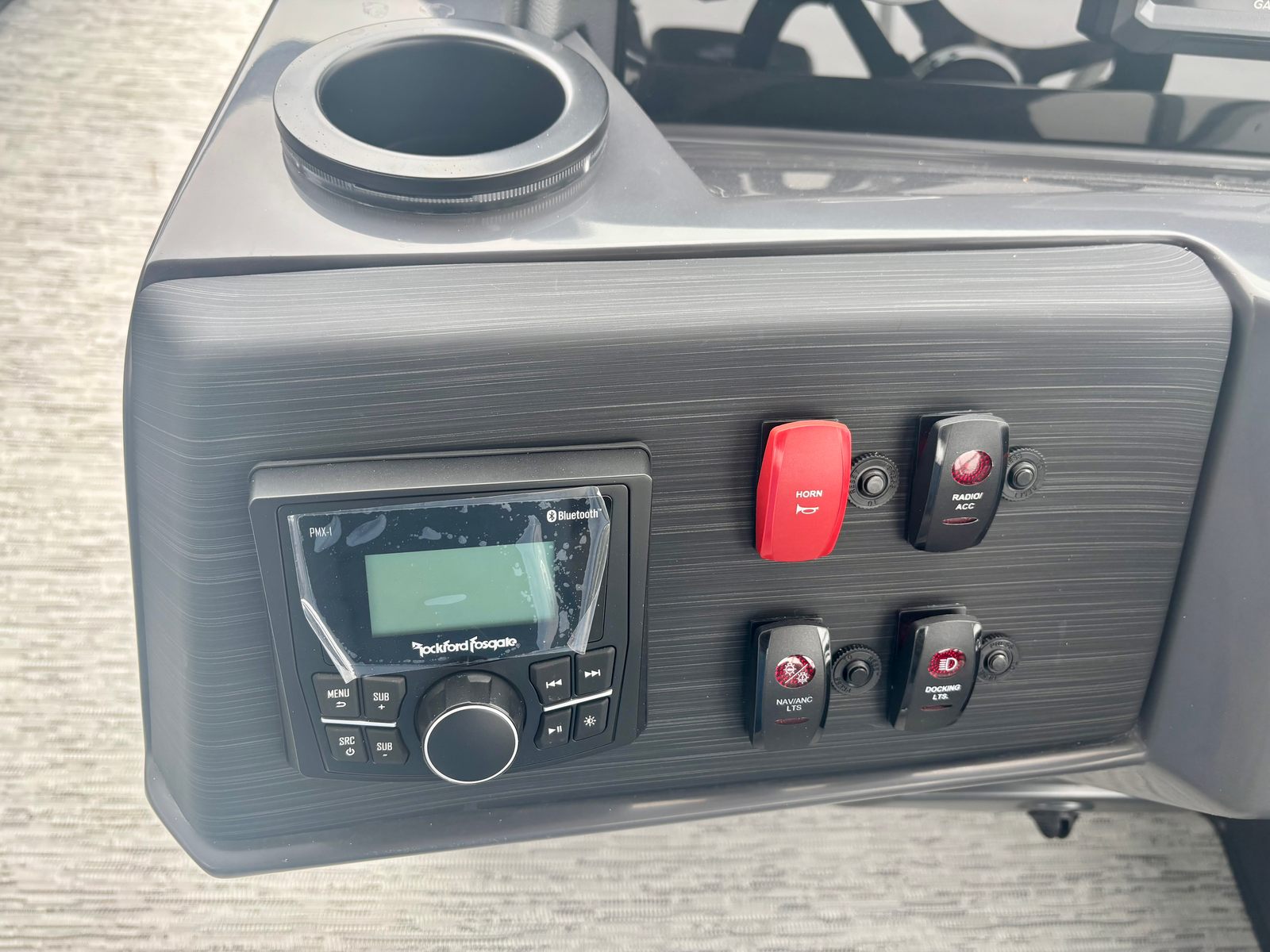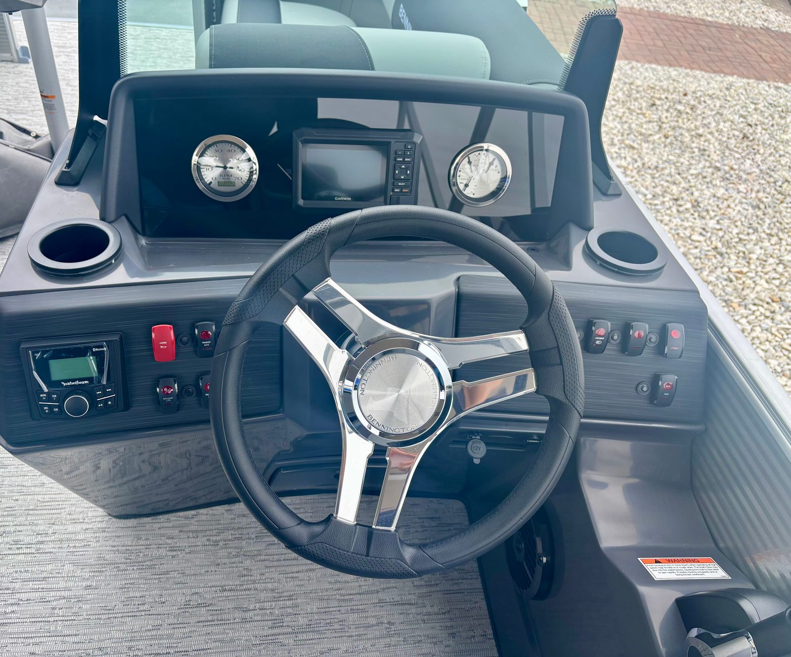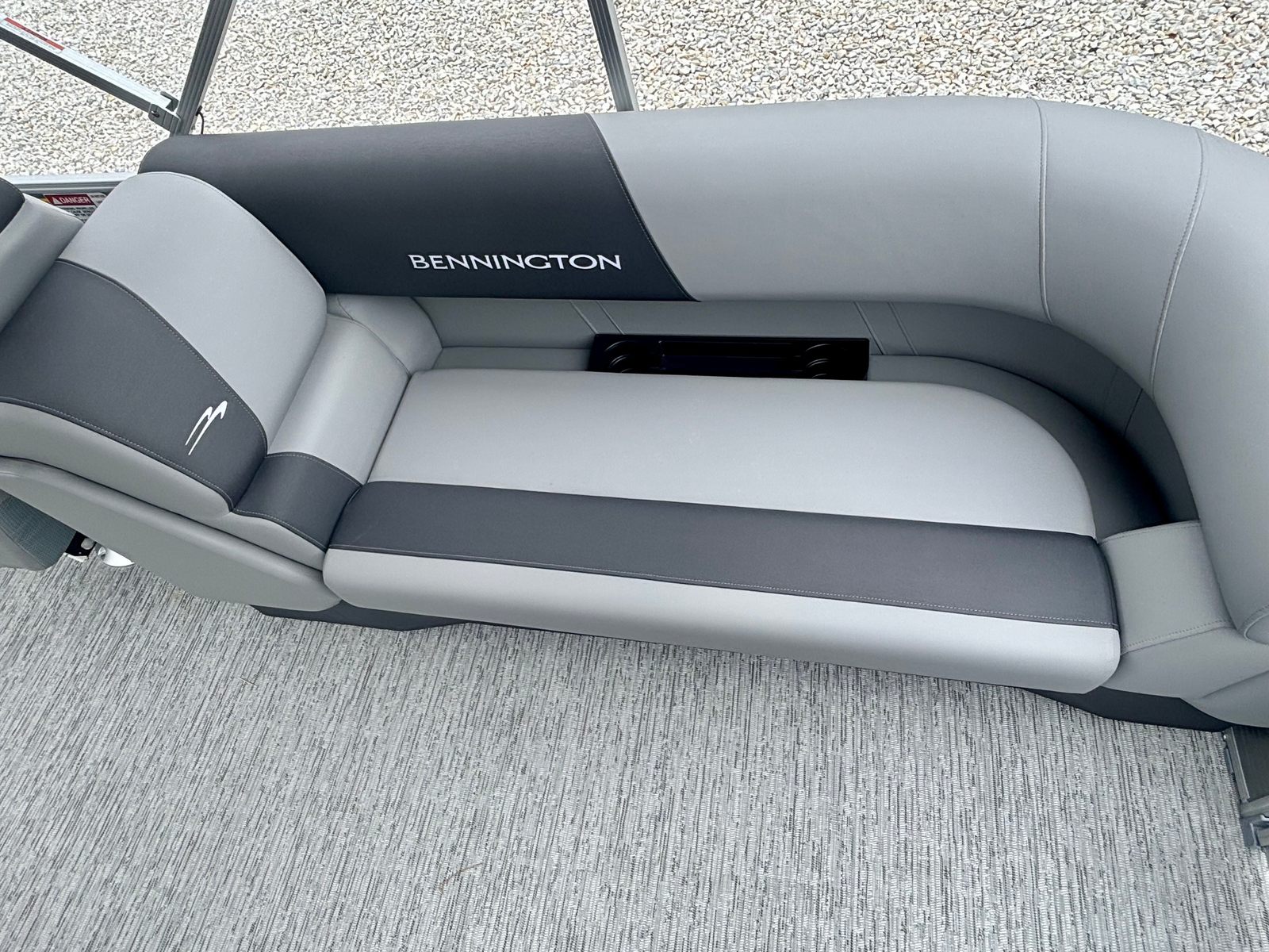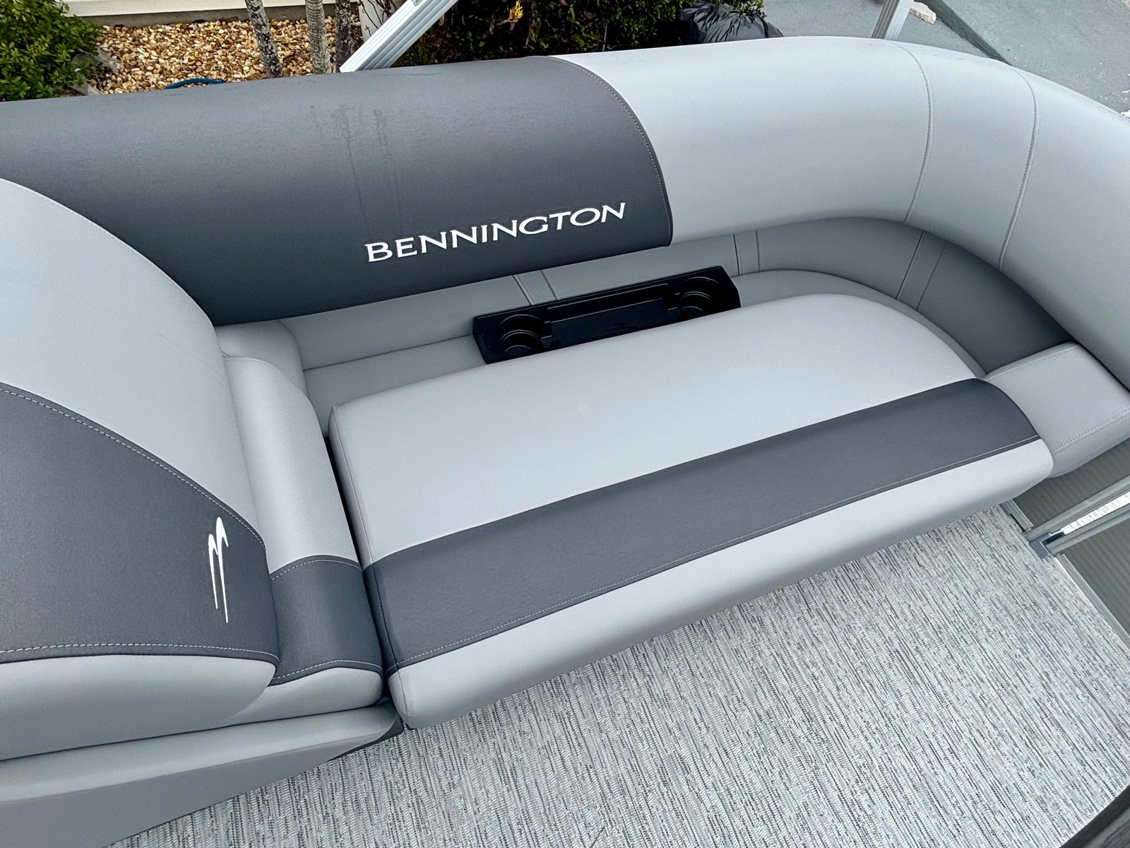 The Bennington 22 SSR SPS is loaded with premium features that set it apart from other pontoon boats for sale. The Serene Soft Touch Vinyl with Simtex Accents provides a luxurious and comfortable seating experience, ensuring that every passenger can relax in style. The Lillipad Ladder (Top Mount) offers easy access to and from the water, making swimming and water activities more enjoyable for everyone on board.For added convenience and privacy, the Chaise Privacy Station is a thoughtful addition, allowing guests to change or freshen up with ease. The upgraded Fiberglass Console not only enhances the boat’s visual appeal but also provides a user-friendly interface for navigation and control. The Captain’s Mid-Back Recliner ensures that the helm is as comfortable as it is functional, giving the captain a supportive seat for long days on the water.The Metal Jacket Tube Protectant (3 Tube) offers superior protection for the pontoon tubes, extending the life of your investment and maintaining the boat’s pristine appearance. Every detail, from the metallic silver canvas to the carefully selected color accents, reflects Bennington’s commitment to quality and craftsmanship.