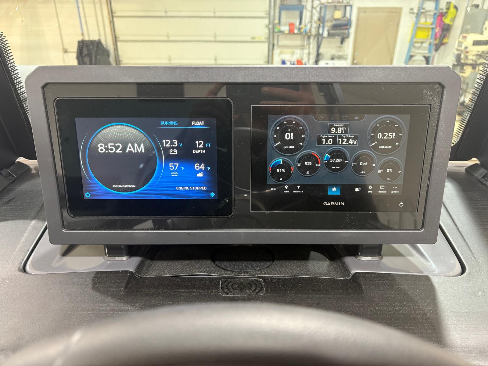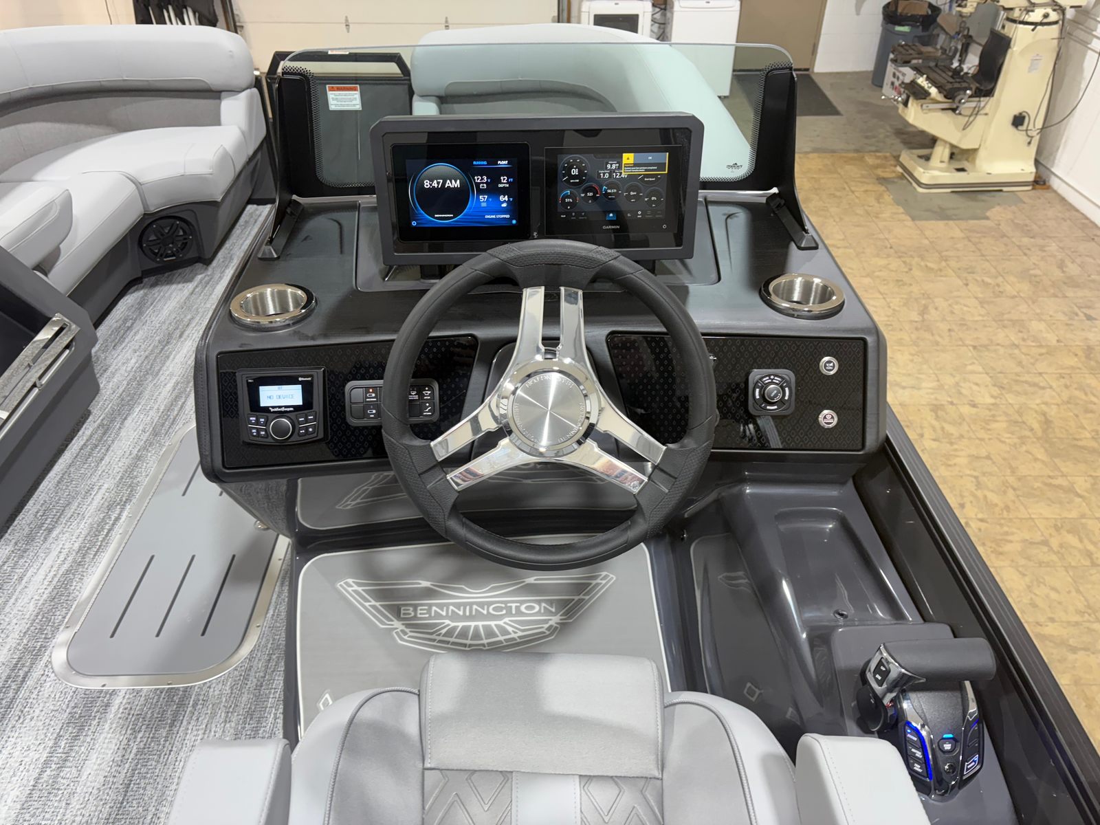 The Bennington 23 MFB ESP is loaded with premium features designed to enhance every aspect of your time on the water. The RBG Control M Series allows you to customize the ambiance with vibrant lighting options, while exterior side lighting and underwater lighting create a stunning visual effect during evening cruises. Toekick lights, including three 41-inch and one 72-inch fixtures, add a sophisticated glow to the deck, ensuring safety and style after sunset.For those who love music, the Rockford Fosgate M1 lighted speakers (six in total) deliver crystal-clear sound, turning your pontoon into a floating entertainment hub. With twelve illuminated cupholders, your favorite beverages are always within reach, and the elevated console Mythos provides a commanding view and intuitive control of all onboard systems.The Bimini - Electric Power Top Curved 12B S/M in sleek black offers effortless shade and protection from the sun, allowing you to relax in comfort no matter the weather. Every detail of this Bennington pontoon boat is designed to maximize enjoyment, convenience, and luxury.