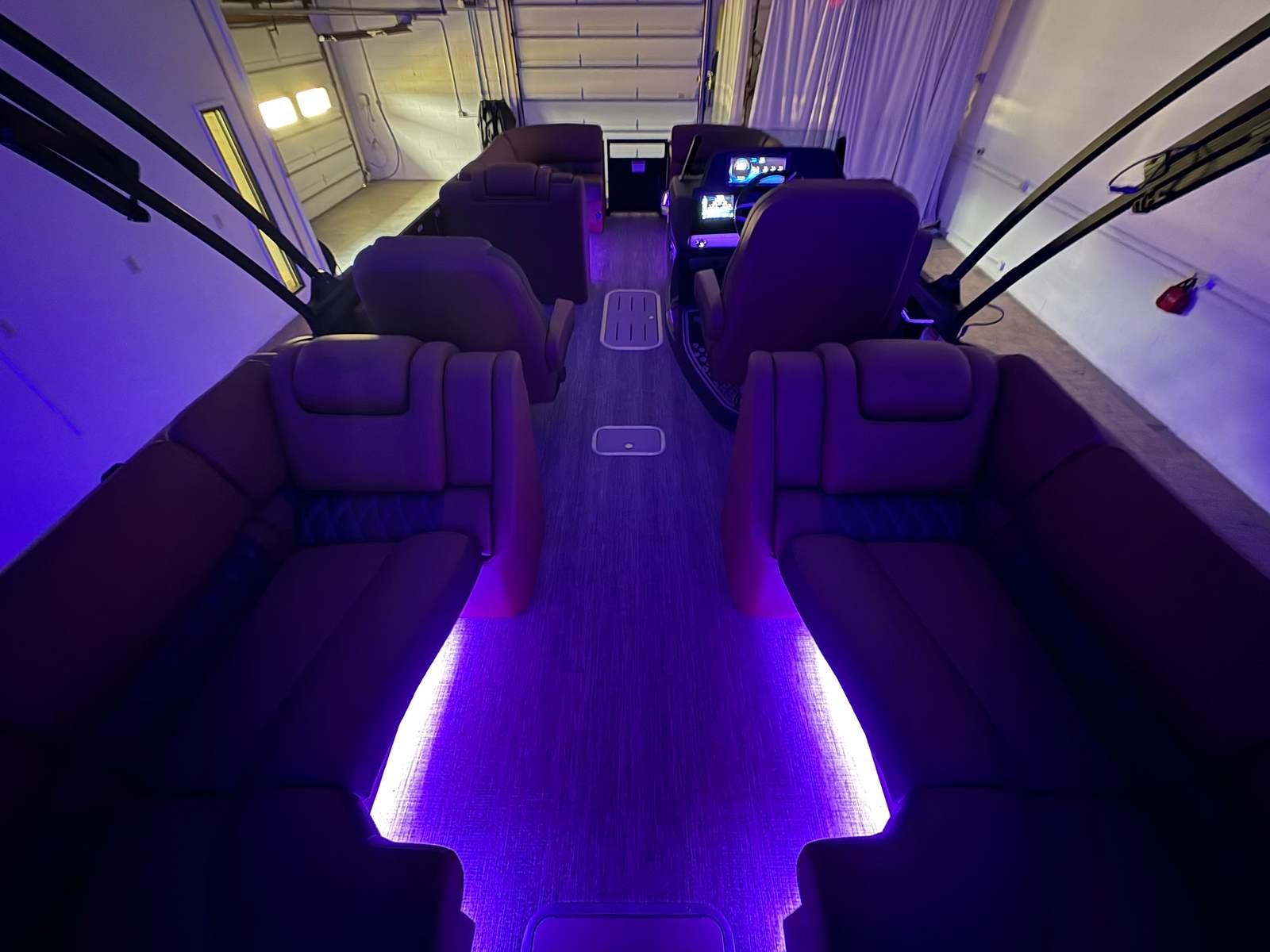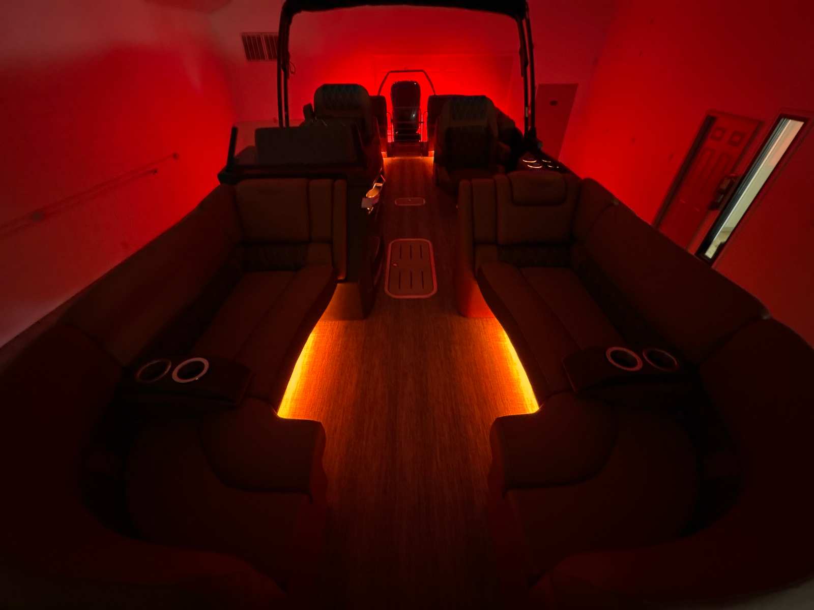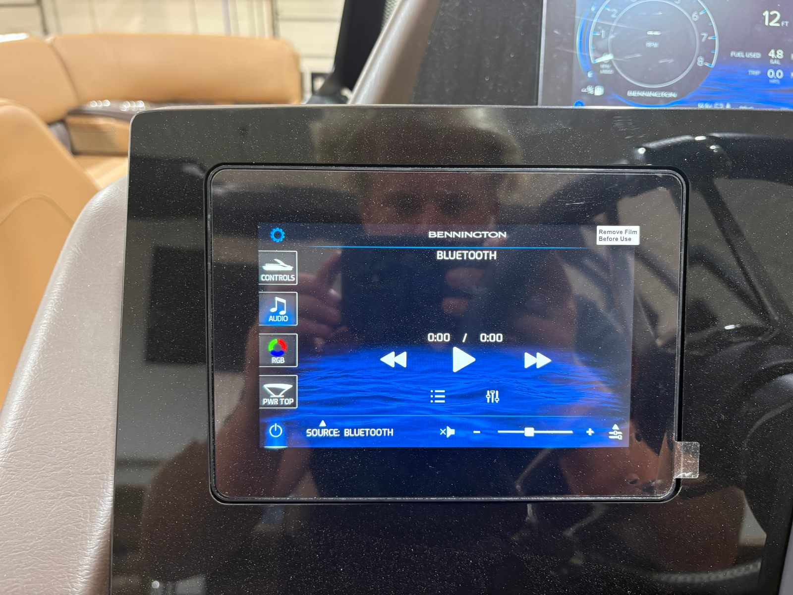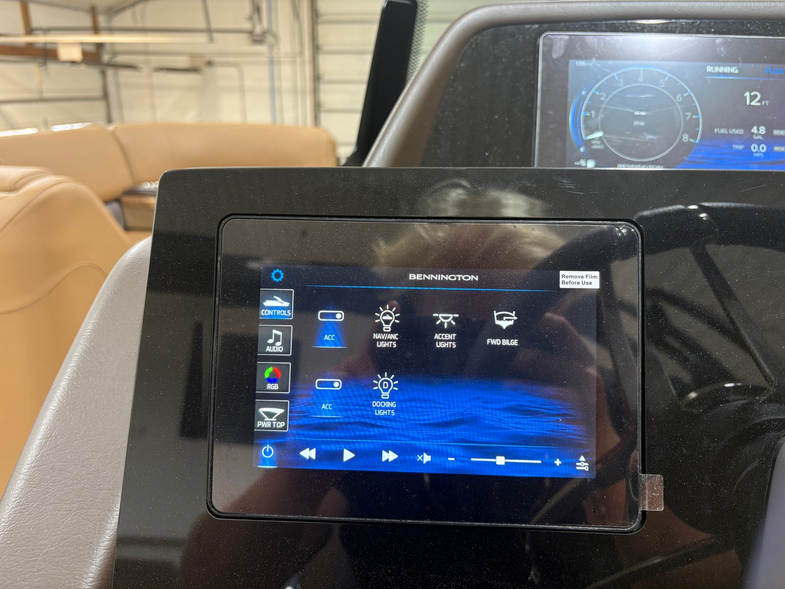 Step aboard the Bennington 23 RFB ESP and discover a world of premium features designed to enhance every moment on the water. Enjoy the ambiance created by illuminated cupholders (eight in total), exterior side lighting, underwater lighting, and toekick lights (2-37' and 2-62'), which add a touch of elegance and safety during evening cruises. The blackout logos and electric power top curved Bimini in sleek black not only provide shade but also elevate the boat’s modern aesthetic.Music lovers will appreciate the Rockford Fosgate audio system, featuring four 6.5" M2 speakers, two 8" M2 speakers (Fastback), a 10" M2 subwoofer, and a dual PM Punch amplifier upgrade. Whether you’re hosting a party or relaxing with a good book, the sound quality is sure to impress. The interior is adorned with Zebrawood Matte Beige accents, creating a sophisticated and inviting atmosphere for you and your guests.