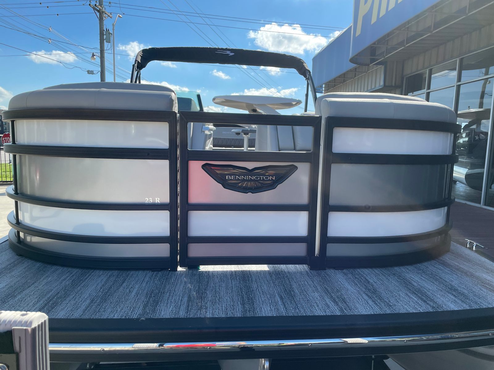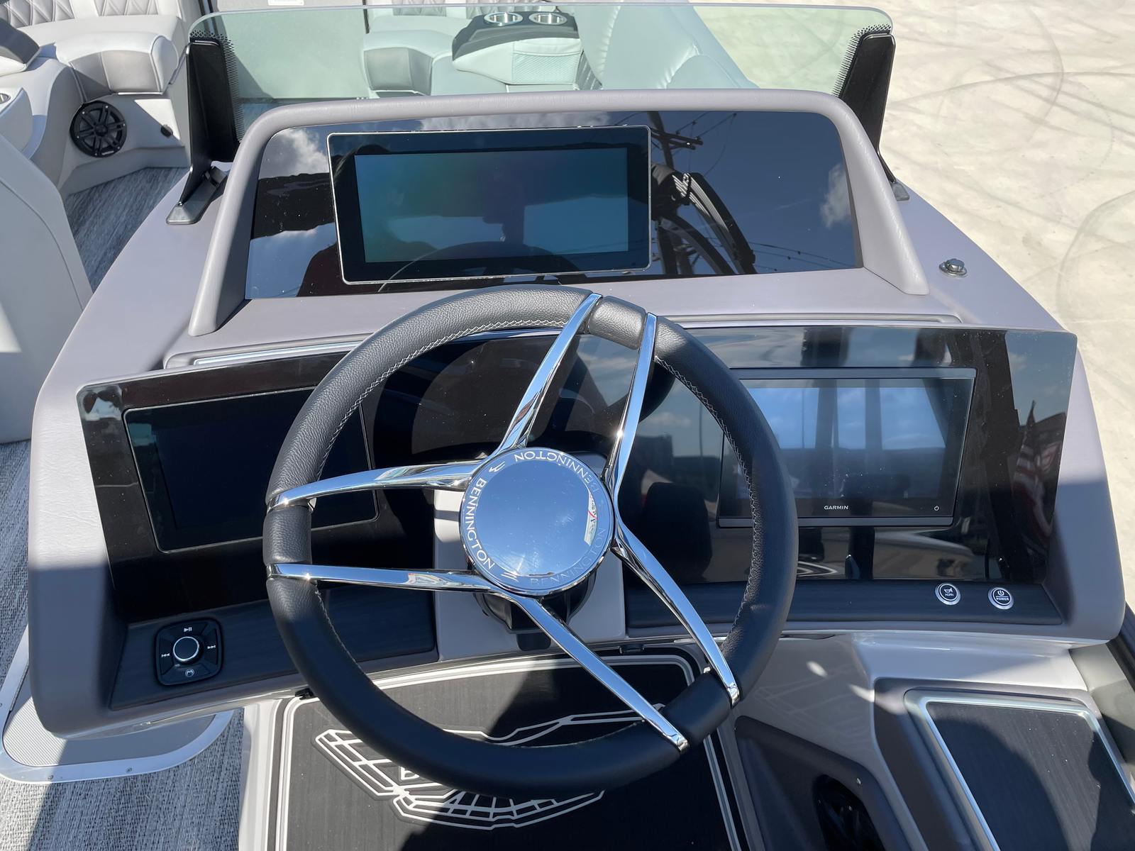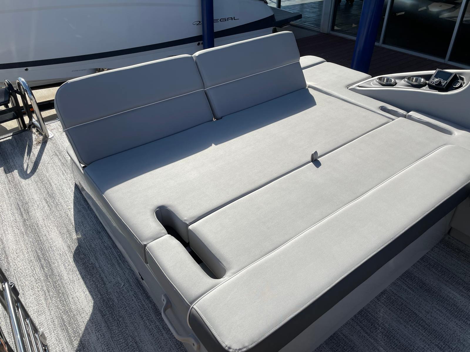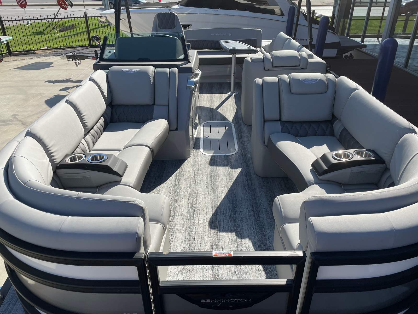 Step aboard the Bennington 23 RSB SPS and immerse yourself in a world of luxury and innovation. The illuminated cupholders add a touch of elegance and convenience, ensuring your favorite beverages are always within reach, even during evening cruises. Toekick lights in multiple lengths (2-41", 1-62", 2-72") create a captivating ambiance, enhancing both safety and style as you move about the deck after sunset.The boat’s aesthetic appeal is further elevated by blackout logos and a sophisticated interior accent featuring perforated metallic carbon. The Embroidery Package in Arctic Ice White exudes modern elegance, while the Zebrawood Matte Slate trim and smooth silver panels provide a refined, contemporary look. The midnight black canvas offers both protection and a striking visual contrast, rounding out the boat’s premium appearance.