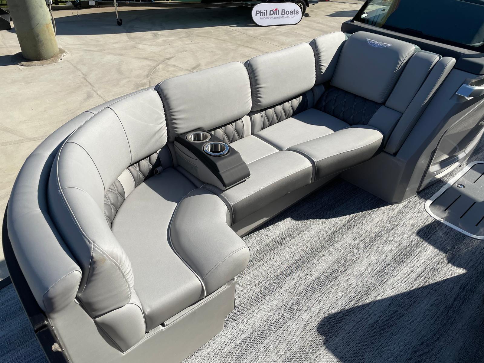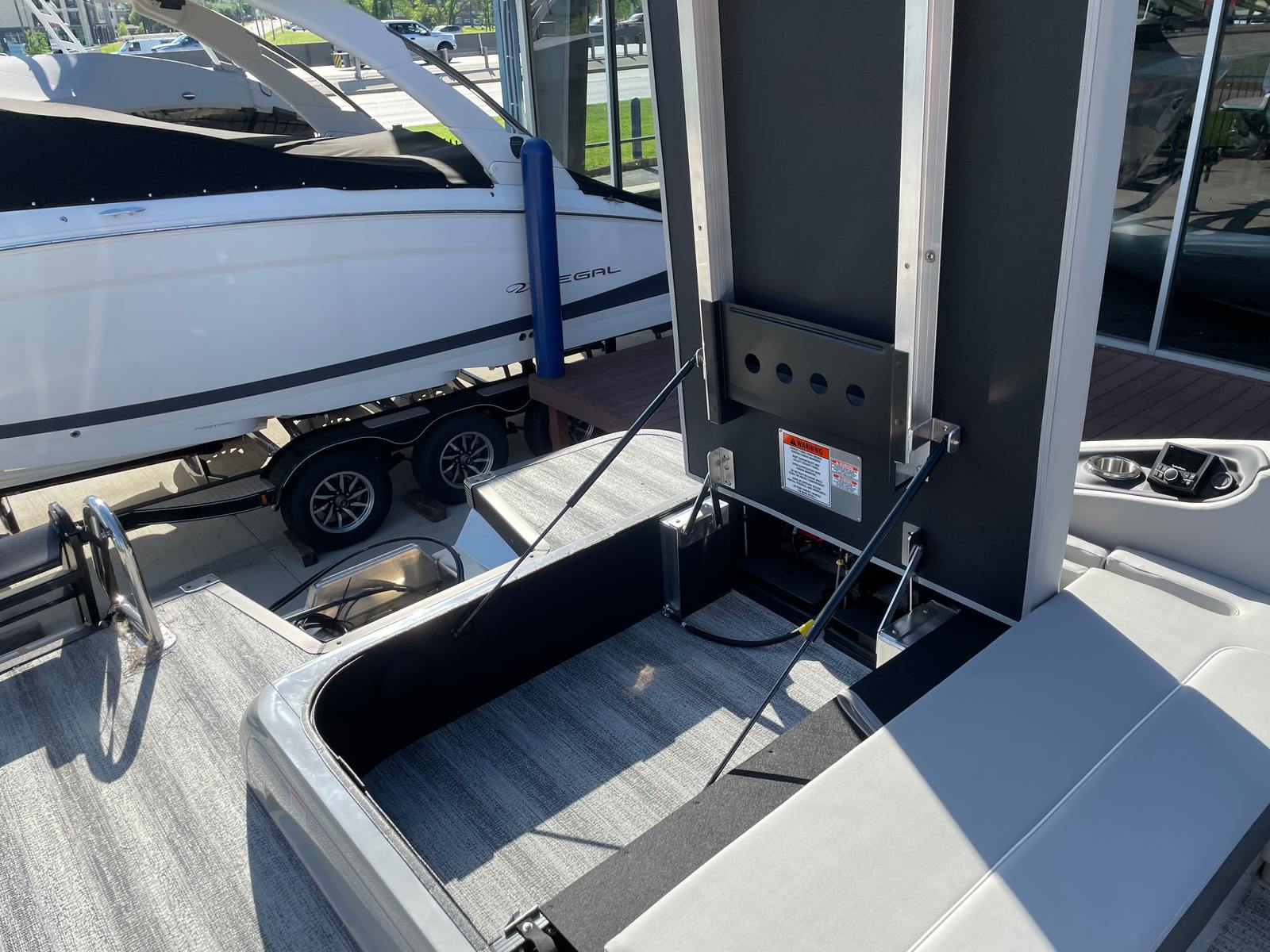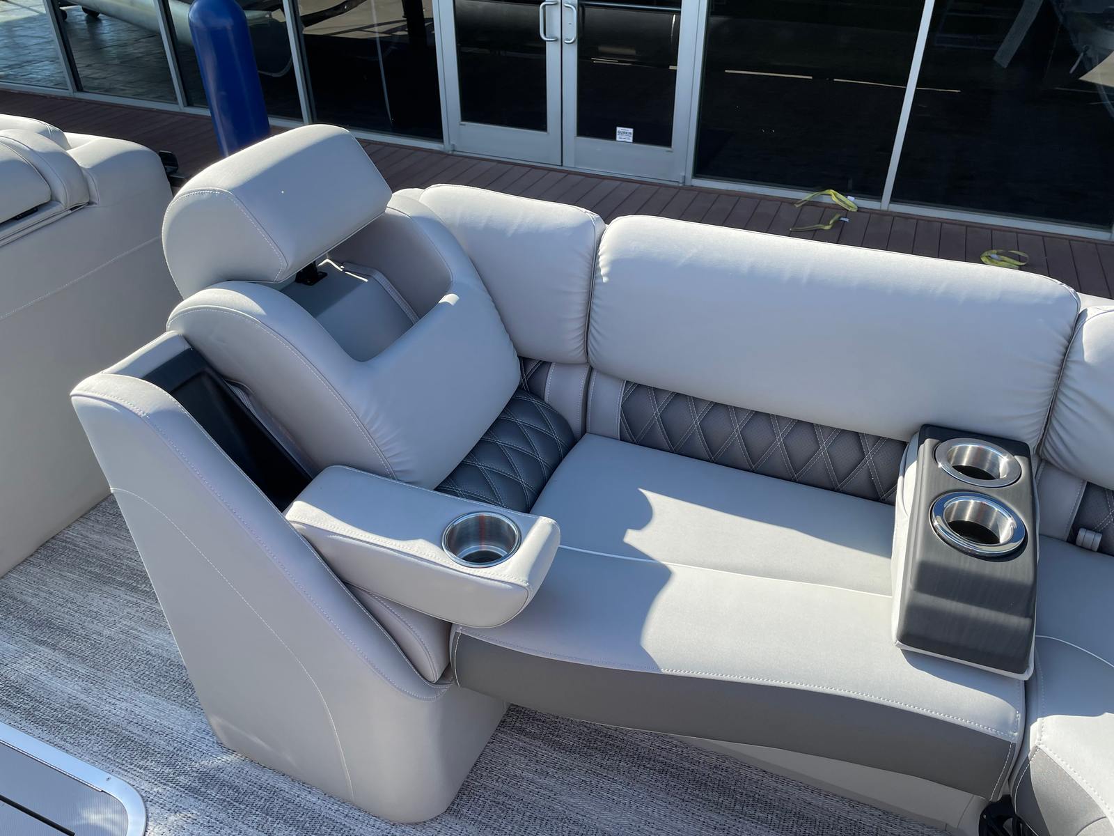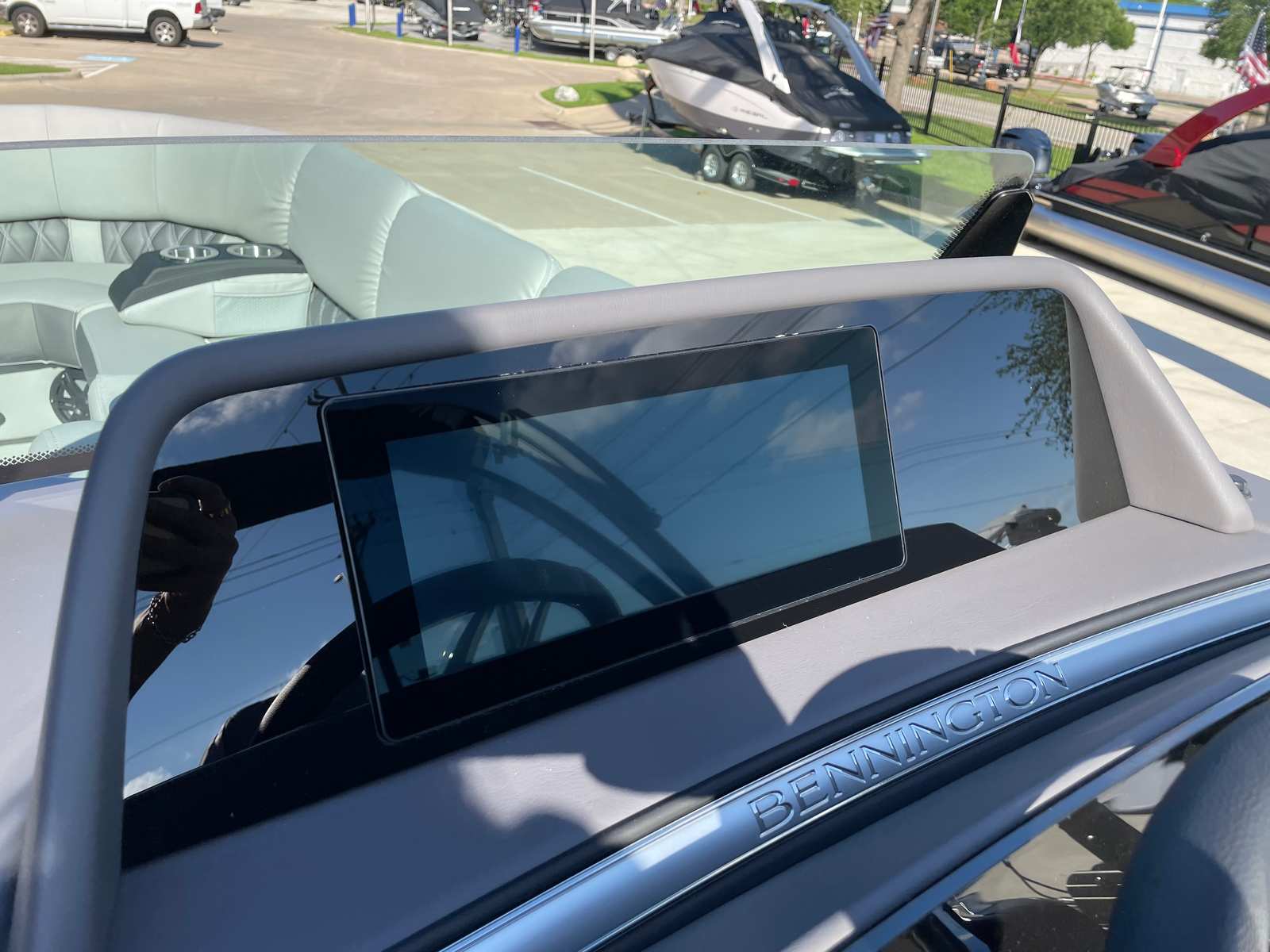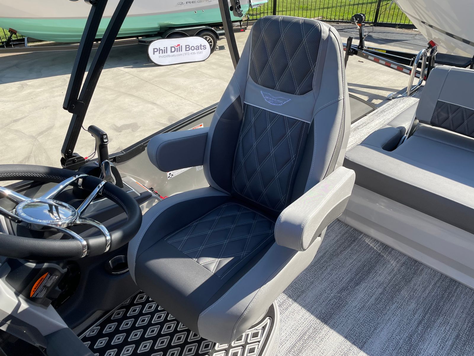 Step aboard the Bennington 23 RSB SPS and immerse yourself in a world of luxury and innovation. The illuminated cupholders add a touch of elegance and convenience, ensuring your favorite beverages are always within reach, even during evening cruises. Toekick lights in multiple lengths (2-41", 1-62", 2-72") create a captivating ambiance, enhancing both safety and style as you move about the deck after sunset.The boat’s aesthetic appeal is further elevated by blackout logos and a sophisticated interior accent featuring perforated metallic carbon. The Embroidery Package in Arctic Ice White exudes modern elegance, while the Zebrawood Matte Slate trim and smooth silver panels provide a refined, contemporary look. The midnight black canvas offers both protection and a striking visual contrast, rounding out the boat’s premium appearance.
