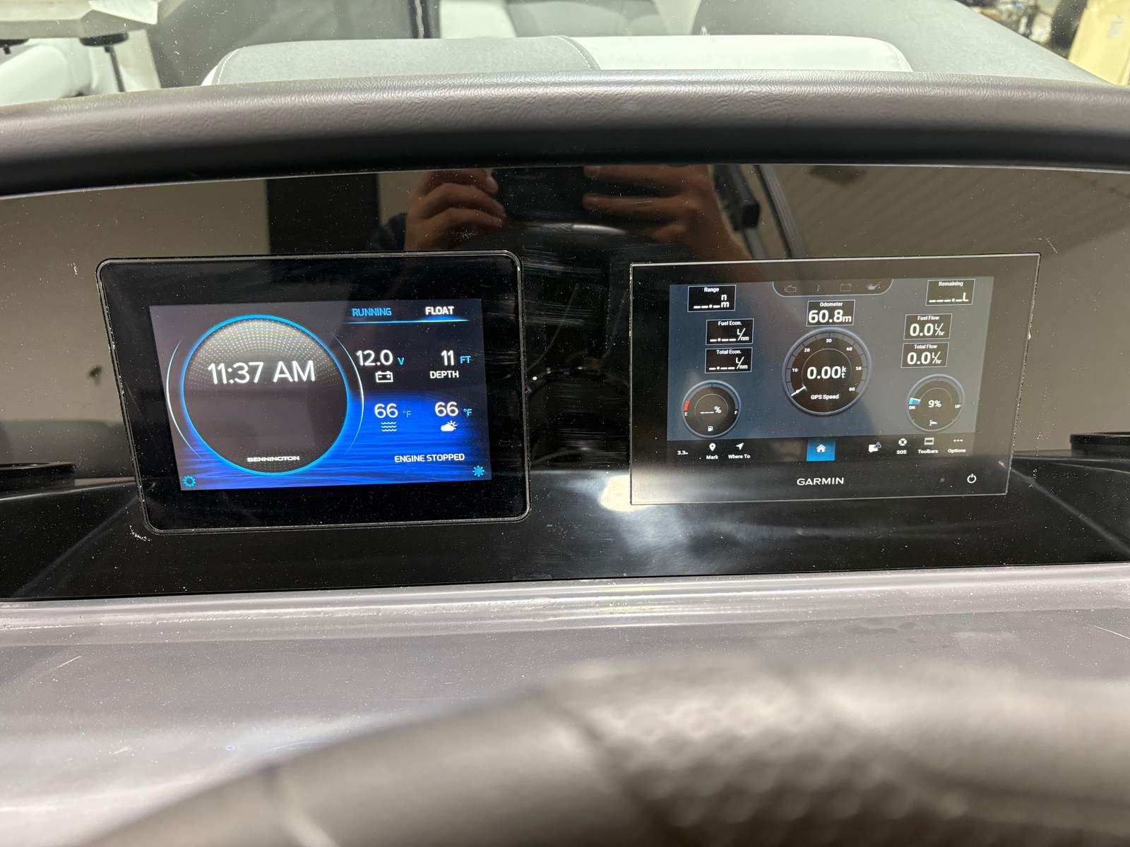 The Bennington 23 SSR SPS is packed with premium features that elevate your boating experience. The electric power top curved Bimini in black offers convenient shade and protection from the sun, allowing you to enjoy long afternoons on the water in comfort. The Serene Soft Touch Vinyl with Simtex accents creates a plush, inviting seating environment, while the Ironwood dash accent adds a touch of elegance to the helm. The Blackout Luxe Package (S) and blackout logos contribute to the boat’s striking visual appeal, ensuring it stands out in any marina.The Midnight Black canvas and Shadow Gray details not only enhance the boat’s aesthetics but also provide durability and resistance to the elements. The dual switch battery system with fuse ensures reliable power management, so you can focus on enjoying your time on the water without worry. Every detail of this pontoon boat has been thoughtfully designed to maximize comfort, style, and functionality.