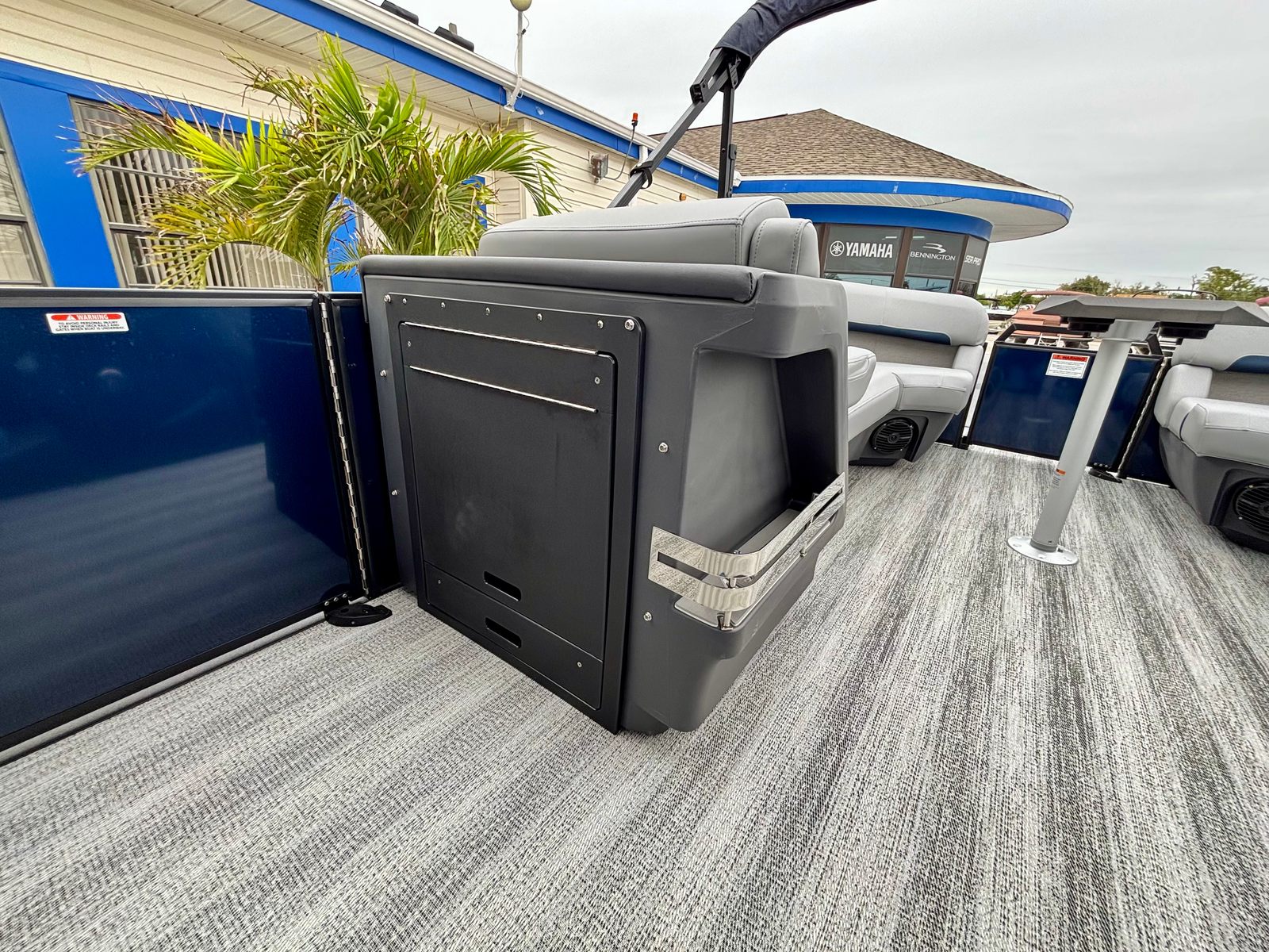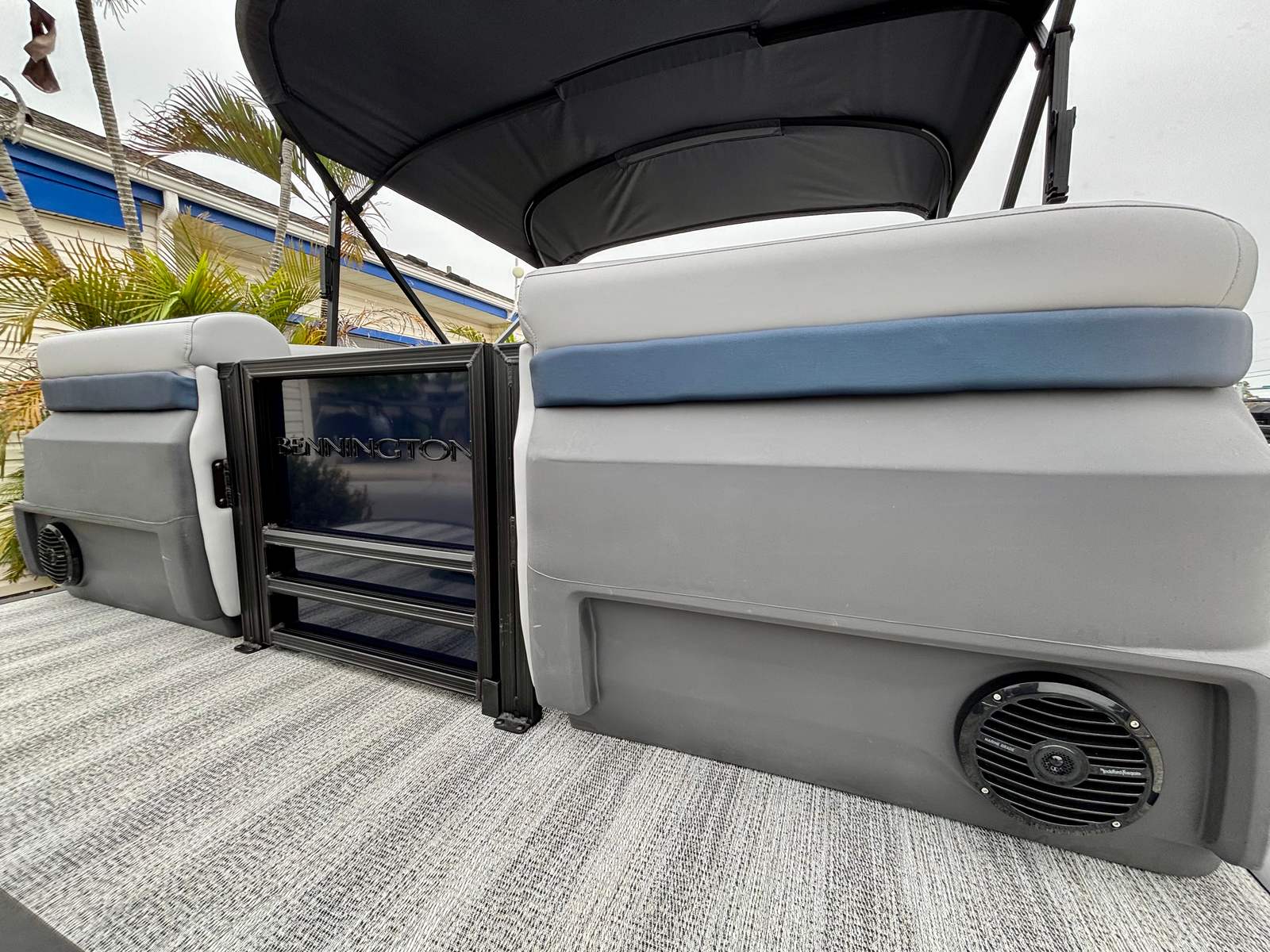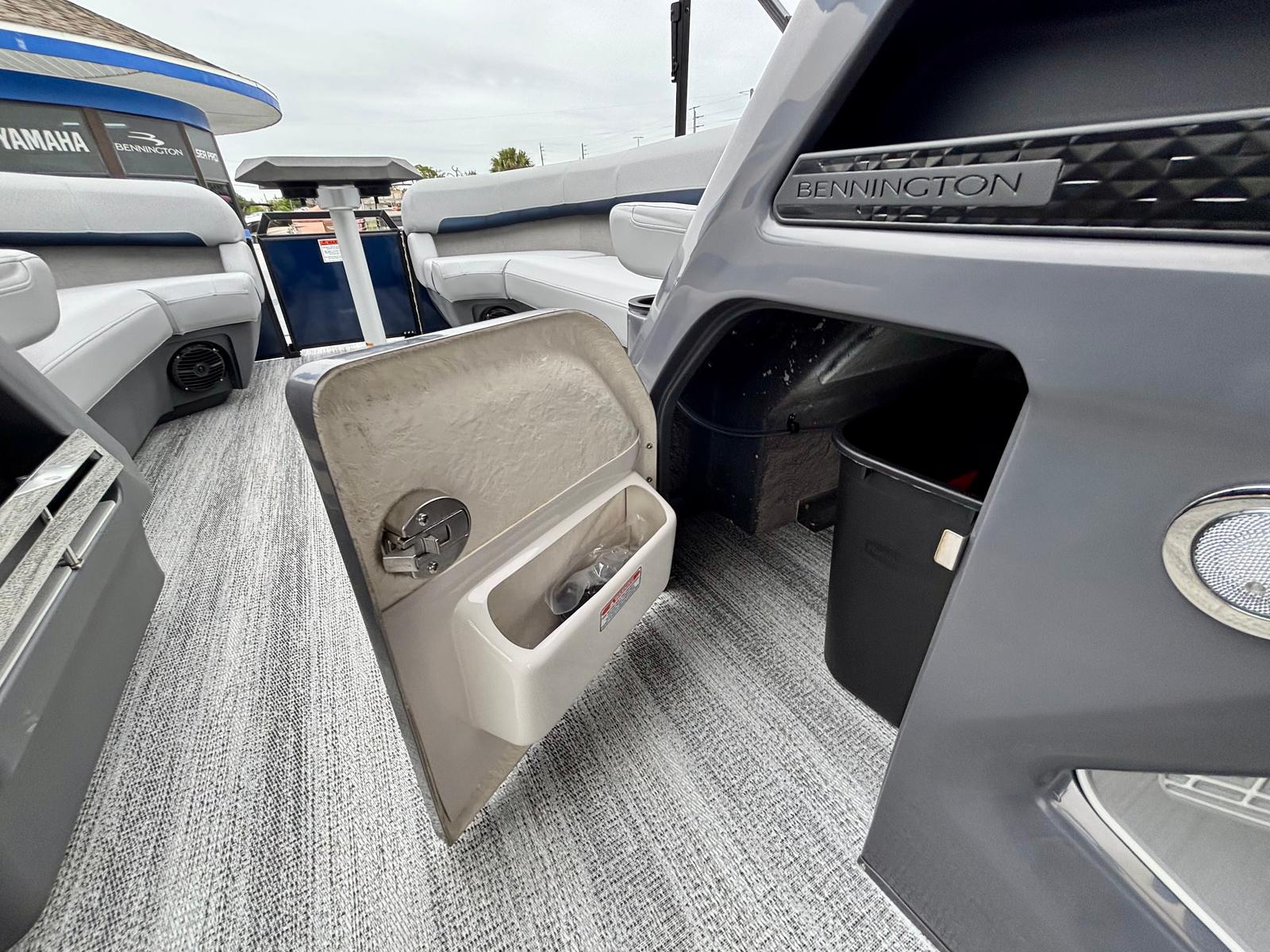 This Bennington boat for sale is loaded with premium features that set it apart from the competition. The Blackout Luxe Package enhances the boat’s visual appeal with sleek, modern accents, while the Sunshine Package ensures you and your guests can soak up the sun in style. The Bimini - Double 16.5' Blk provides generous shade on hot days, allowing you to relax comfortably no matter the weather. The Elevated Console with Pocket Mythos offers superior visibility and ergonomic control, making navigation effortless and enjoyable.Entertainment is at your fingertips with the Rockford Fosgate PMX-1R Head Unit Remote, complete with Sirius Satellite Radio. Whether you’re hosting a lively gathering or enjoying a quiet cruise, you’ll have access to your favorite music and entertainment options. The combination of Shoreline Grey flooring and Interior Accent - Midnight Blue Simtex upholstery creates a luxurious environment, while the Black Logos and Smooth Midnight Blue panels give the pontoon a bold, contemporary look.