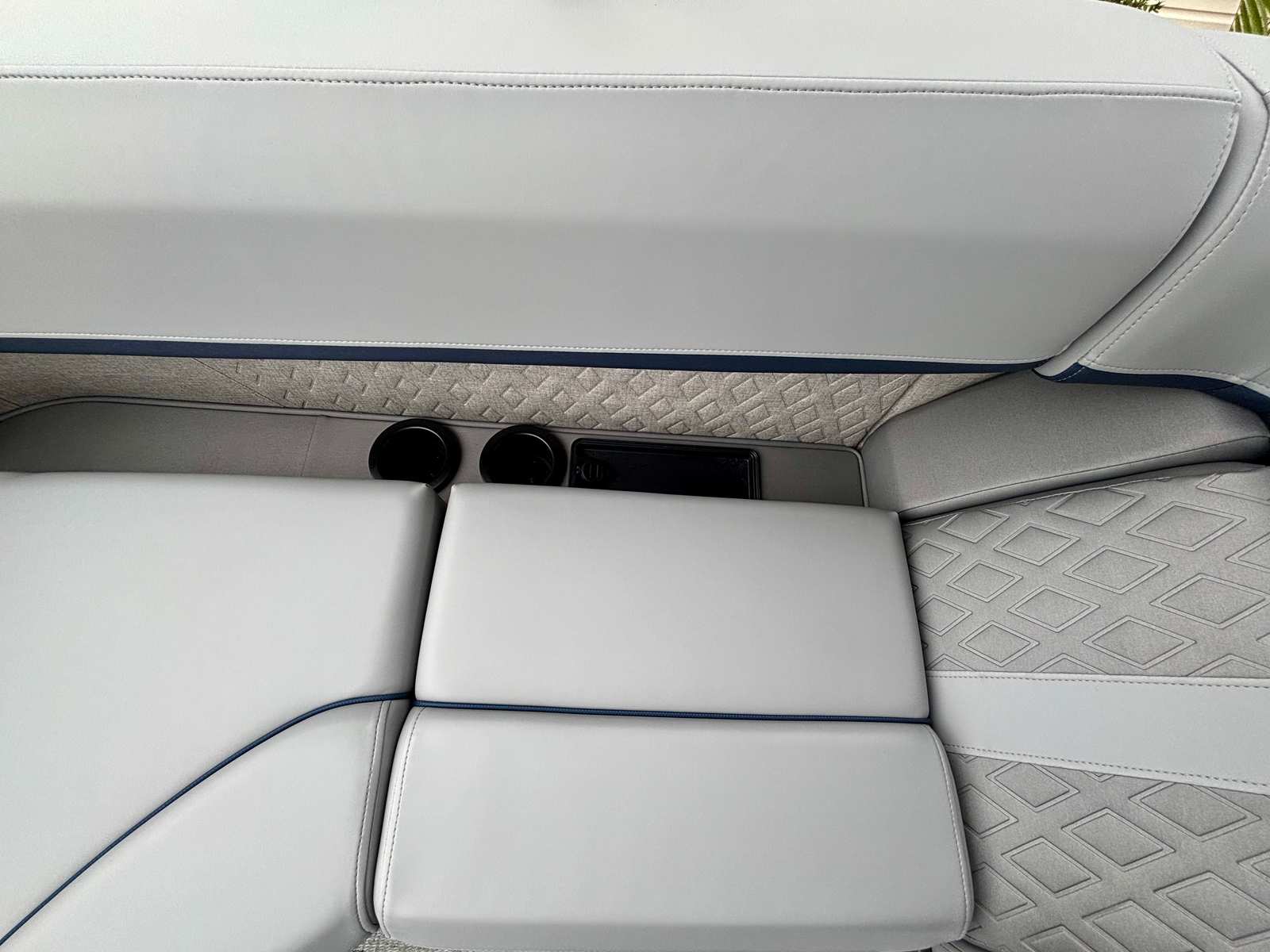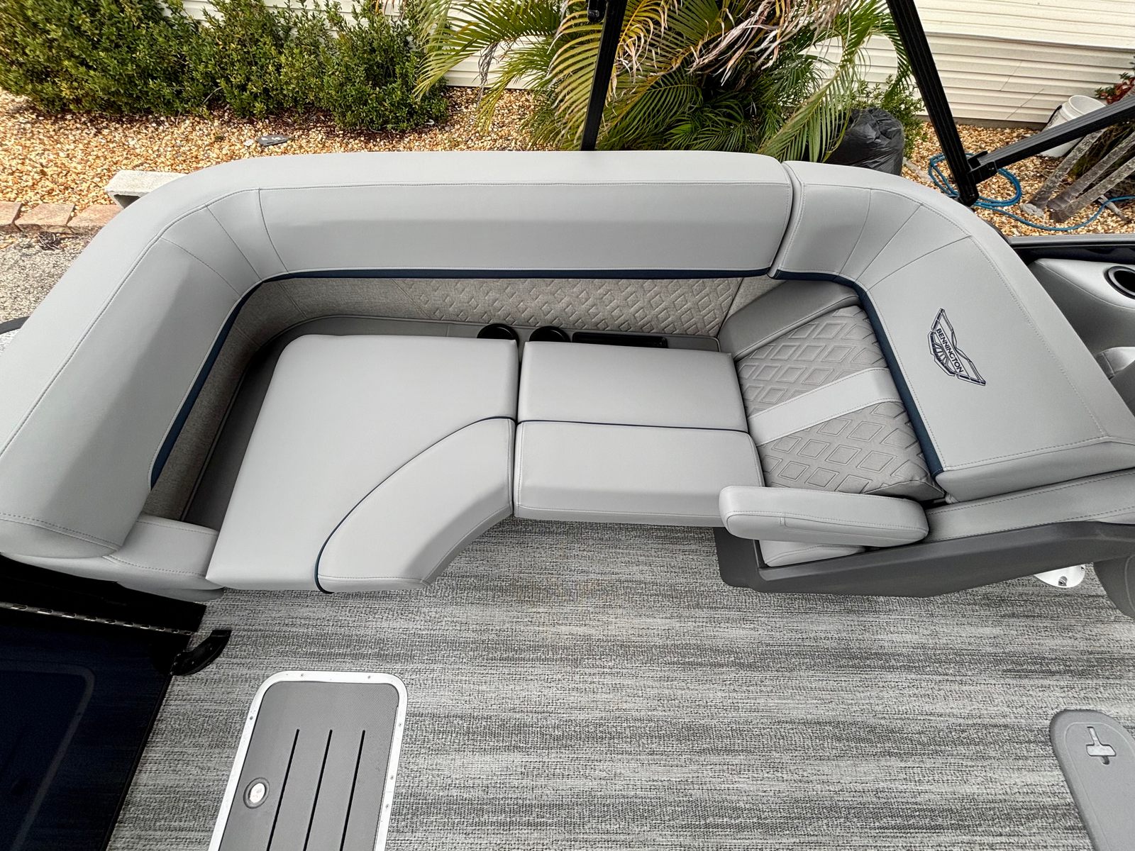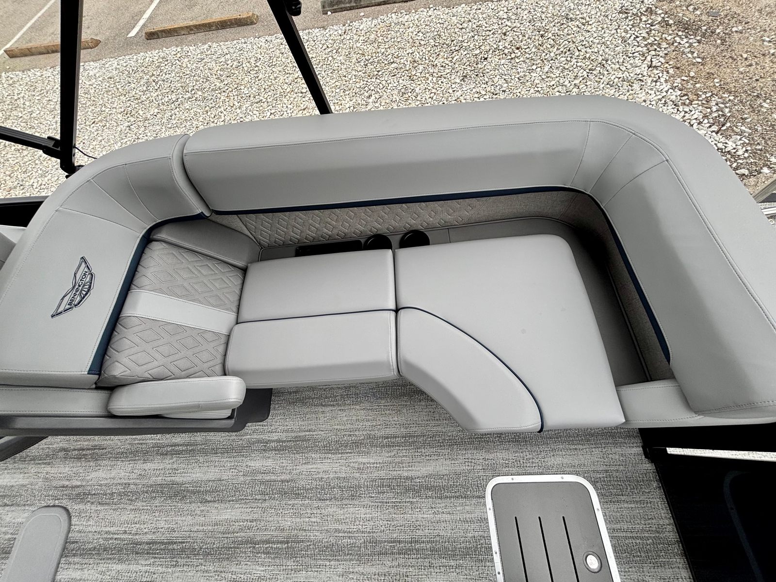 This Bennington boat for sale is loaded with premium features that set it apart from the competition. The Blackout Luxe Package enhances the boat’s visual appeal with sleek, modern accents, while the Sunshine Package ensures you and your guests can soak up the sun in style. The Bimini - Double 16.5' Blk provides generous shade on hot days, allowing you to relax comfortably no matter the weather. The Elevated Console with Pocket Mythos offers superior visibility and ergonomic control, making navigation effortless and enjoyable.Entertainment is at your fingertips with the Rockford Fosgate PMX-1R Head Unit Remote, complete with Sirius Satellite Radio. Whether you’re hosting a lively gathering or enjoying a quiet cruise, you’ll have access to your favorite music and entertainment options. The combination of Shoreline Grey flooring and Interior Accent - Midnight Blue Simtex upholstery creates a luxurious environment, while the Black Logos and Smooth Midnight Blue panels give the pontoon a bold, contemporary look.