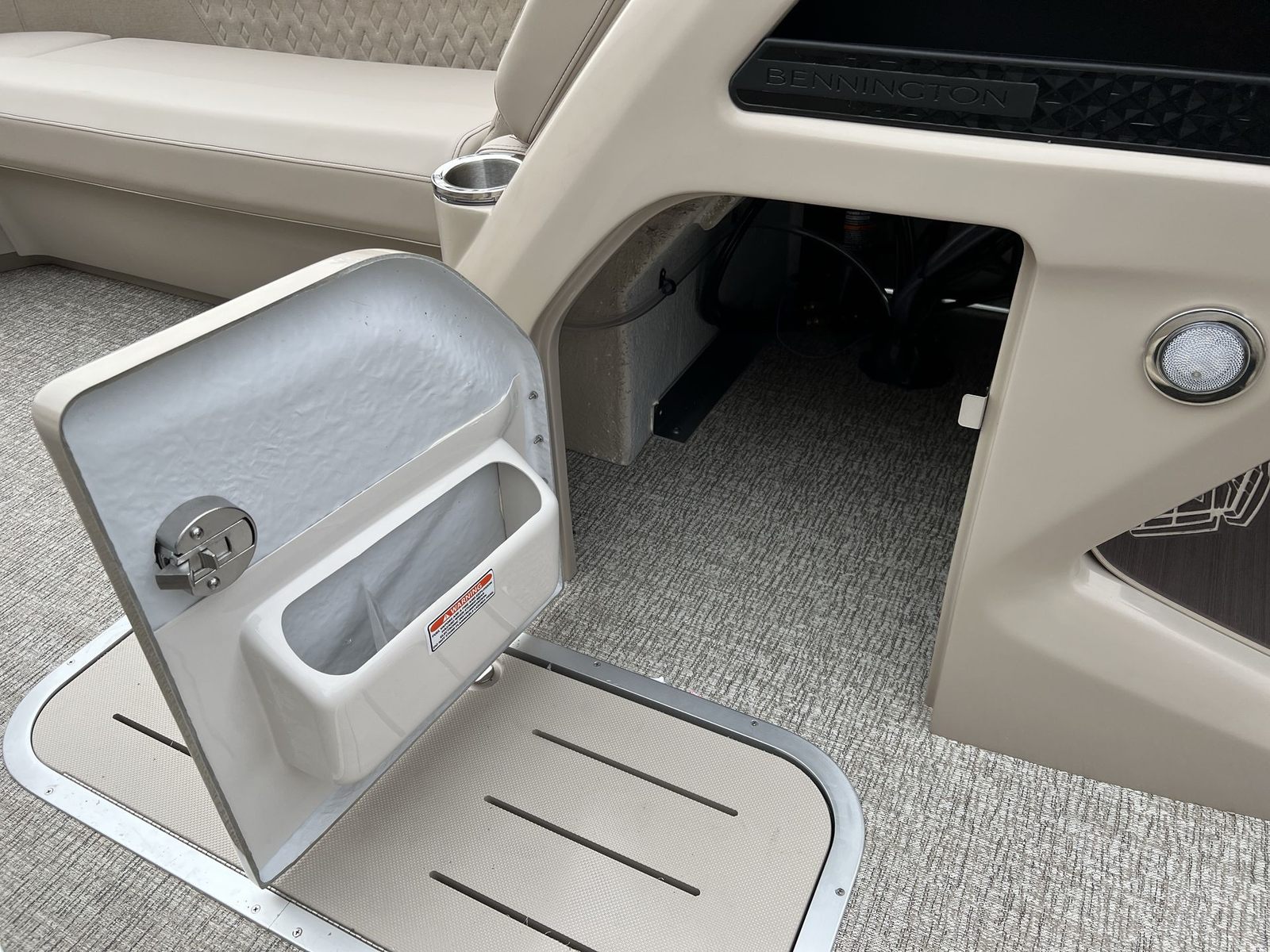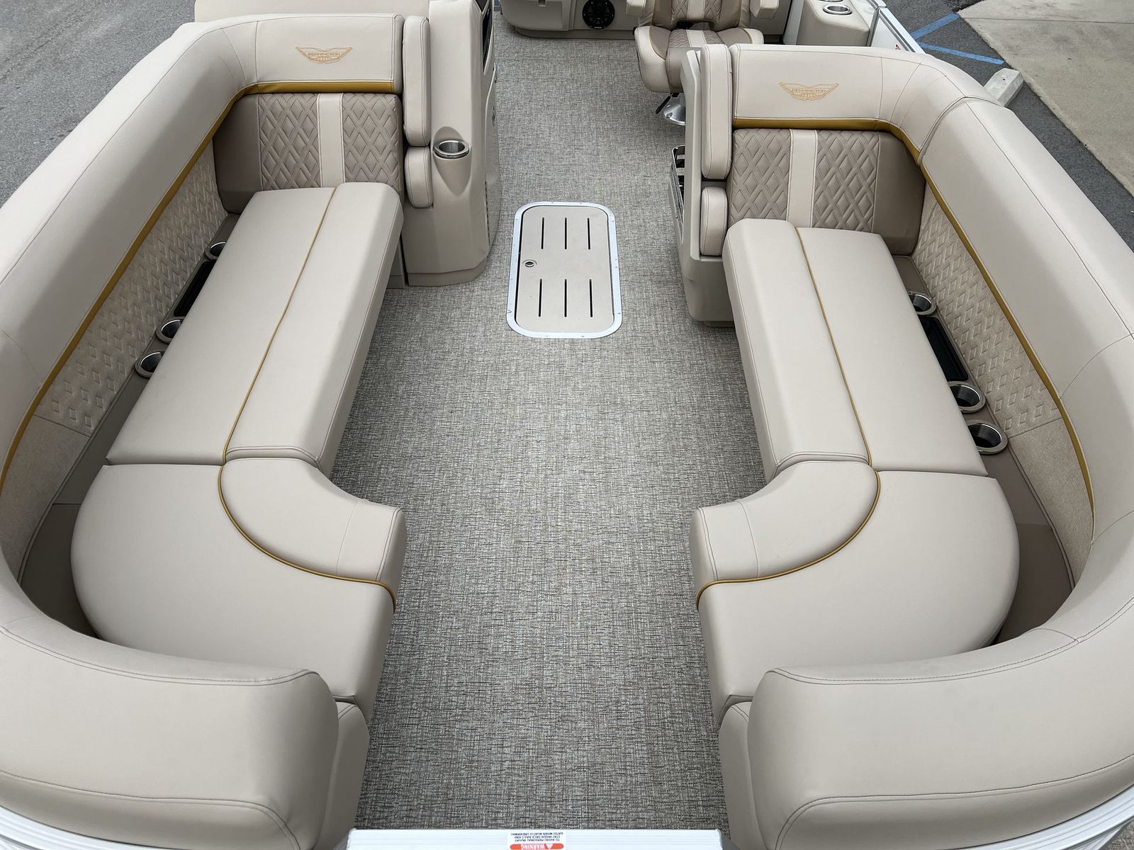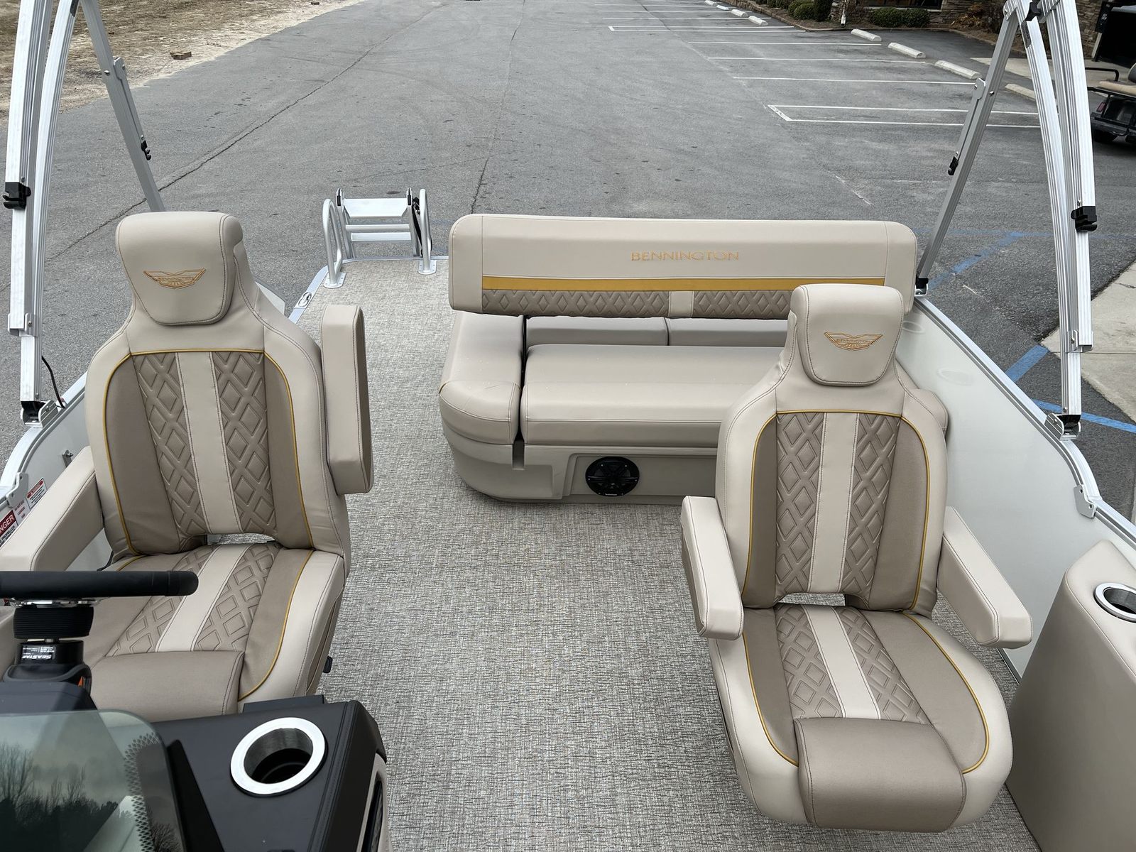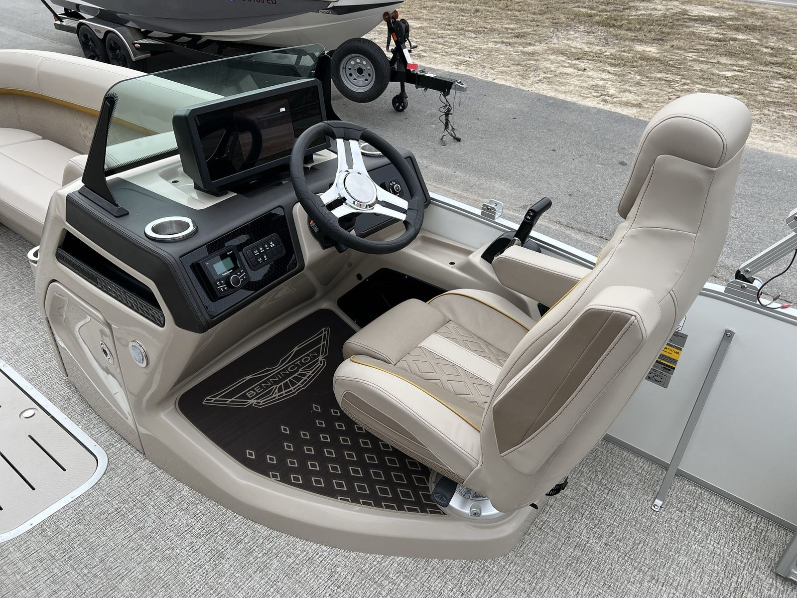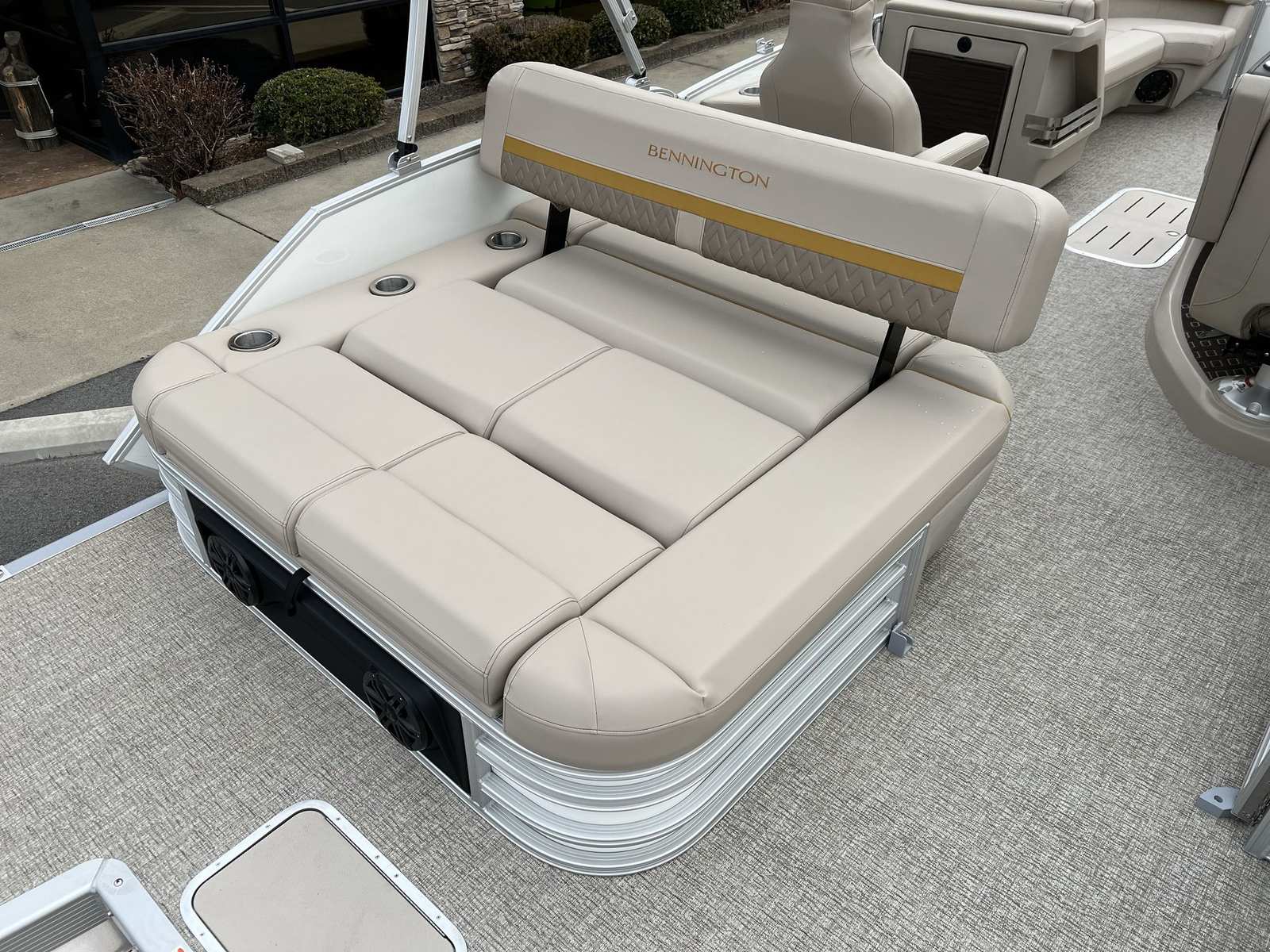 This Bennington pontoon boat for sale is packed with premium features that elevate your boating experience. The dual battery switch with fuse offers added peace of mind, ensuring reliable power management for all your onboard electronics. The RGB Control M Series and RGB speakers create a vibrant, customizable atmosphere, allowing you to set the perfect mood for any occasion. The elevated console with pocket Dolce adds a touch of sophistication and convenience, while the Rockford Fosgate M1 lighted speakers (six in total) deliver crystal-clear sound and dynamic lighting effects for your entertainment.The base furniture M Series provides plush, ergonomic seating for maximum comfort, and the Zebrawood Matte Beige accents add a touch of elegance to the interior. Every detail, from the layout to the finishes, is designed to enhance your time on the water and make every moment memorable.