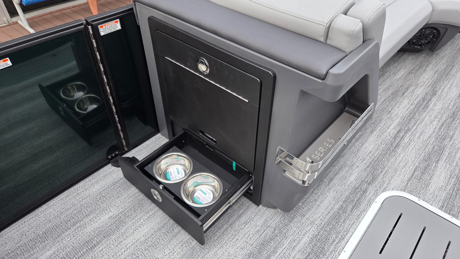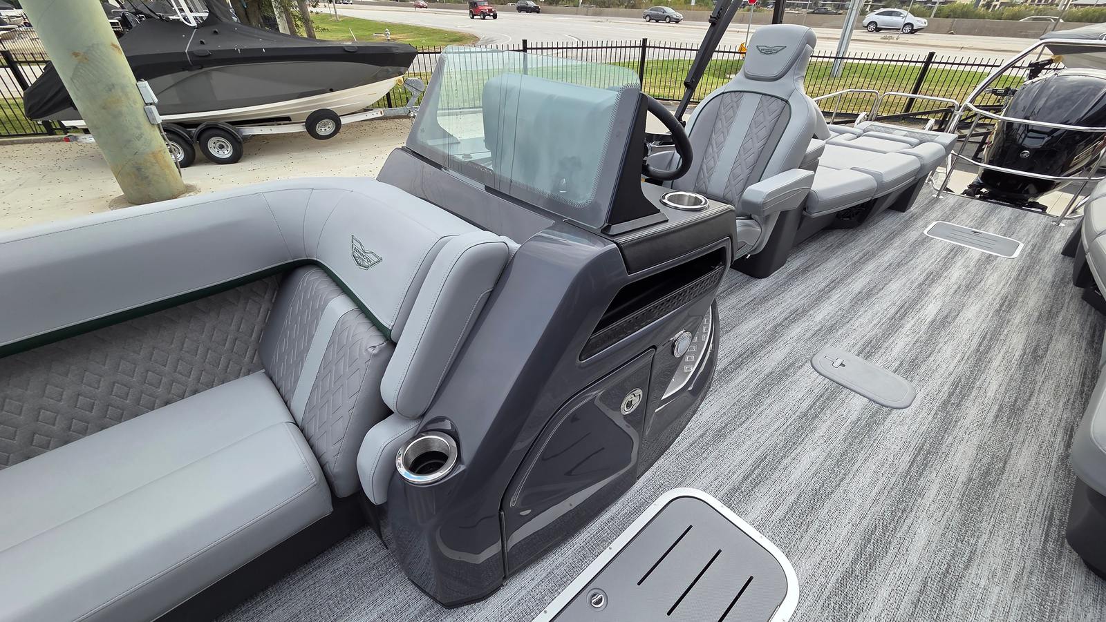 The Bennington 24 MSL SPS Plus is loaded with features that elevate your on-water experience. The RGB Control M Series lighting system allows you to set the perfect mood, while the Toekick Lights (2-62") add a subtle, stylish glow for evening cruises. Entertainment is taken to the next level with six Rockford Fosgate M1 Lighted Speakers, delivering crystal-clear sound and vibrant illumination for your favorite playlists. Illuminated cupholders keep your beverages secure and visible, even after sunset, and the Elevated Console with Pocket Mythos provides a commanding view and convenient storage for your essentials. The addition of lumbar lighting enhances comfort and ambiance, making every seat the best in the house. For sun protection and style, the Bimini - Curved M/LXS No Light Blk offers ample shade without compromising the boat’s sleek profile.
