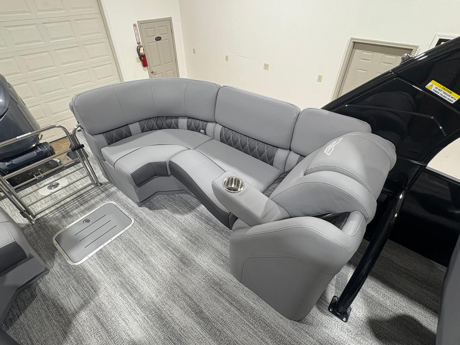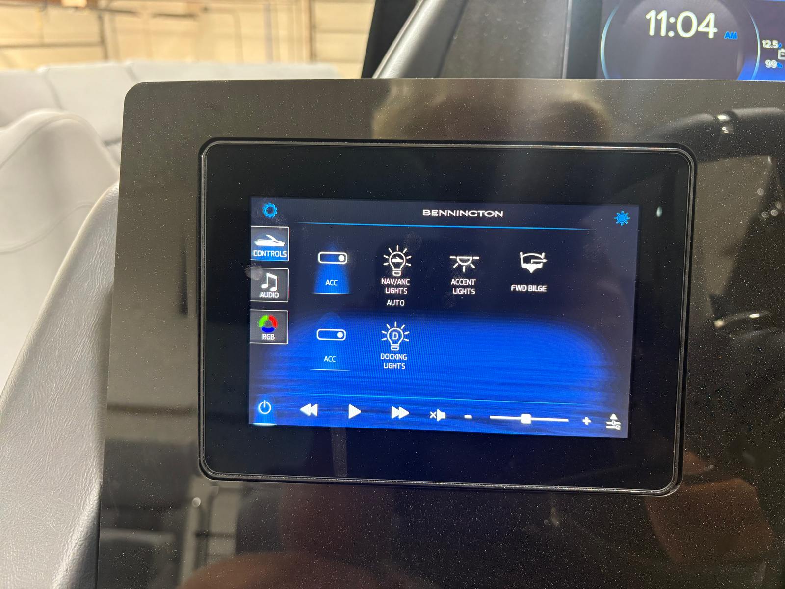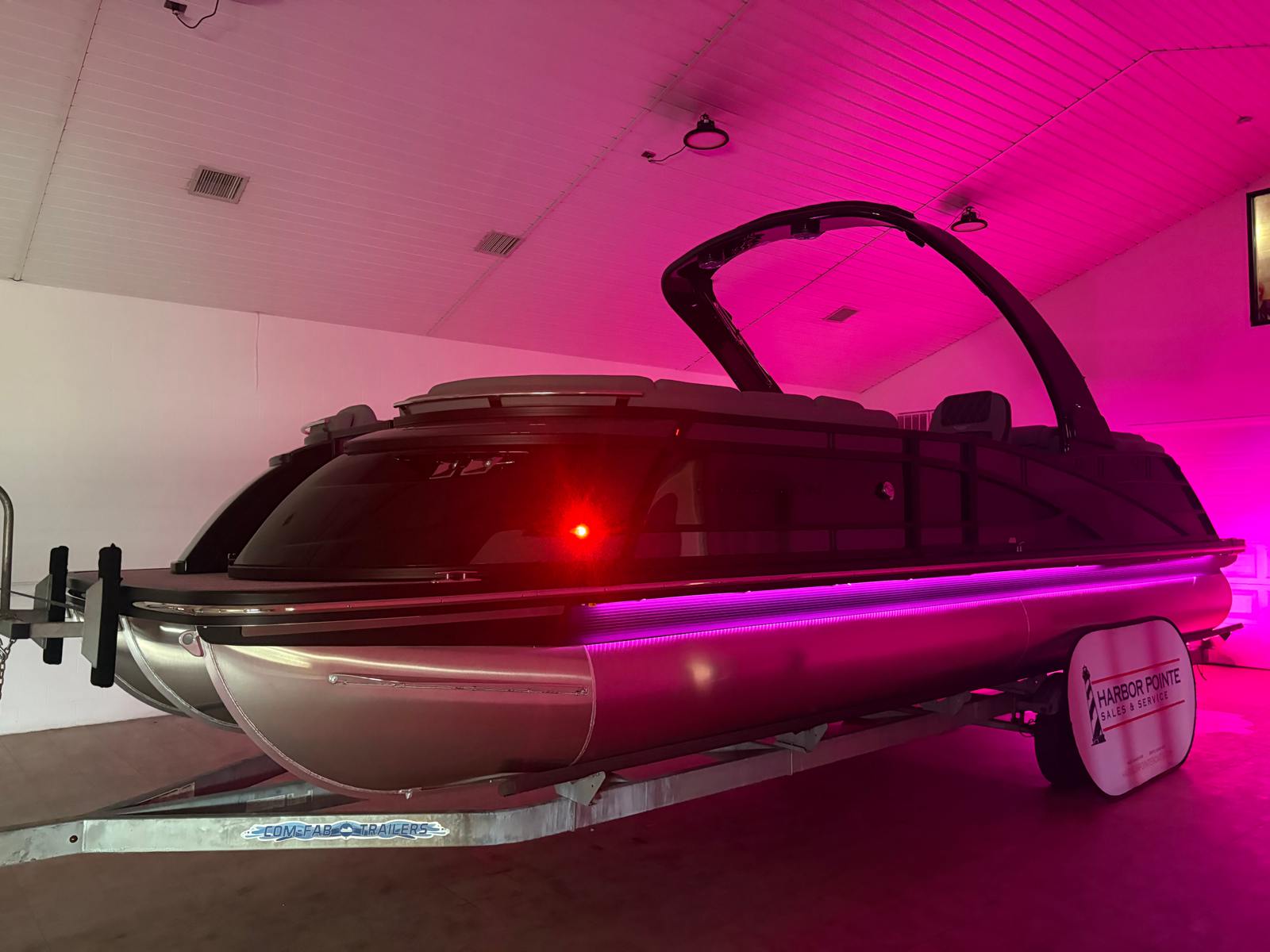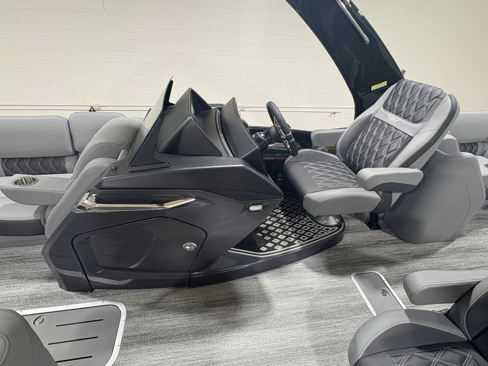Step aboard the Bennington 25 Qfba ESP and discover a world of premium features designed to enhance your boating experience. The illuminated cupholders (8) add a touch of elegance and convenience, ensuring your favorite beverages are always within reach, even during evening cruises. Exterior side lighting and underwater lighting create a captivating ambiance, illuminating the boat’s sleek lines and the surrounding water for added safety and visual appeal. Toekick lights, with two 37-inch and two 62-inch fixtures, provide subtle illumination that enhances both aesthetics and functionality.The blackout logos lend a modern, sophisticated look, while the Rockford Fosgate audio system transforms your pontoon into a floating entertainment hub. With six 6.5-inch M2 speakers throughout the boat, two additional speakers on the arch, two 8-inch M2 speakers in the Fastback area, and a powerful 10-inch M2 subwoofer, you’ll enjoy crystal-clear sound and deep bass for your favorite playlists. The dual PM Punch amplifier upgrade ensures every note is delivered with precision and power, making every outing a celebration.Inside the console, you’ll find a stylish graphite finish complemented by Zebrawood matte slate accents, creating an inviting and contemporary atmosphere. Every detail, from the lighting to the audio system, has been thoughtfully selected to maximize comfort, convenience, and enjoyment.