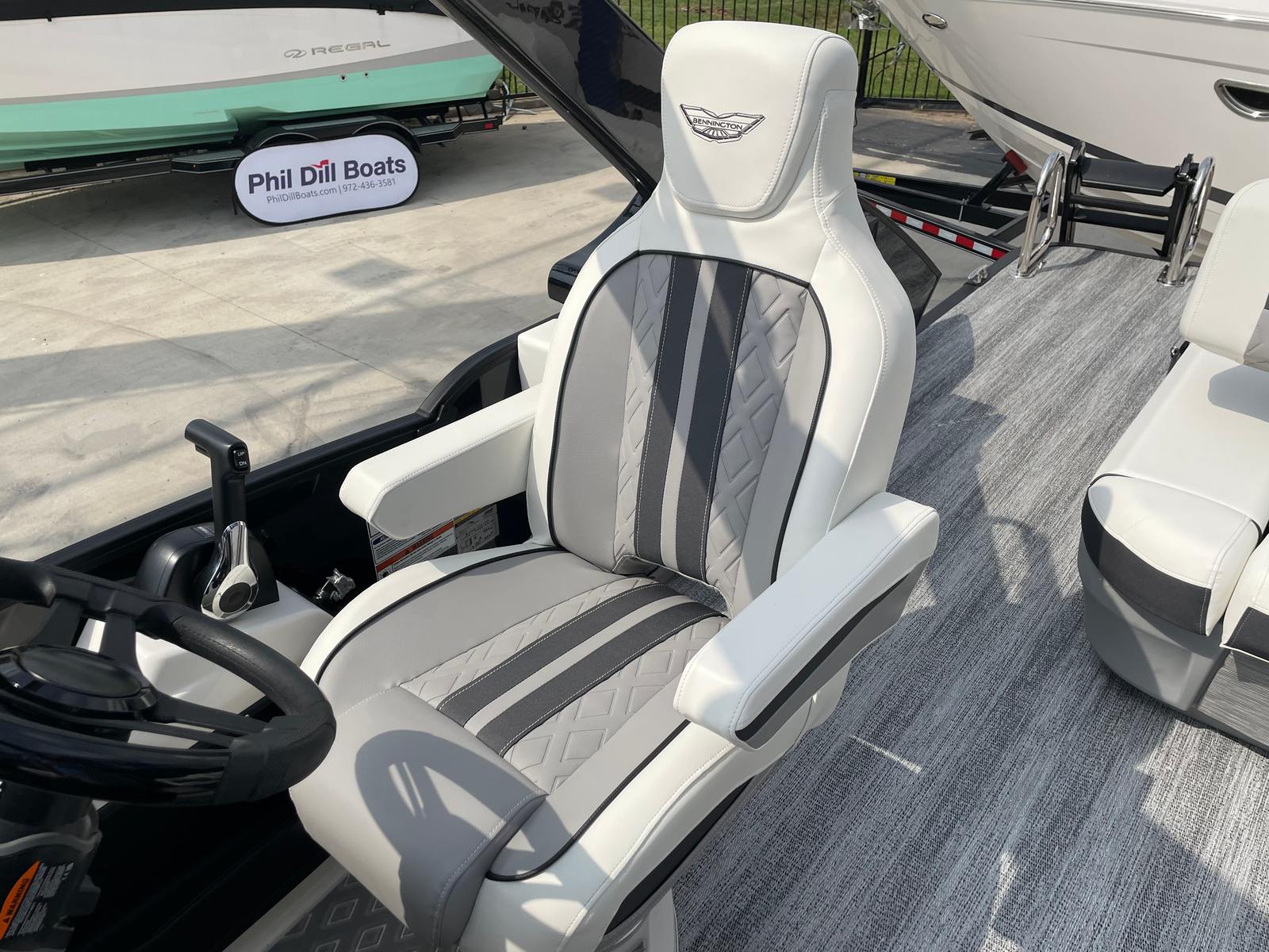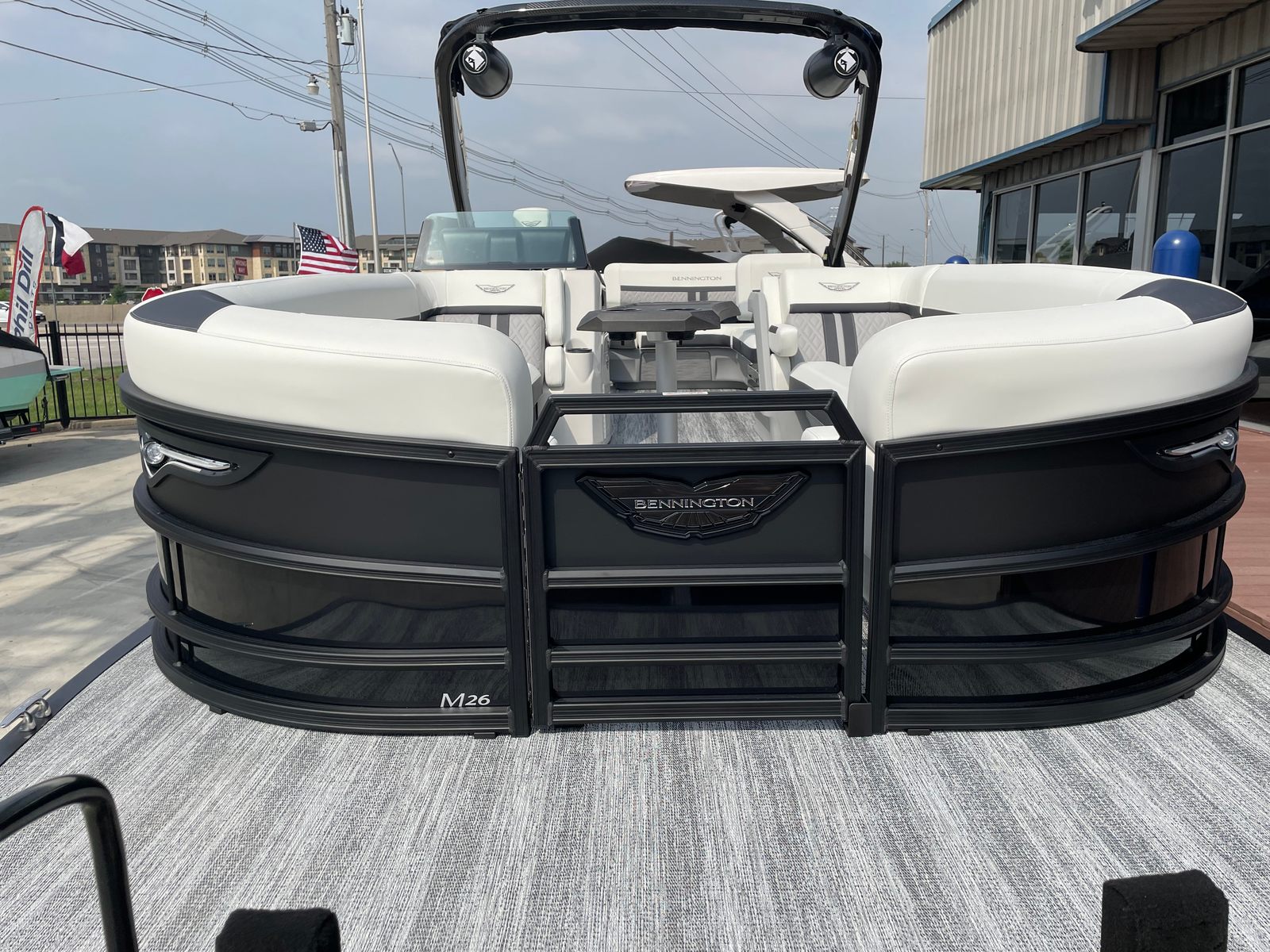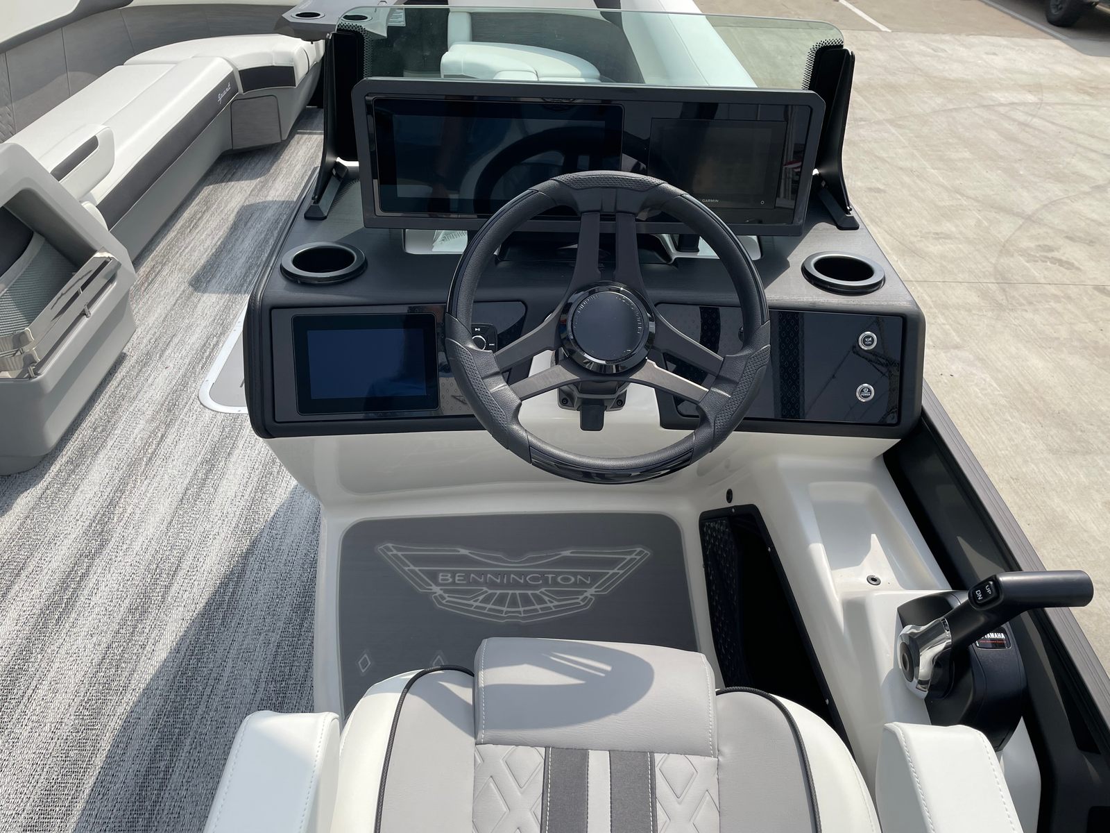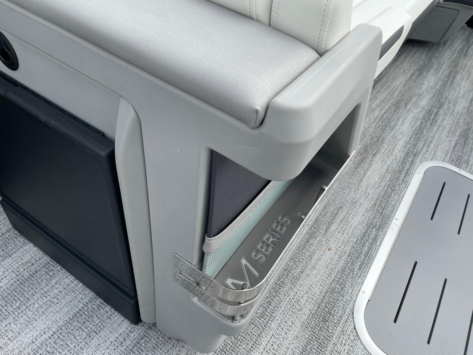 The Bennington 26 MSB ESP is loaded with special features that set it apart from other pontoon boats for sale. The battery system includes a single switch with fuse for added safety and convenience, ensuring reliable power management on every outing. Enjoy an immersive audio experience with RGB speakers that let you set the mood with customizable lighting, while the toekick lights (2-62") and lumbar lighting add a sophisticated ambiance for evening cruises.The elevated console with pocket in Ice White not only enhances visibility and control but also adds a modern, stylish touch to the helm. The Sport Furniture M Series provides plush, ergonomic seating for all your guests, ensuring maximum comfort during long days on the water. The interior is beautifully accented with Zebrawood Matte Slate finishes, creating a refined and inviting atmosphere that is sure to impress.