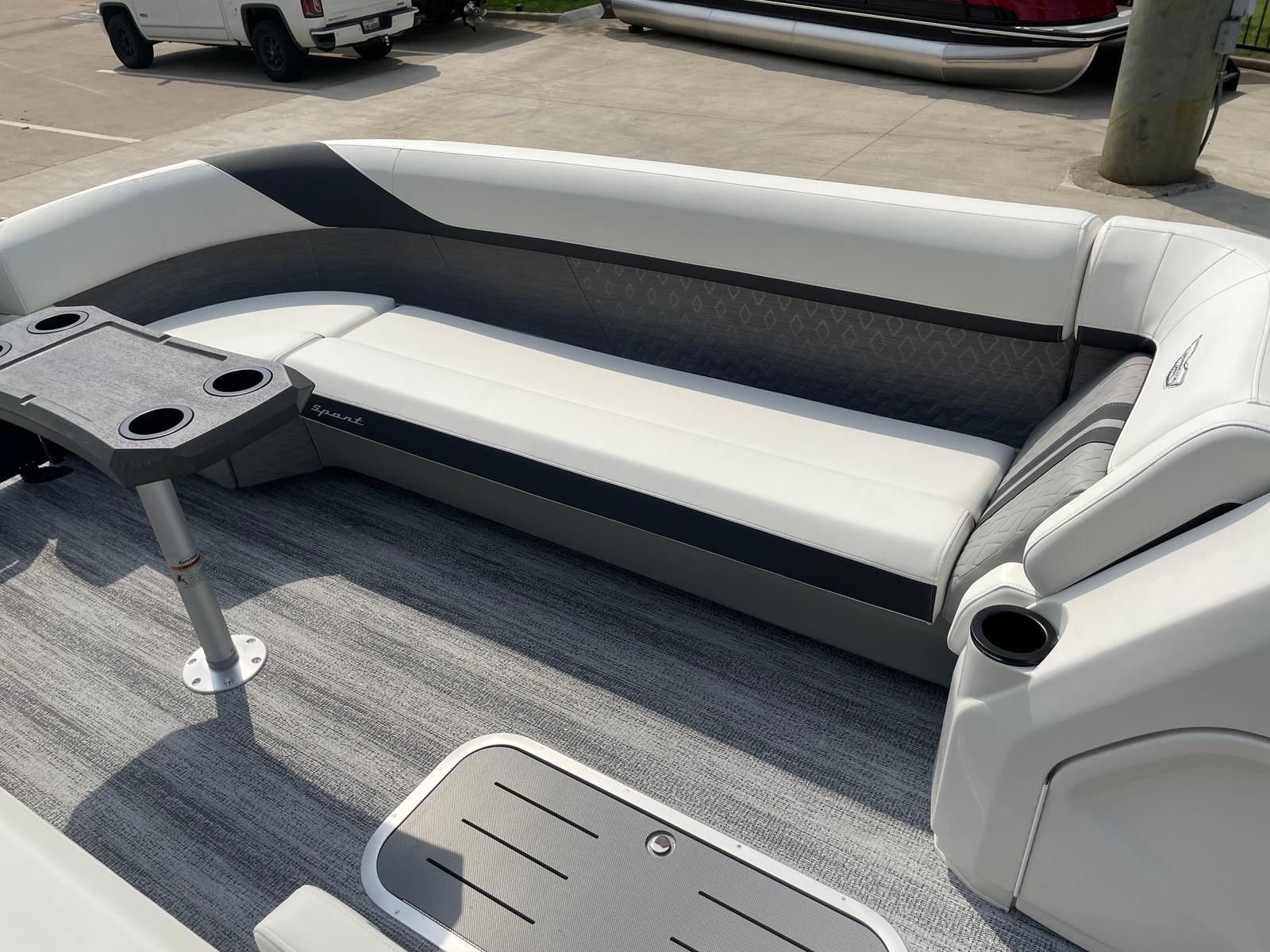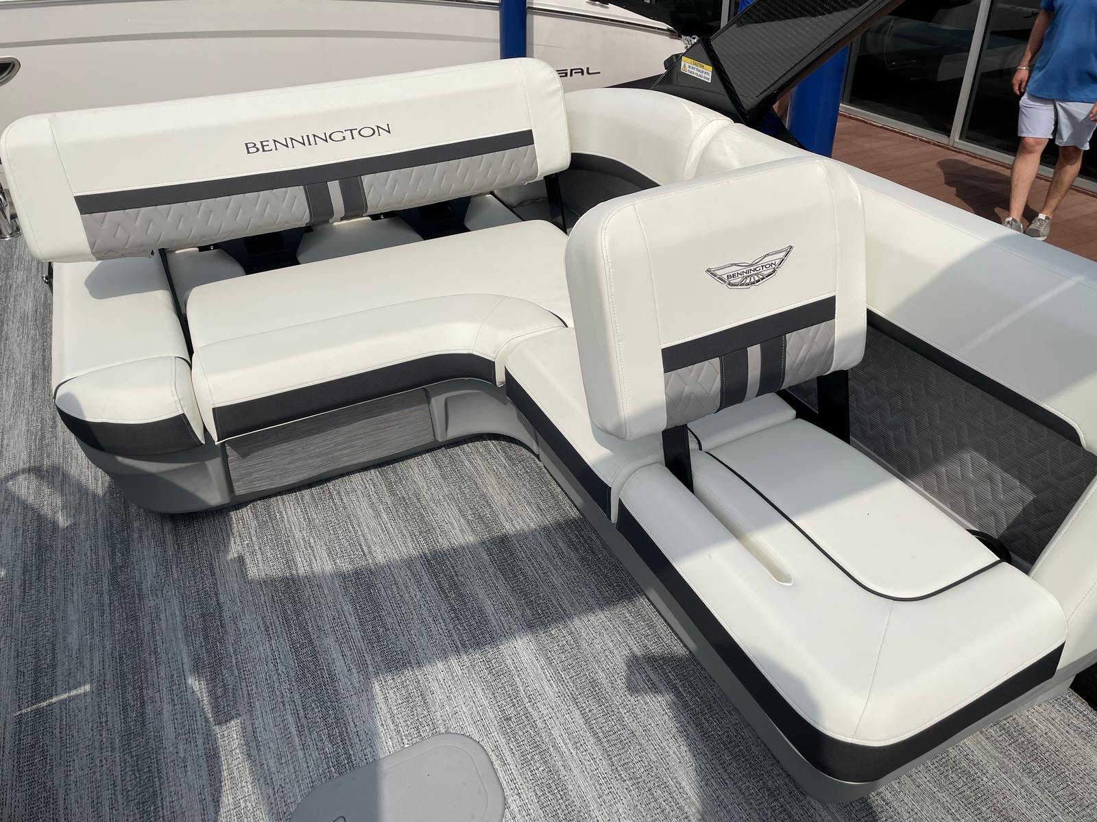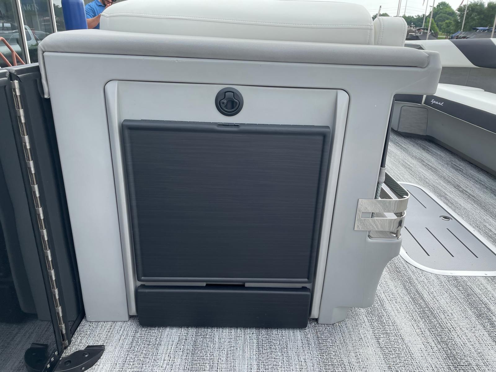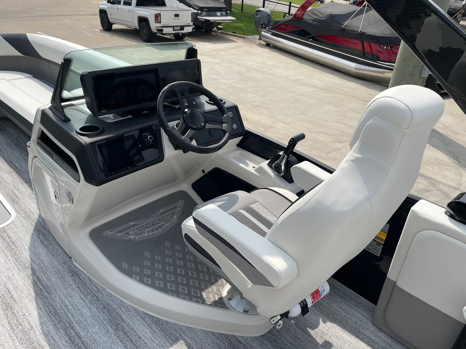 The Bennington 26 MSB ESP is loaded with special features that set it apart from other pontoon boats for sale. The battery system includes a single switch with fuse for added safety and convenience, ensuring reliable power management on every outing. Enjoy an immersive audio experience with RGB speakers that let you set the mood with customizable lighting, while the toekick lights (2-62") and lumbar lighting add a sophisticated ambiance for evening cruises.The elevated console with pocket in Ice White not only enhances visibility and control but also adds a modern, stylish touch to the helm. The Sport Furniture M Series provides plush, ergonomic seating for all your guests, ensuring maximum comfort during long days on the water. The interior is beautifully accented with Zebrawood Matte Slate finishes, creating a refined and inviting atmosphere that is sure to impress.