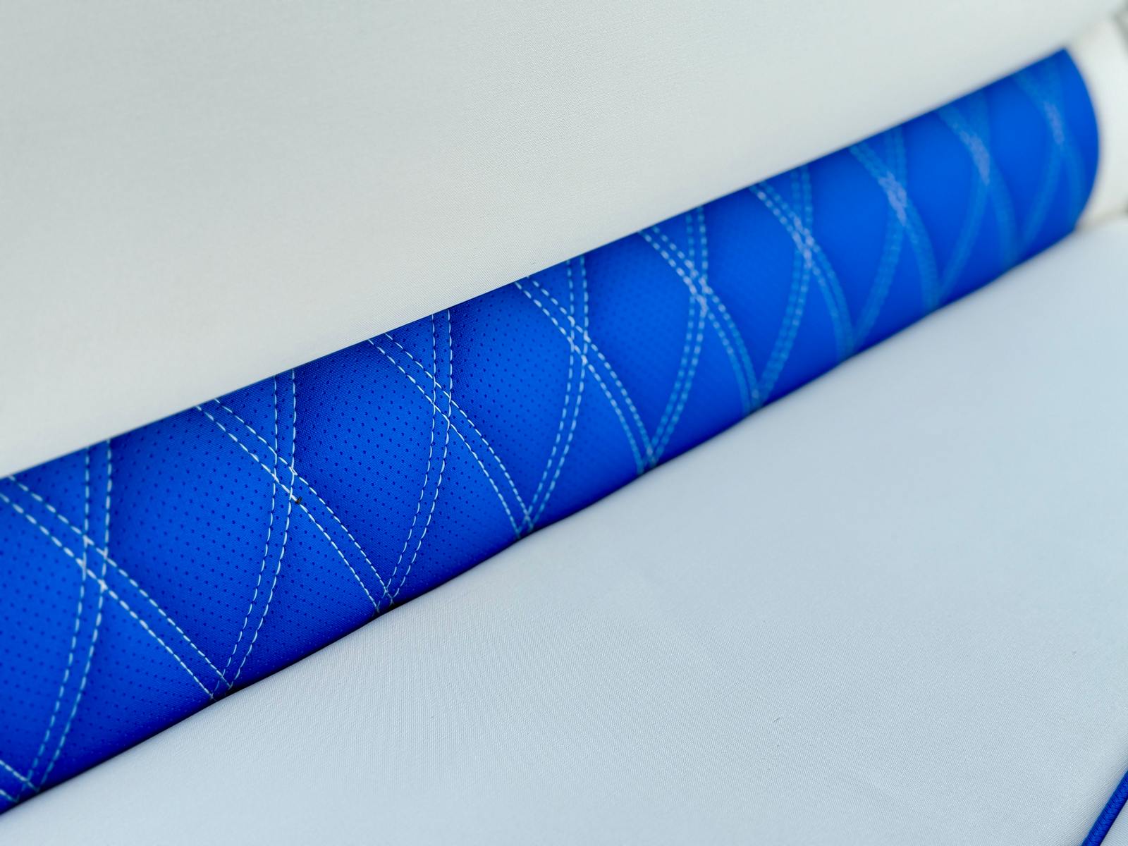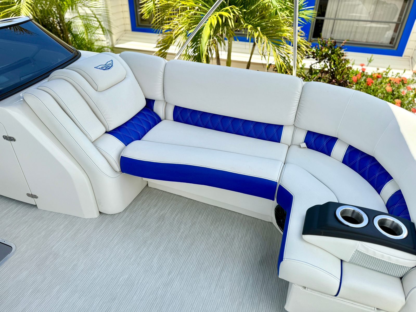 This Bennington pontoon boat is loaded with premium features designed to elevate your on-water experience. The twin Yamaha 300 HP 4 Stroke V6 engines with integrated steering provide both power and control, while the Arctic Ice White exterior and Blackout Logos create a striking visual impression. Step aboard and you’ll be greeted by the Base Pillowtop Diamond Stitched Upholstery, exclusive to the Q/QX series and 10-foot wide models, offering both comfort and sophistication.The interior is further enhanced by Zebrawood Matte Slate accents, adding a touch of elegance to the spacious deck. The Canvas in Midnight Black not only looks sleek but also offers protection from the elements. The Tower/Arch in Luminous Blue, along with the Metallic White panels and Aft Metallic White accents, give this pontoon a modern and distinctive appearance that will turn heads at any marina.