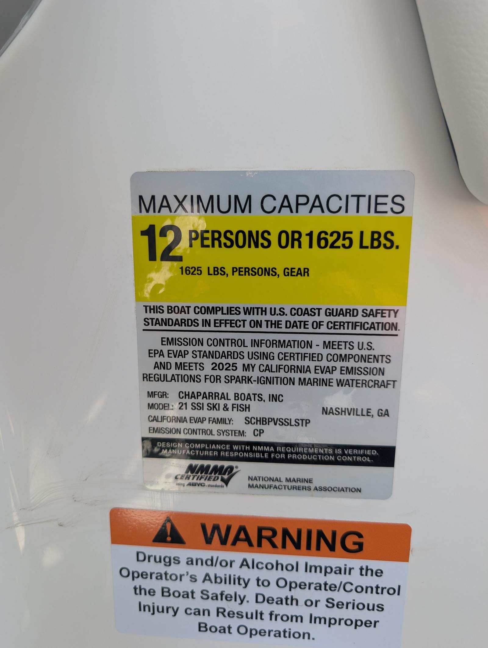The Chaparral 21 SSI S&F is packed with special features that enhance both its functionality and enjoyment. The Simrad GO9 Touch Multifunction Chartplotter/Fishfinder brings advanced navigation and fish-finding capabilities to your fingertips, making it easy to explore new waters or locate the perfect fishing spot. Docking lights add convenience and safety when arriving at the marina after sunset, while the Cockpit Interior - Sterling provides a sophisticated and comfortable environment for passengers.The Deluxe Package elevates the overall experience with premium touches throughout the boat. For those who value versatility, the Saltwater Trolling Motor is a game-changer, allowing for quiet, precise maneuvering during fishing excursions. The Ski and Fish Chrome Graphic adds a sporty flair, highlighting the boat’s dual-purpose nature.Transporting your Chaparral boat for sale is a breeze thanks to the Trailer Upgrade - Aluminum Tandem Axle with Brakes and Aluminum Wheels, complemented by a Spare Tire Kit with an Aluminum Wheel for added peace of mind. The Cockpit and Bow Cover protect your investment from the elements, ensuring your boat stays in pristine condition between adventures.