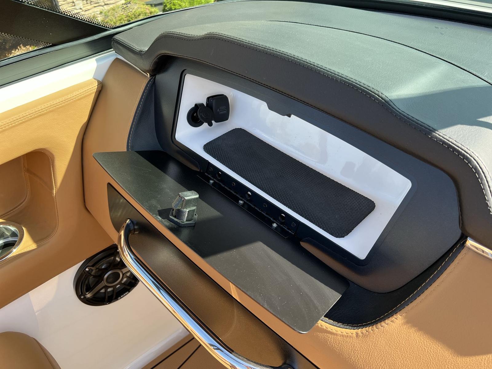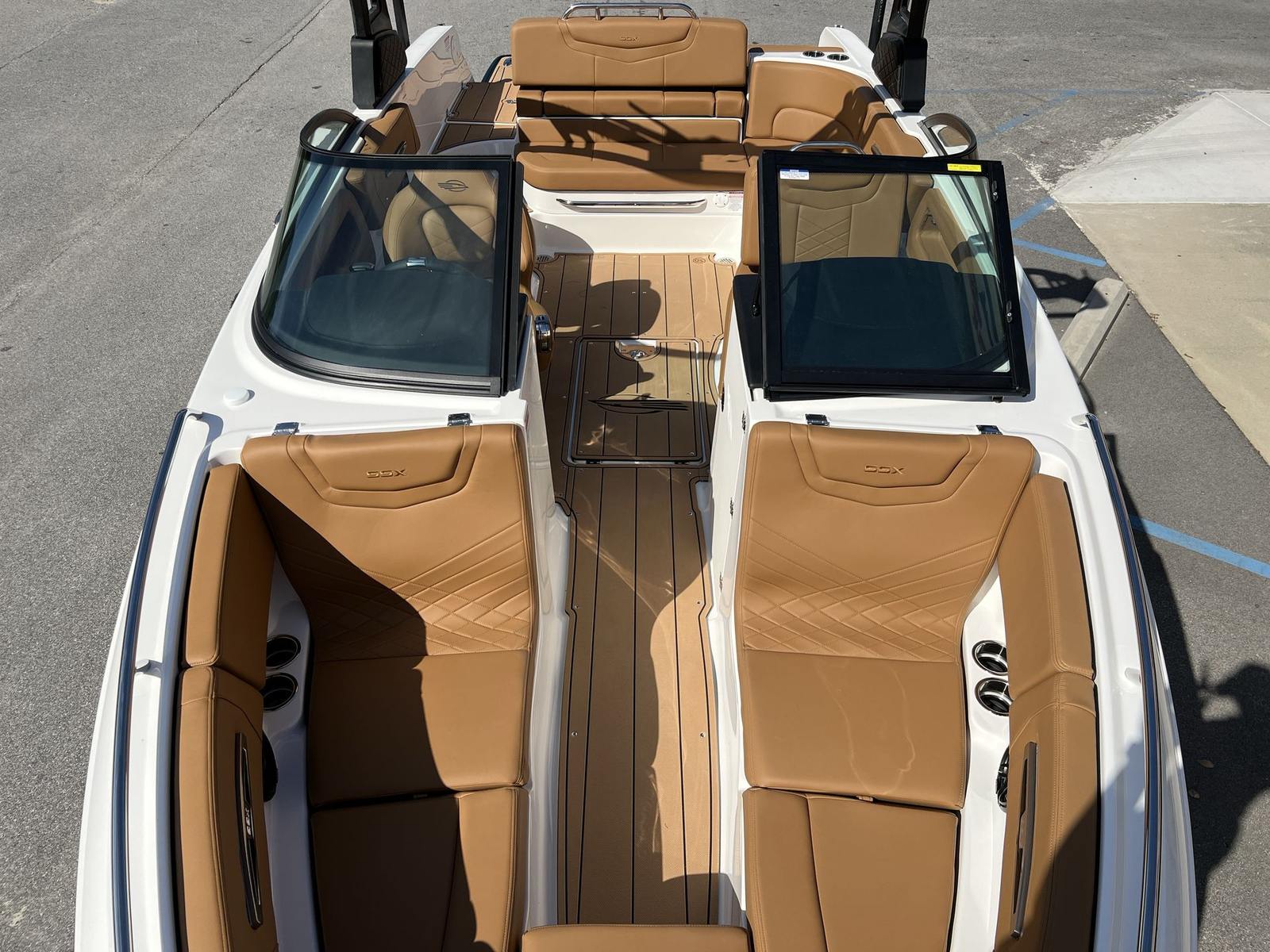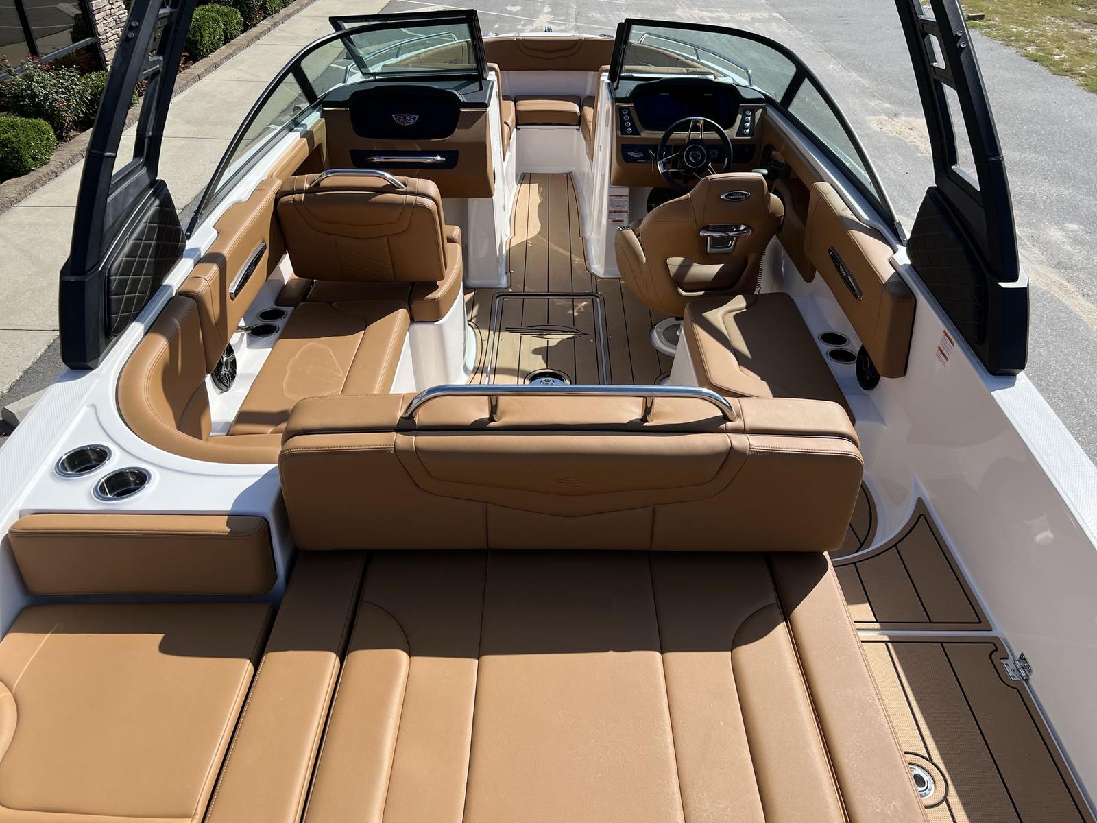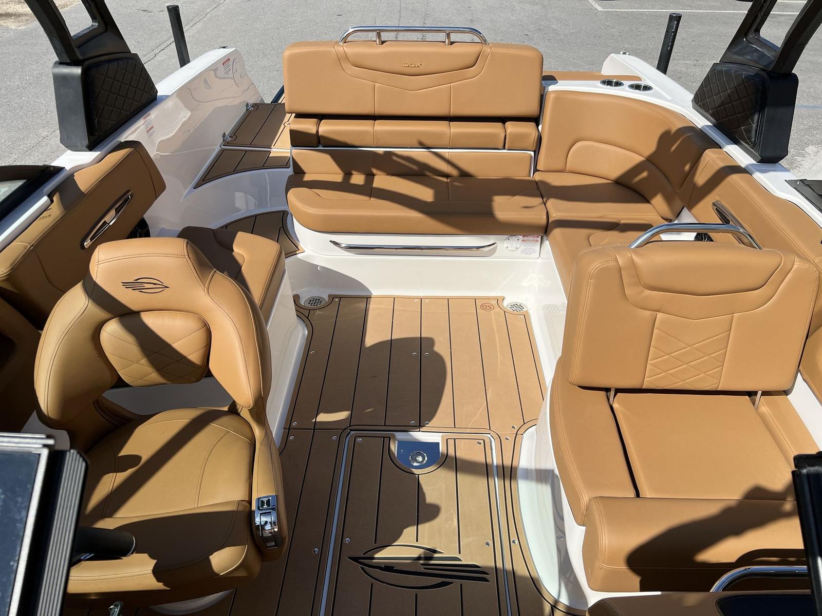 This Chaparral boat for sale is loaded with premium features designed to enhance your boating experience. The Standard Canvas in Black offers protection from the elements, while the Premium Package adds a suite of thoughtful upgrades, including a Bow Scuff Plate, Transom Stereo Remote, Transom Tilt Switch, four Fender Holders, and an Air Pump for added convenience. The JL Audio Sound System Upgrade transforms the cockpit into an entertainment hub, delivering crystal-clear sound for your favorite playlists. Snap-In Seadek Cockpit Flooring in Cayenne provides comfort underfoot and easy maintenance, while the docking lights ensure safe and stress-free arrivals at any marina. Every detail is crafted to elevate your time on the water, from the stylish graphics to the functional enhancements.