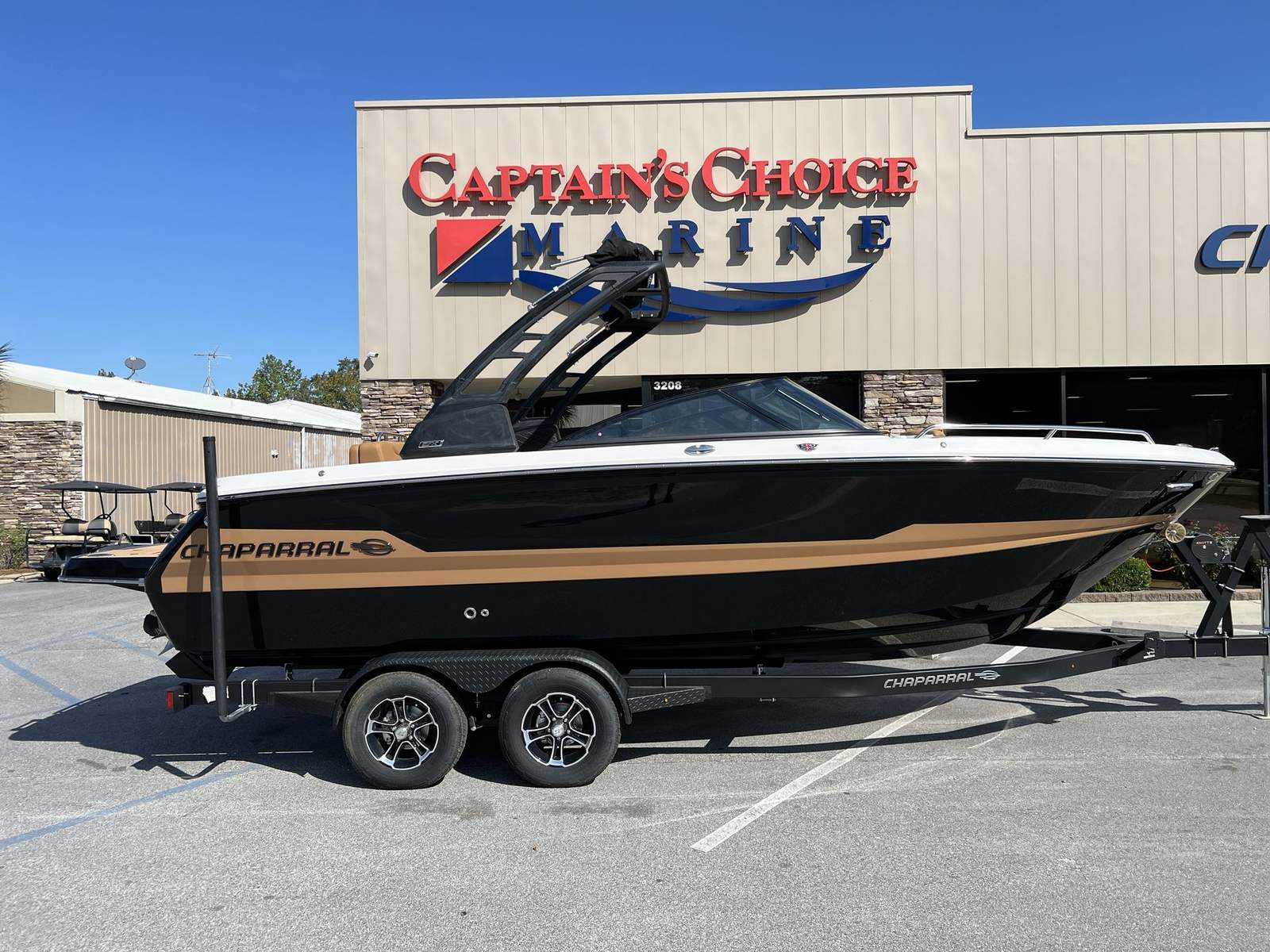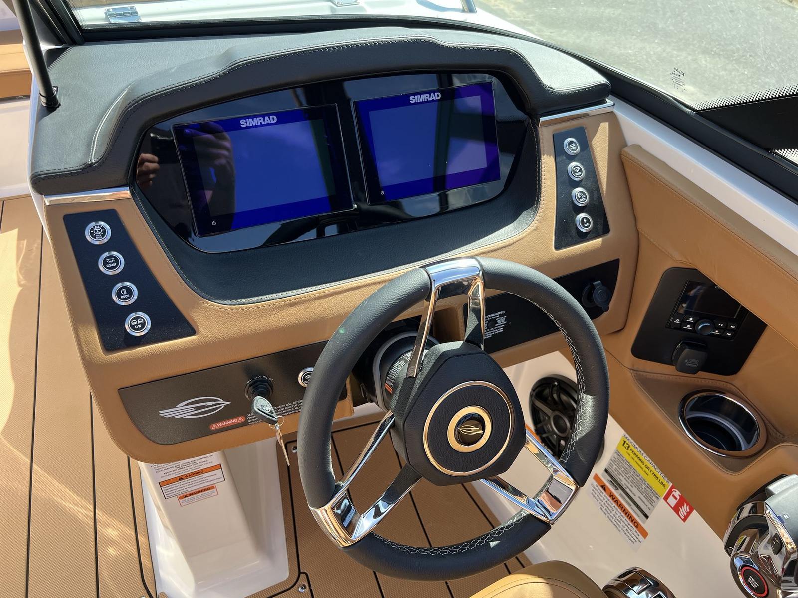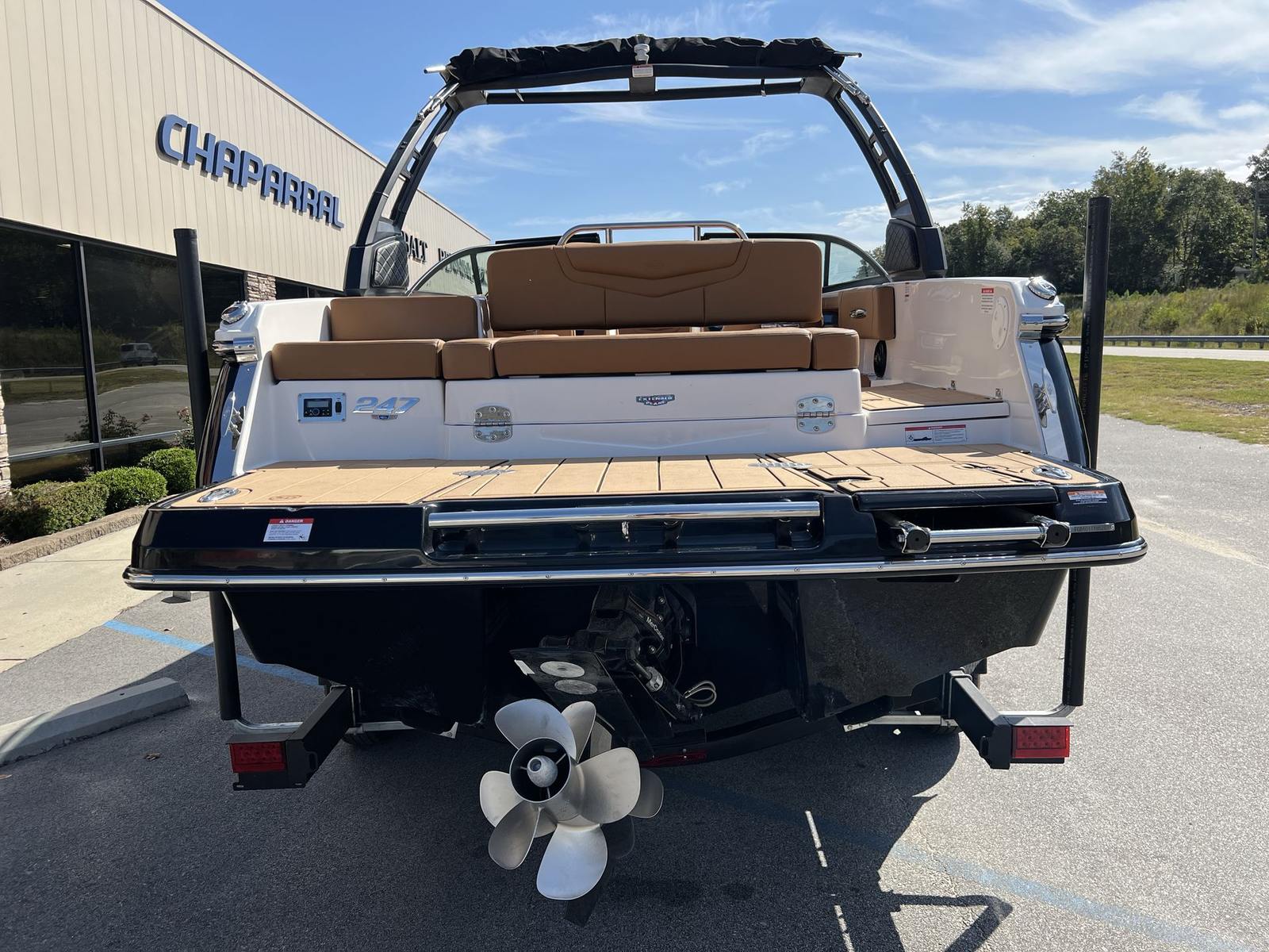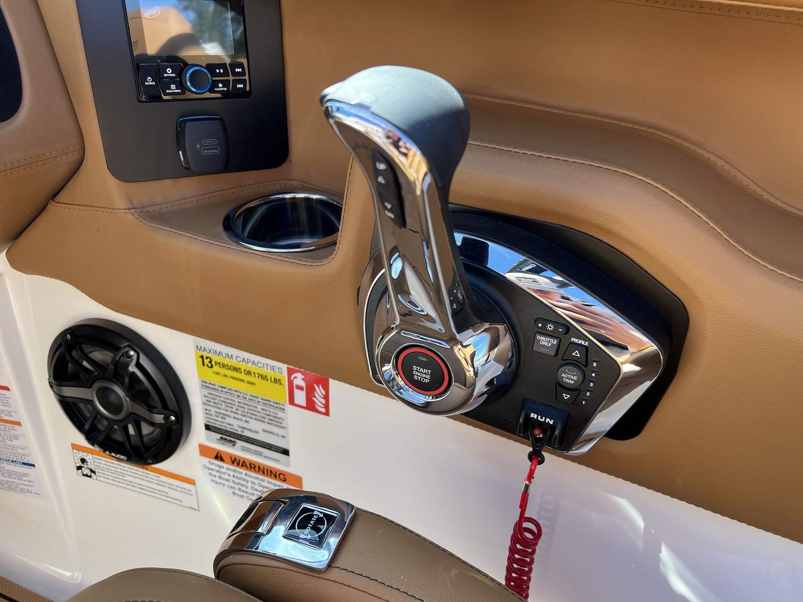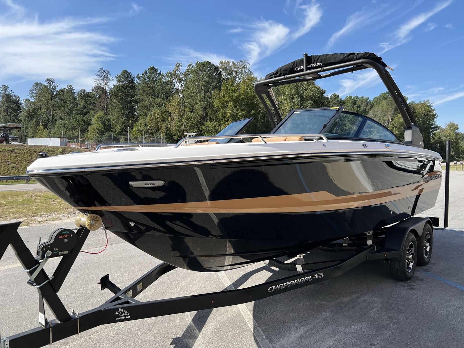 This Chaparral boat for sale is loaded with premium features designed to enhance your boating experience. The Standard Canvas in Black offers protection from the elements, while the Premium Package adds a suite of thoughtful upgrades, including a Bow Scuff Plate, Transom Stereo Remote, Transom Tilt Switch, four Fender Holders, and an Air Pump for added convenience. The JL Audio Sound System Upgrade transforms the cockpit into an entertainment hub, delivering crystal-clear sound for your favorite playlists. Snap-In Seadek Cockpit Flooring in Cayenne provides comfort underfoot and easy maintenance, while the docking lights ensure safe and stress-free arrivals at any marina. Every detail is crafted to elevate your time on the water, from the stylish graphics to the functional enhancements.