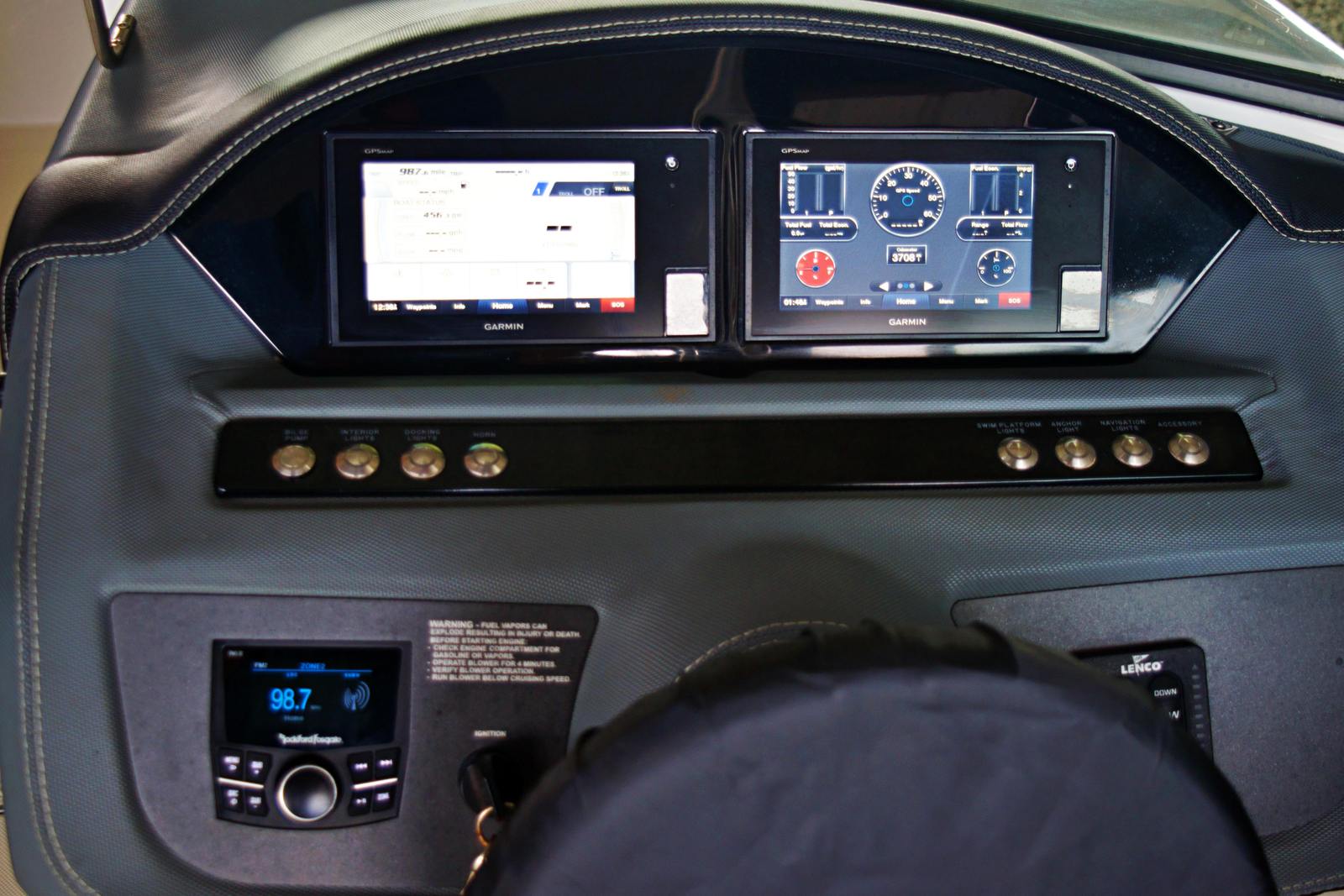 - Garmin Dual 7" Touchscreen Displays (Instrument Cluster, GPS Chartplot Navigation, Engine Diagnostics, Water Depth, and more!)