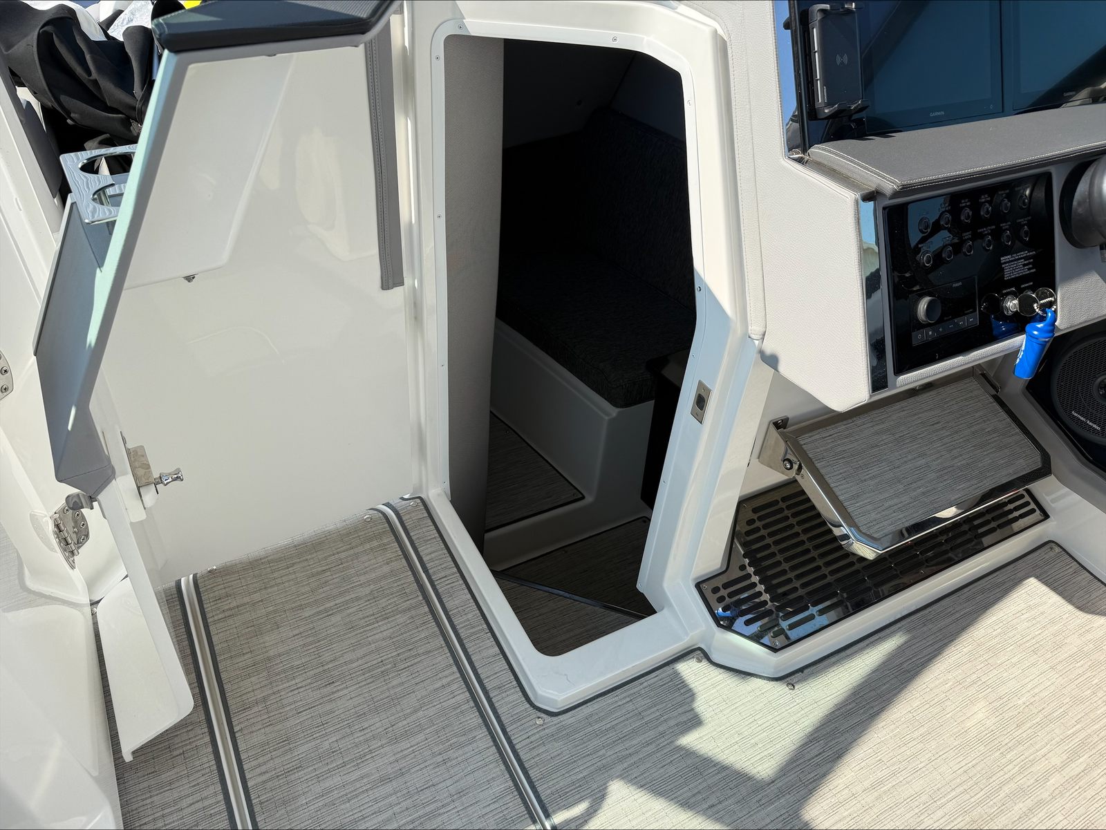 Under the hood, the Cobalt R33 boasts twin engines, delivering a combined 760 horsepower. This powerful setup ensures exhilarating acceleration, smooth cruising, and responsive handling, whether you’re navigating coastal waters or exploring inland lakes. The dual-engine configuration not only enhances performance but also provides added reliability and control, making every journey both thrilling and secure. With only 91 engine hours, these engines are primed for many more seasons of enjoyment, offering peace of mind and outstanding value for those seeking a high-performance Cobalt boat for sale.