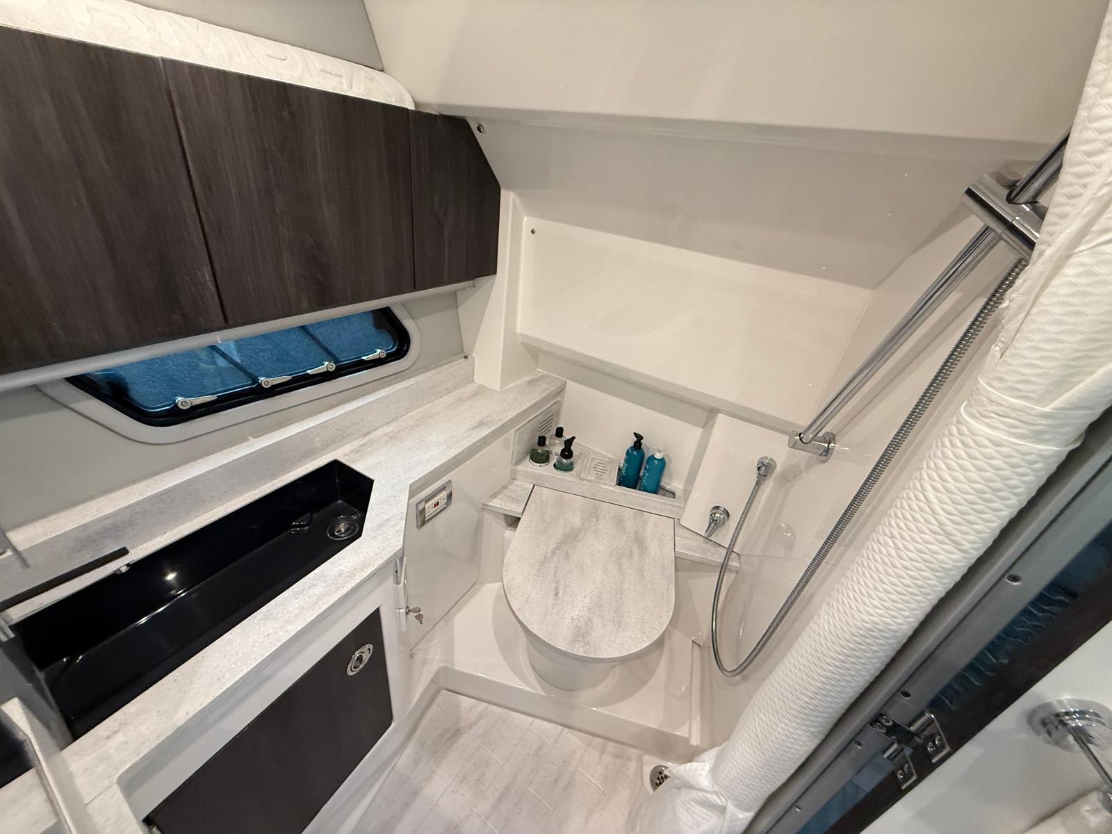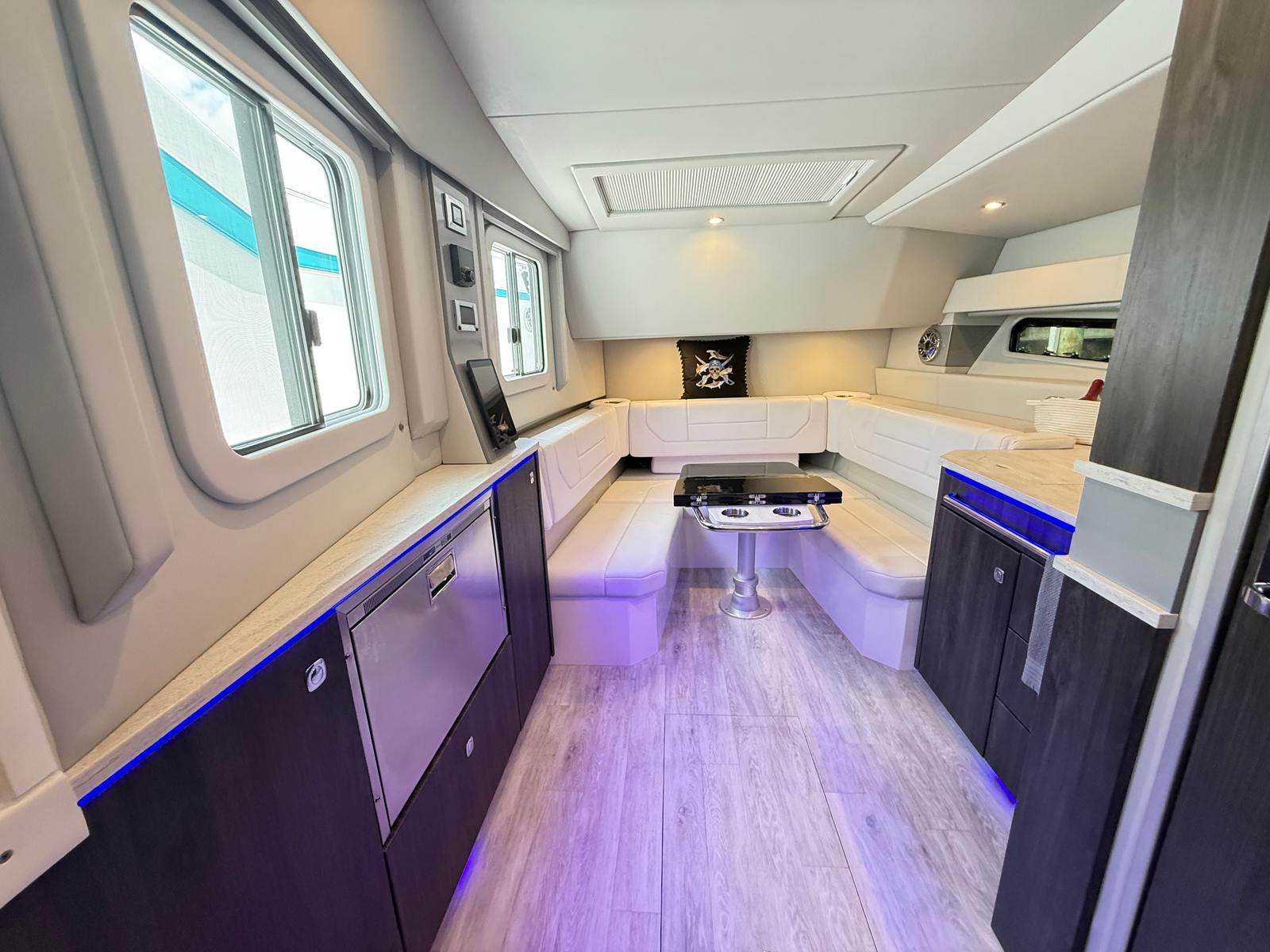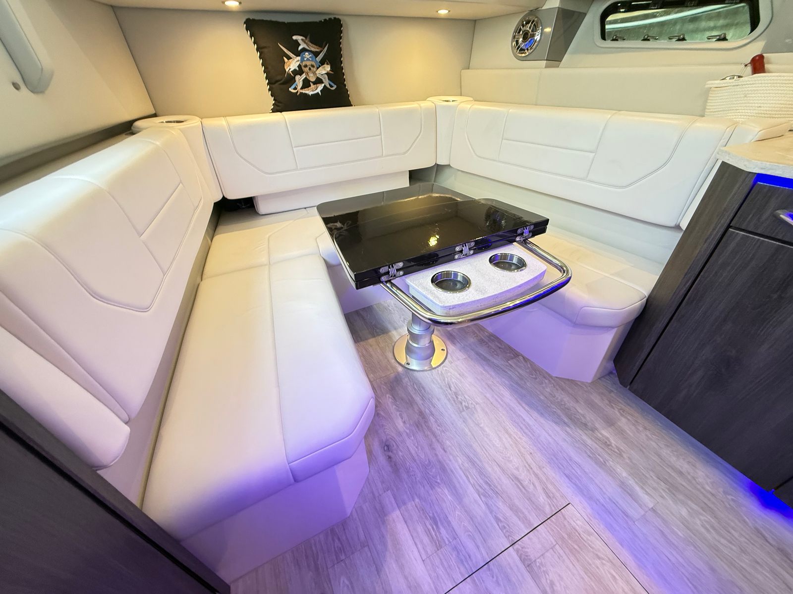 Rockford Fosgate stereo with Bluetooth connectivity, dash-mounted stereo control head with full color display, USB & MP3 ports, remote controller at the bow area, JL Audio M6 blue LED lighted speakers (six hardtop, four cockpit), 1000W stereo amplification and two 200W subwoofers