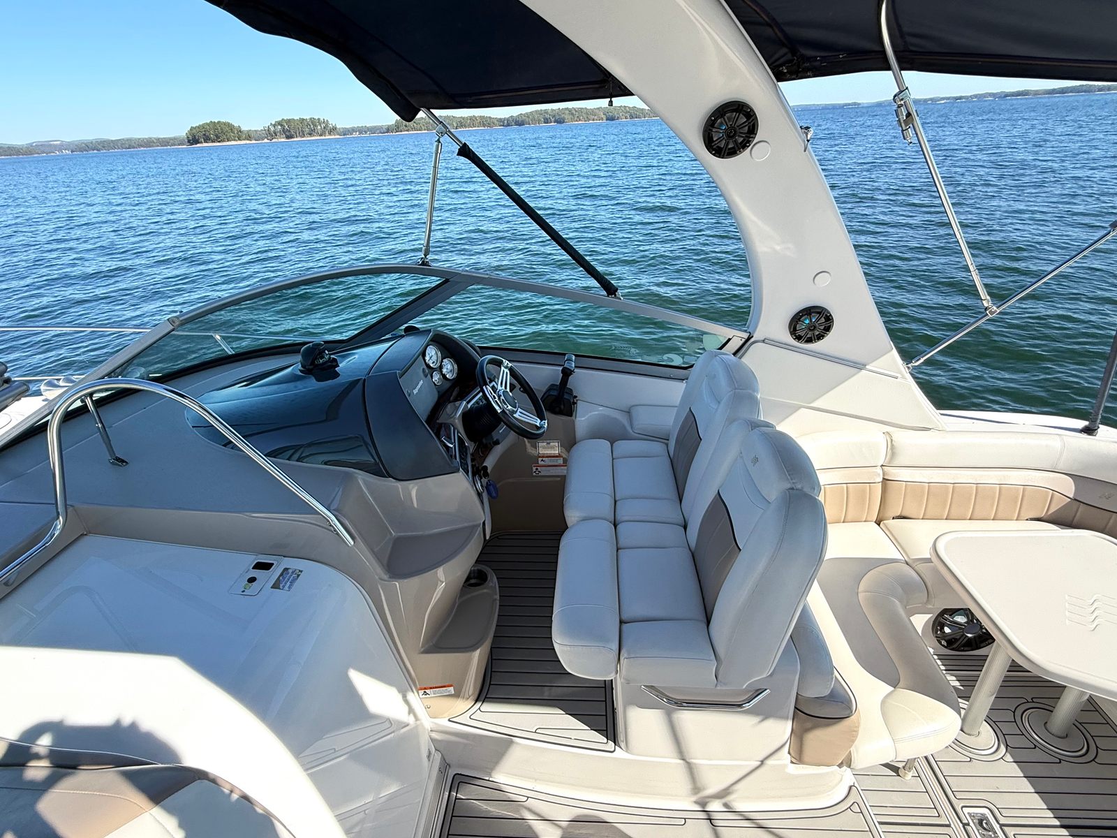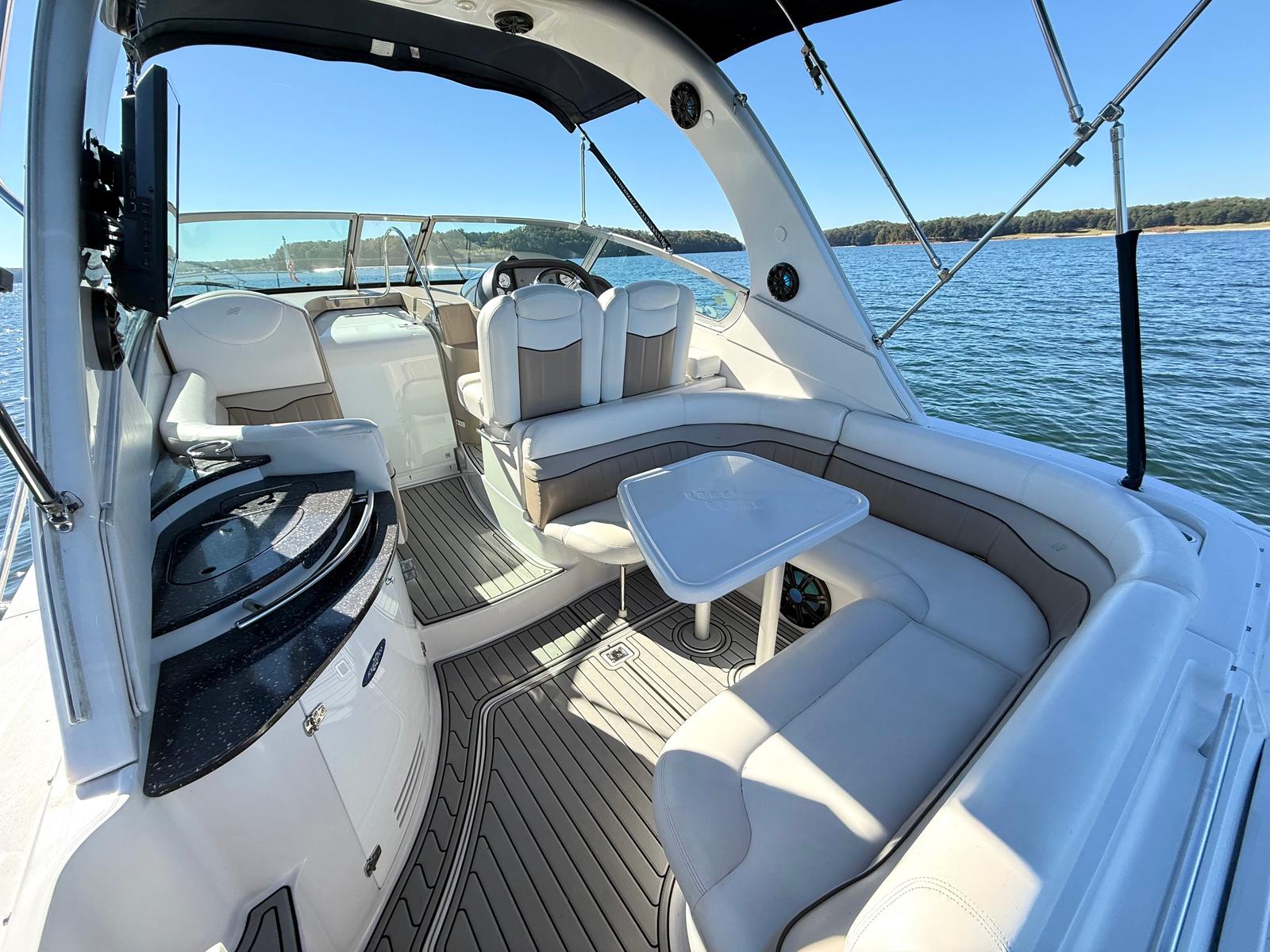 Designed for easy entertaining and comfortable cruising, the cockpit features a spacious U-shaped seating area, full SeaDeck flooring, and a center walk-through to the bow. A full camper canvas with isinglass enclosure and a cockpit cover provide flexibility and protection in any weather.