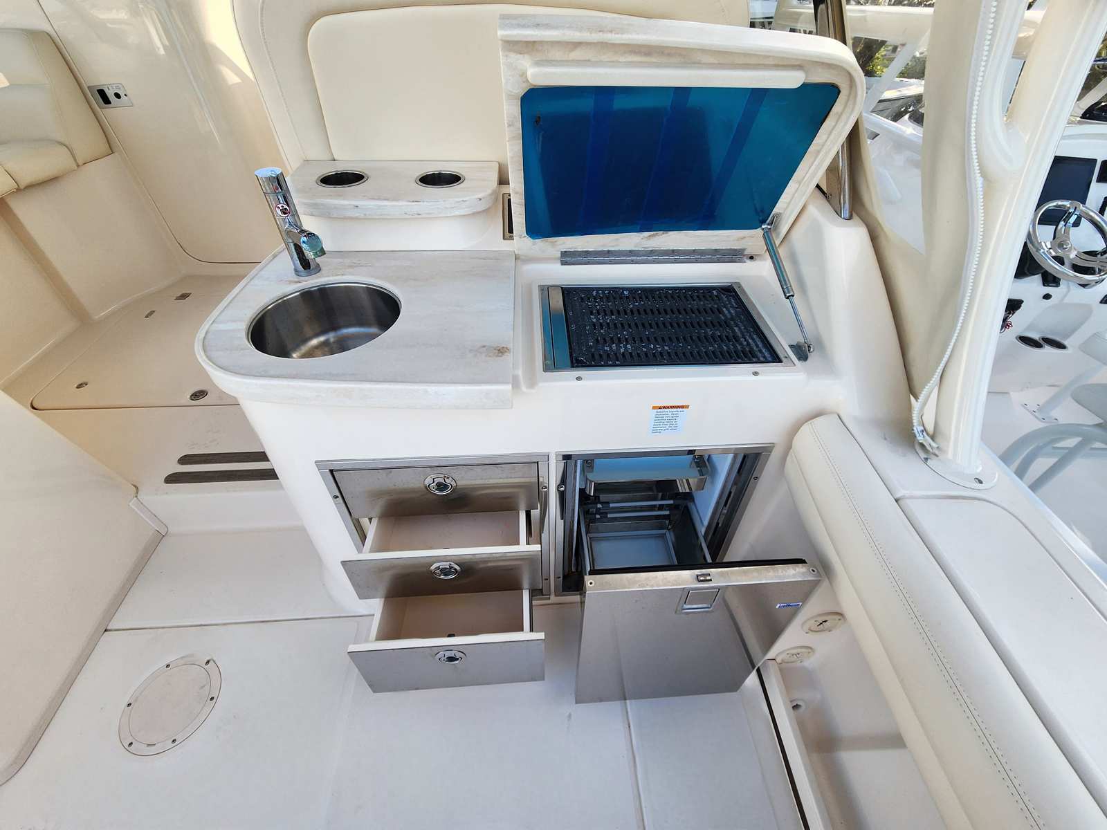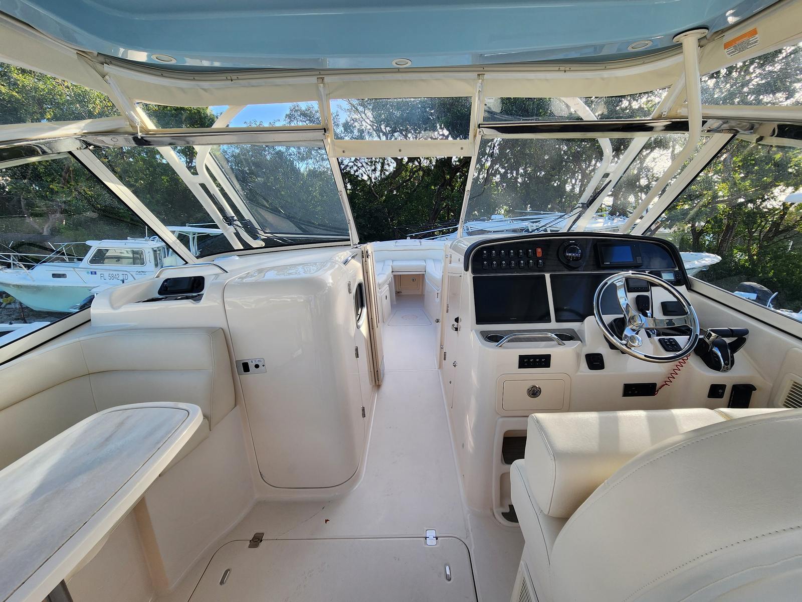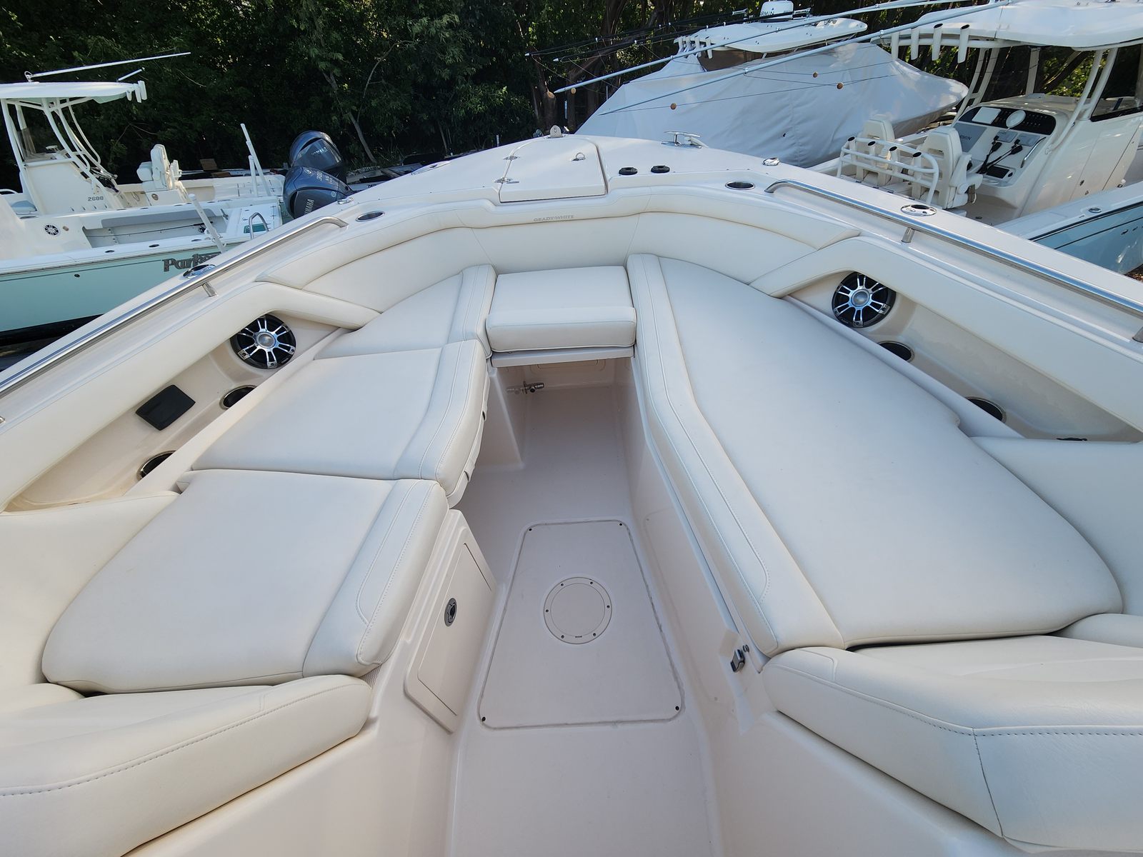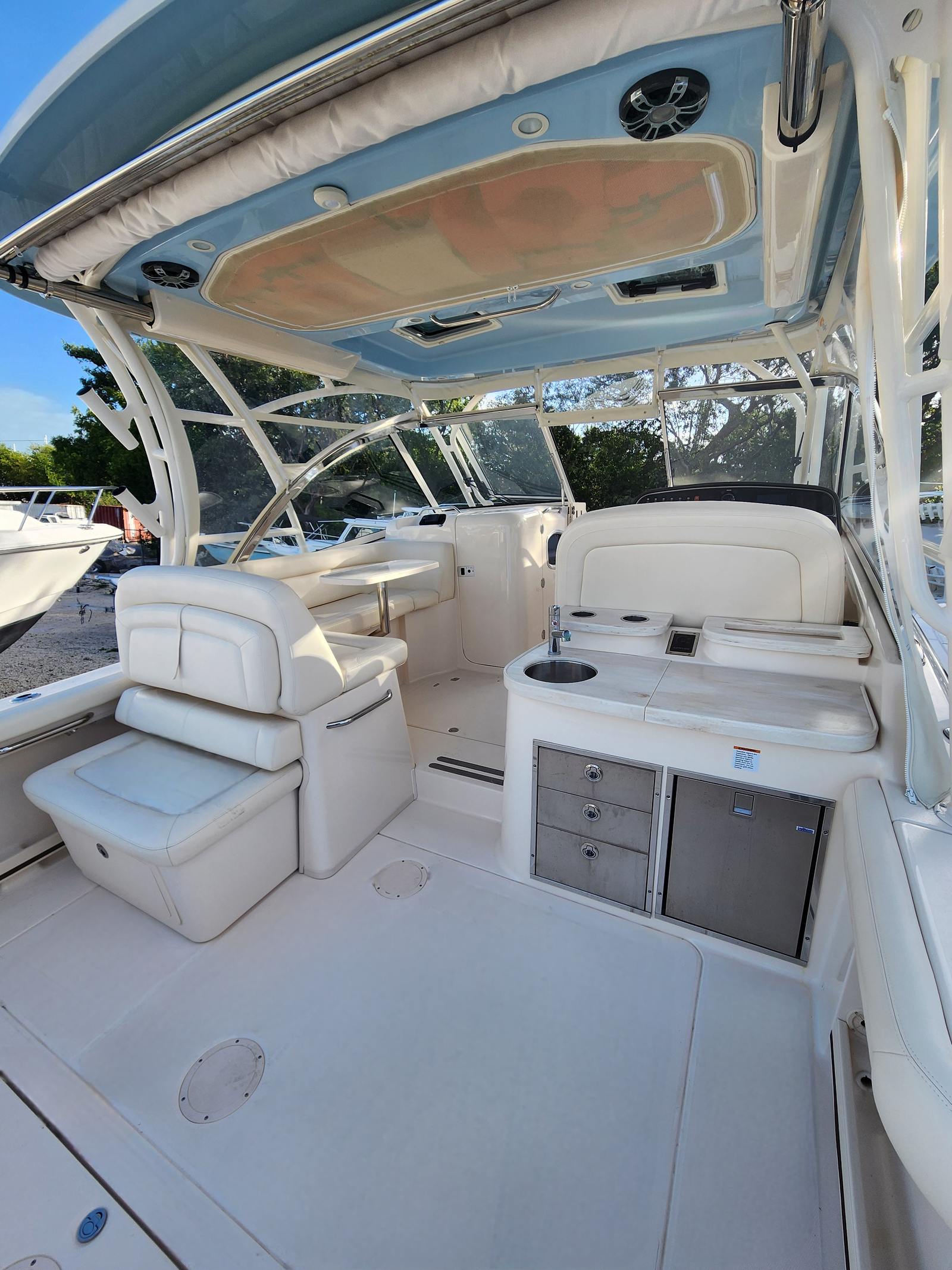 Powering the Grady-White Freedom 335 are two high-performance engines, delivering a combined 850 horsepower. With 480 engine hours, these motors have been well maintained and are ready to provide exhilarating speed and smooth handling. The dual-engine setup ensures optimal maneuverability and stability, whether you’re navigating open waters or docking at your favorite marina. The impressive horsepower translates to quick acceleration and reliable cruising, allowing you to reach your destinations with ease and confidence. This Dual Console boat for sale is engineered for both power and efficiency, making every outing a pleasure.