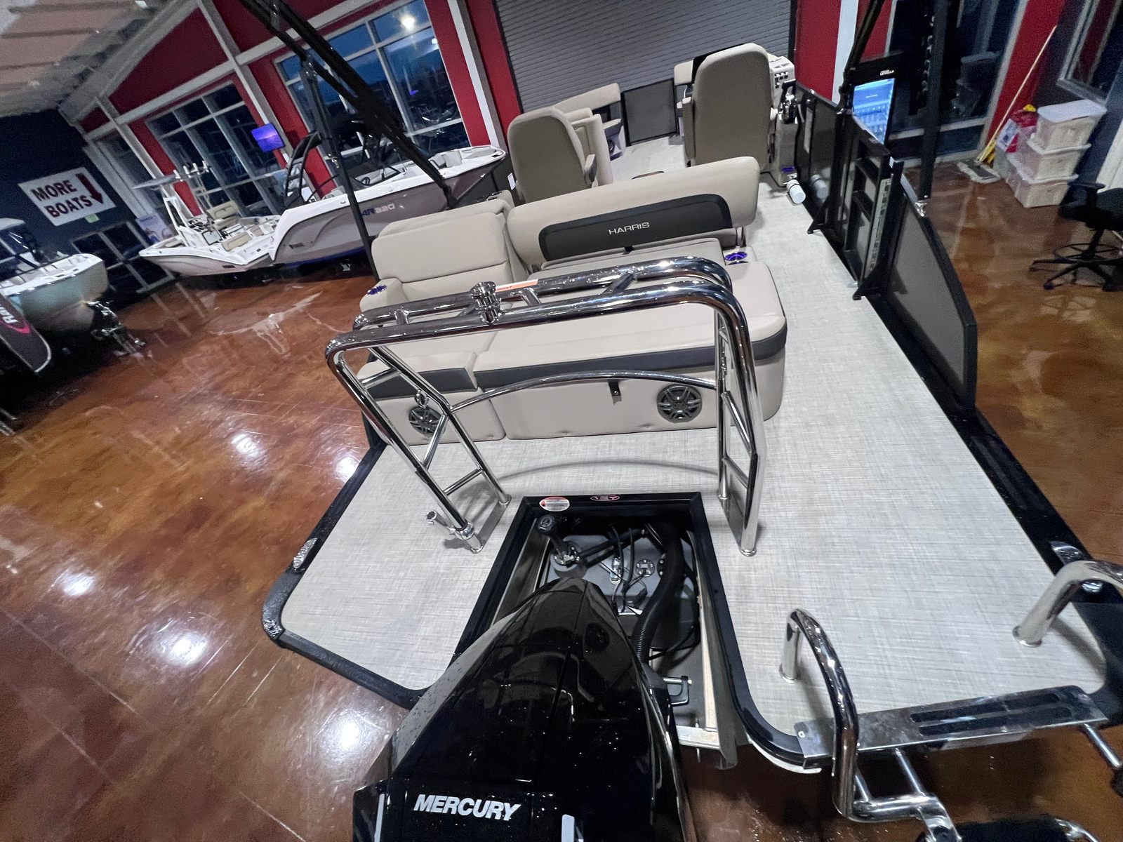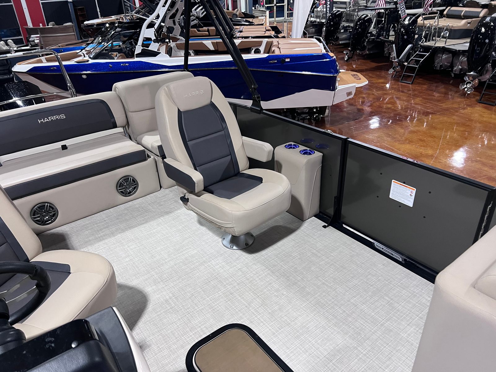 The Harris 230 CR is packed with features designed to enhance your time on the water. Its spacious 25.25-foot deck provides plenty of room for guests to spread out and enjoy the sunshine. The open layout makes it easy to move around, whether you’re hosting a lively gathering or seeking a quiet spot to relax. The pontoon’s sturdy construction and quality materials ensure long-lasting durability, while the stylish design elements add a touch of sophistication.This pontoon boat for sale is equipped with a range of amenities that cater to both comfort and convenience. The seating arrangements are thoughtfully designed to maximize space and provide plush comfort for all passengers. The helm offers excellent visibility and intuitive controls, allowing the captain to navigate with confidence. Storage compartments are strategically placed throughout the boat, making it easy to stow away gear, snacks, and water toys.