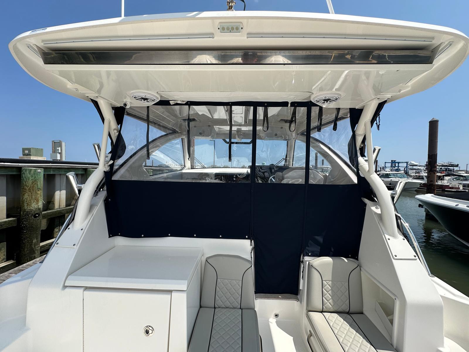 The Pursuit 355 OS is designed with both luxury and functionality in mind. Its spacious layout provides plenty of room for guests, making it ideal for social gatherings and extended trips. The cruiser’s thoughtful design maximizes comfort, with well-appointed seating areas and ample deck space for sunbathing, dining, or simply enjoying the view. The helm station is ergonomically designed for ease of use, offering excellent visibility and intuitive controls for a stress-free boating experience. Every detail of this Pursuit boat for sale reflects the brand’s commitment to quality craftsmanship and innovative design.