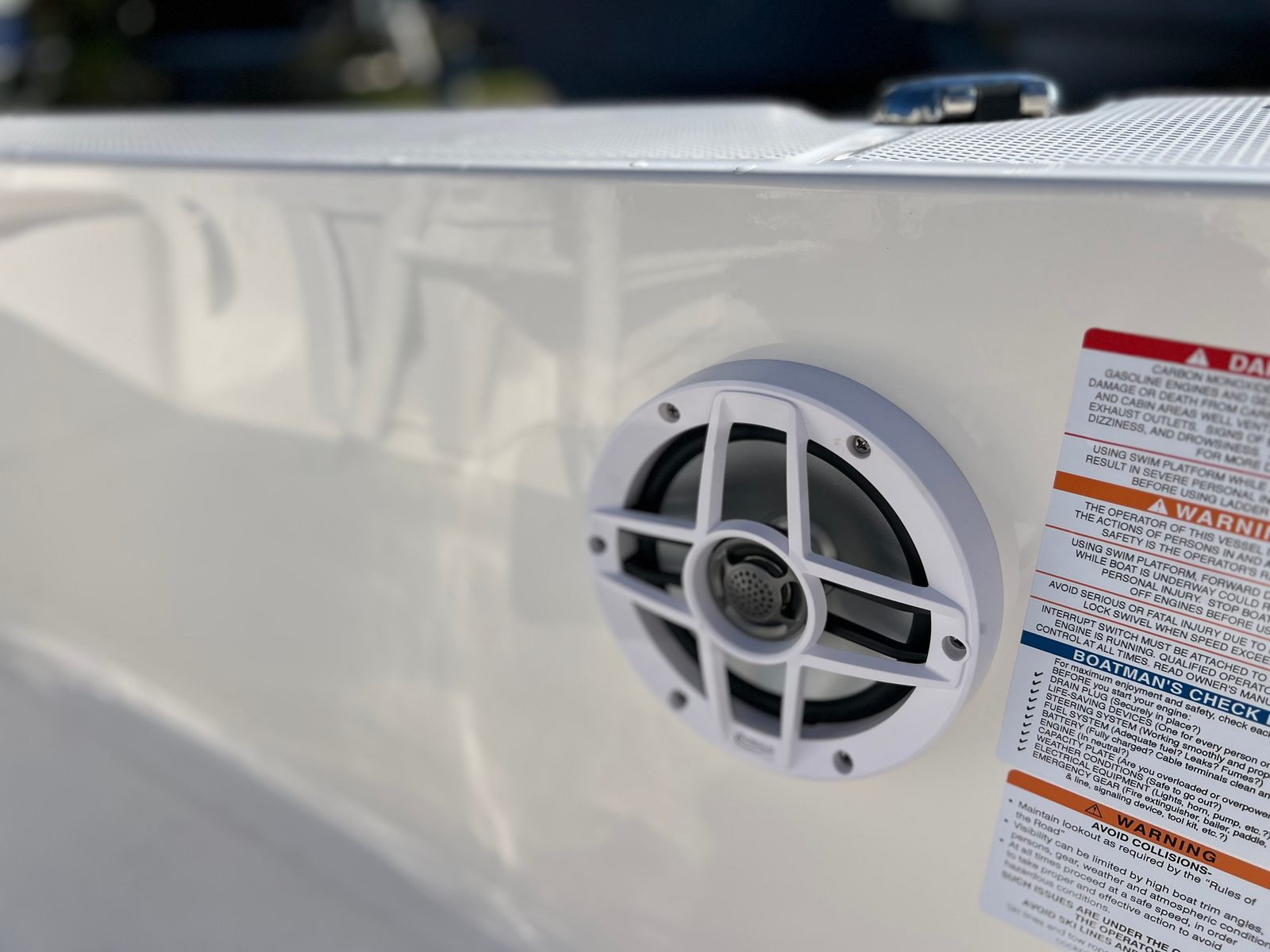One of the standout features of this bay boat is the starboard dive swim platform with a boarding ladder. This innovative addition allows for easy access to the water, perfect for swimming, diving, or launching water toys. Whether you're cooling off on a hot day or seeking adventure beneath the waves, this swim platform enhances the versatility of your boating experience. The white powder-coated leaning post not only adds a sleek aesthetic but also serves as a sturdy support for your gear, ensuring everything stays securely in place during your adventures.