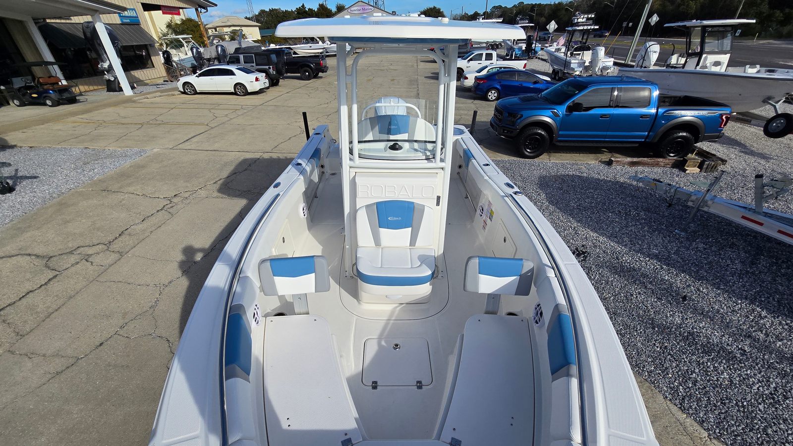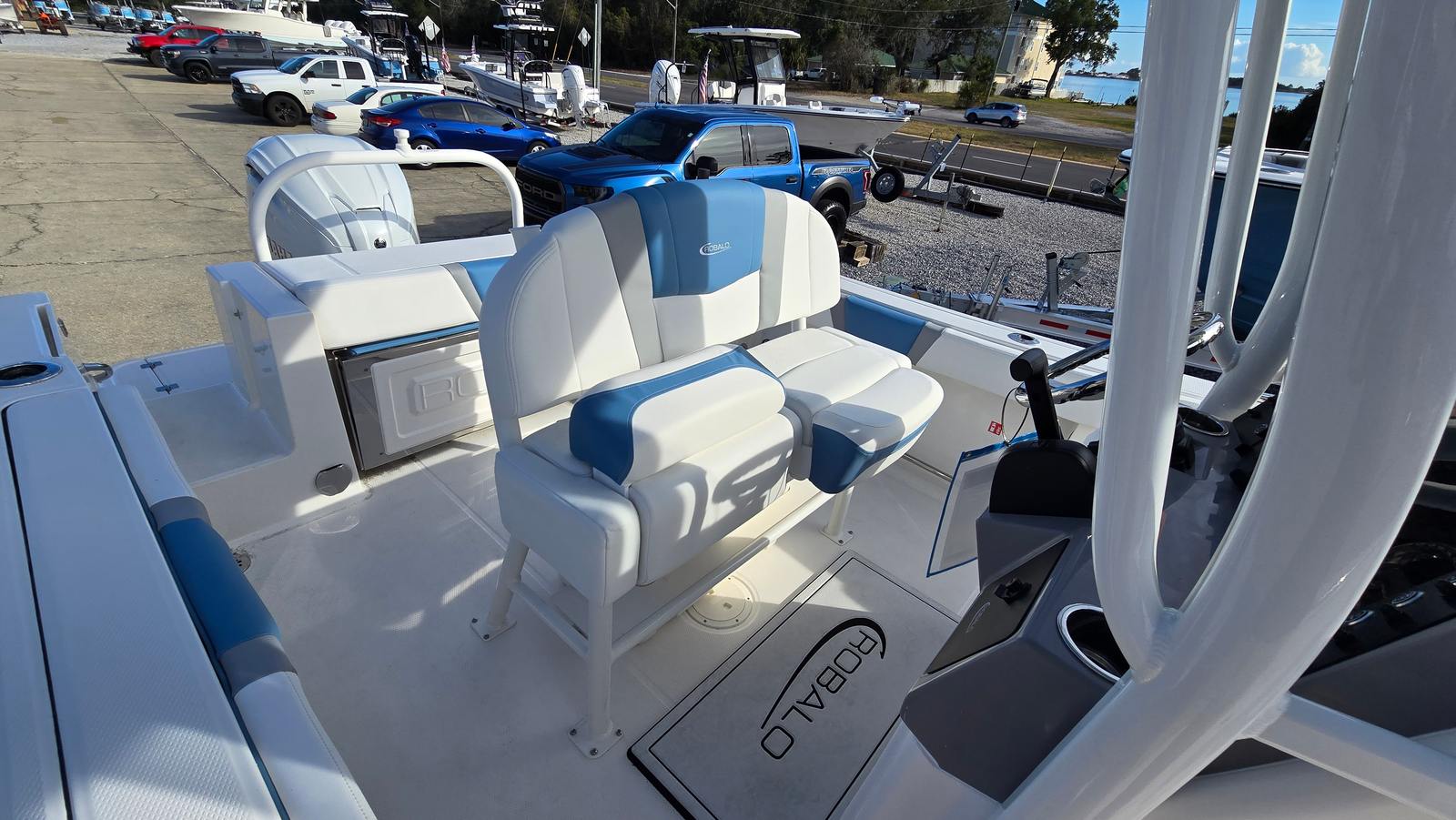 This Robalo boat for sale is packed with premium features that elevate your boating experience. The standard hard top is complete with a powder-coated white finish, providing shade and protection from the elements while enhancing the boat’s sleek silhouette. The hardtop underside gel color in Atlas Blue adds a custom touch that ties the entire design together. For added comfort at the helm, the Seadek helm mat in white offers a soft, non-slip surface, making long days on the water more enjoyable. The cockpit interior in Harbor Atlas Blue is both stylish and functional, creating a relaxing environment for you and your guests. If equipped, the black canvas and canvas accessories provide additional versatility and protection, ensuring you’re ready for any adventure.