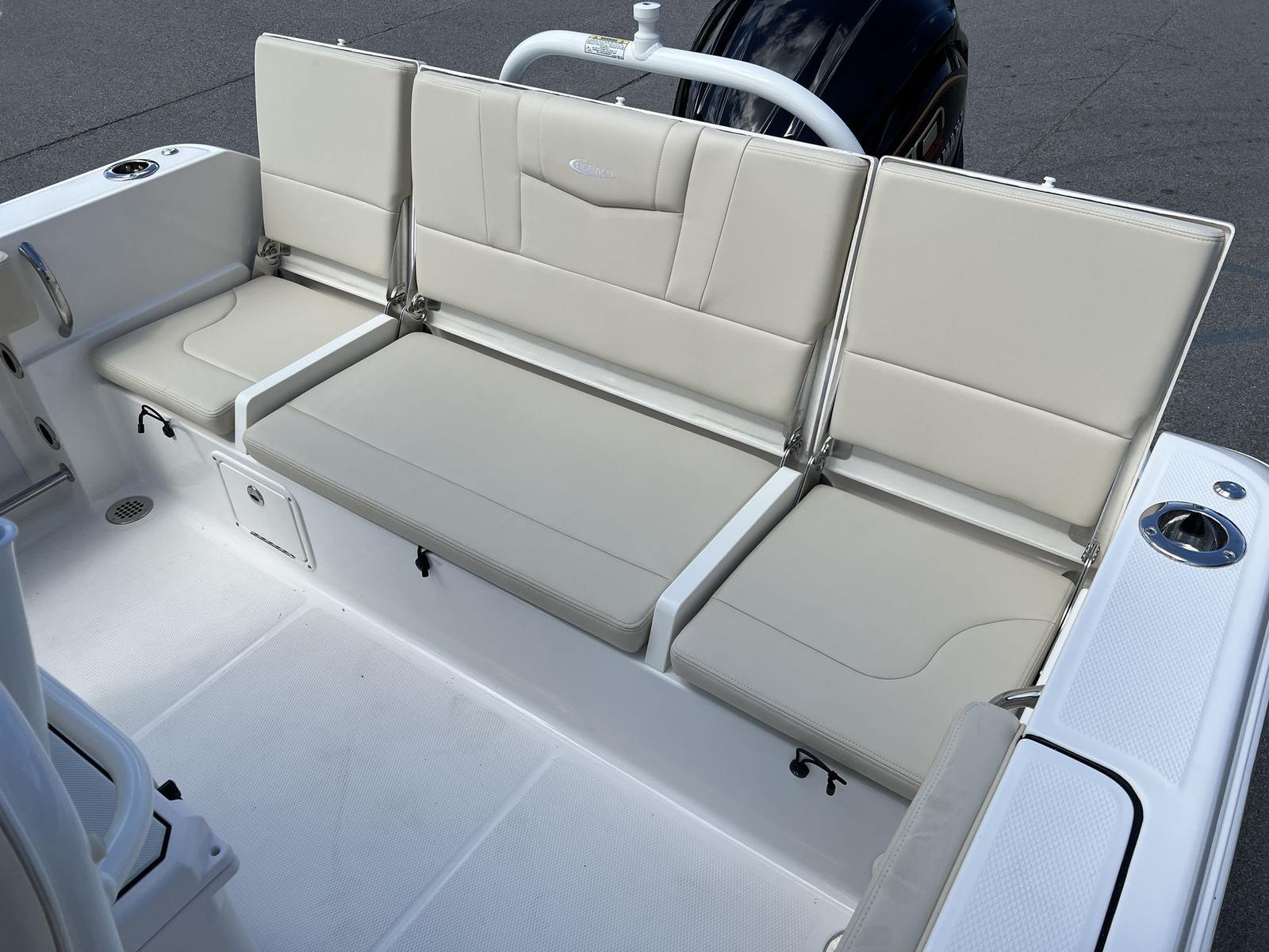 The Robalo 232 EX is designed with practicality in mind, making ownership as enjoyable as it is exciting. Its 23-foot length strikes the perfect balance between spaciousness and maneuverability, making docking and storage straightforward, even for those with limited experience. The efficient Yamaha VF250XB engine helps keep fuel costs manageable, allowing for longer trips and more time spent enjoying the water.The hardtop provides essential protection from the elements, while the covers for the leaning post and console help maintain the boat’s pristine appearance. The Simrad NSS4/12 system simplifies navigation and system management, reducing stress and enhancing safety. Trim tabs with indicators offer precise control, ensuring a smooth and stable ride in various conditions.