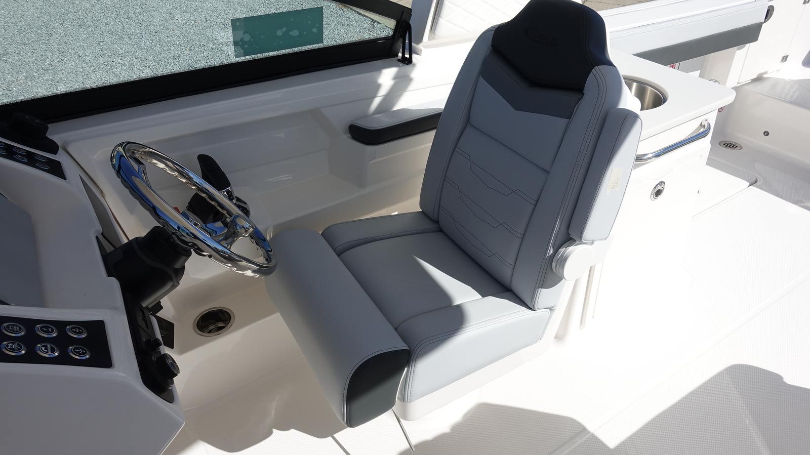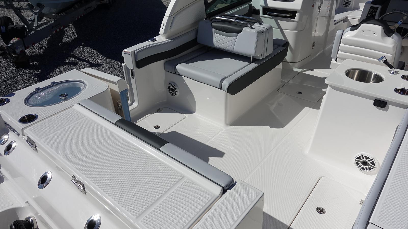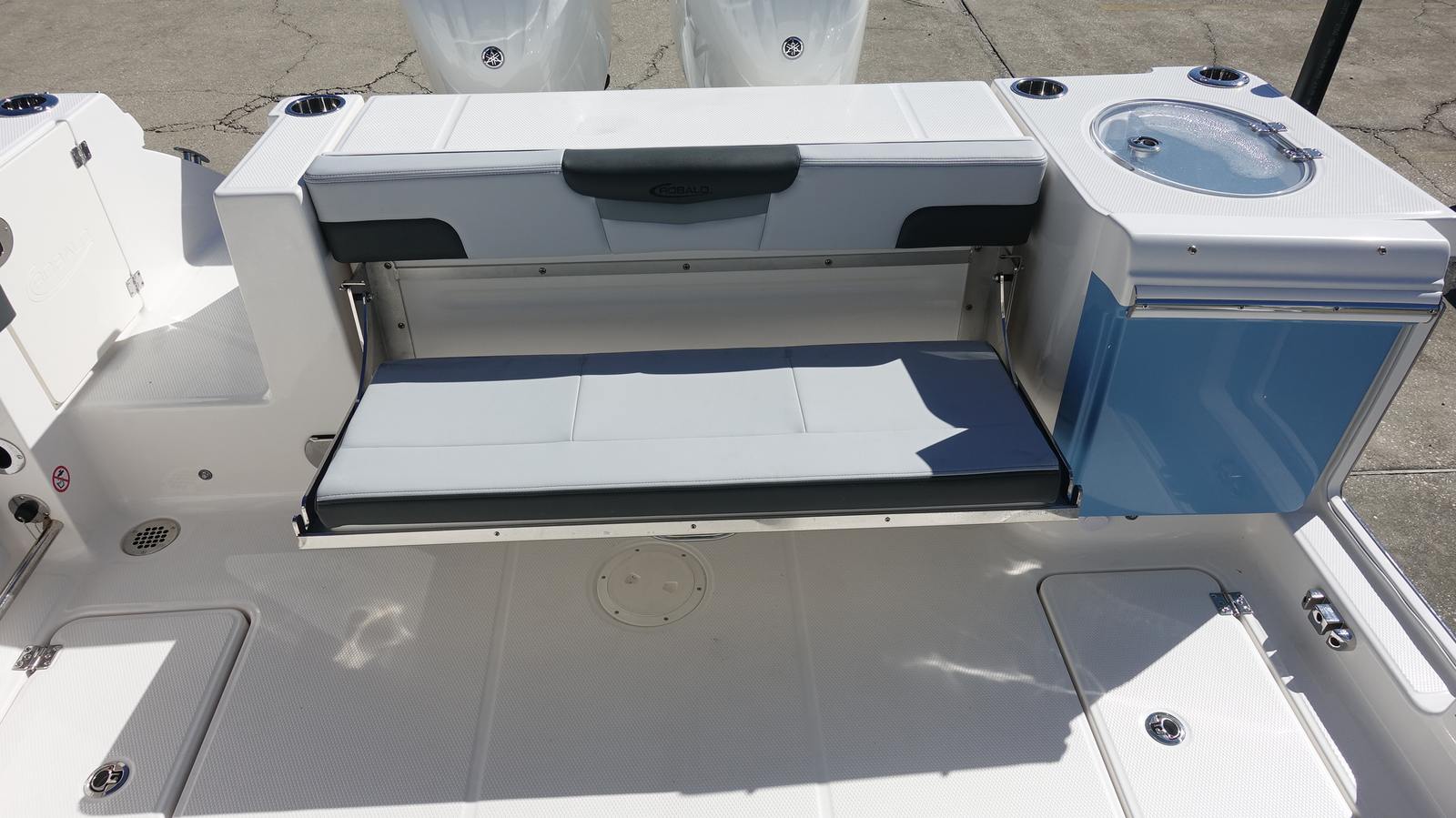 Power and precision define the performance of the Robalo 257 DC. Equipped with twin Yamaha F150XSA2 outboard engines, each delivering 150 horsepower, this boat boasts a combined 300 horsepower for exhilarating speed and responsive handling. The white engines are paired with electro-hydraulic steering, ensuring smooth maneuverability and effortless control, even in challenging conditions. Whether you are cruising along the coastline, towing water toys, or heading out for a day of fishing, the Robalo 257 DC offers the power and agility you need for any adventure.