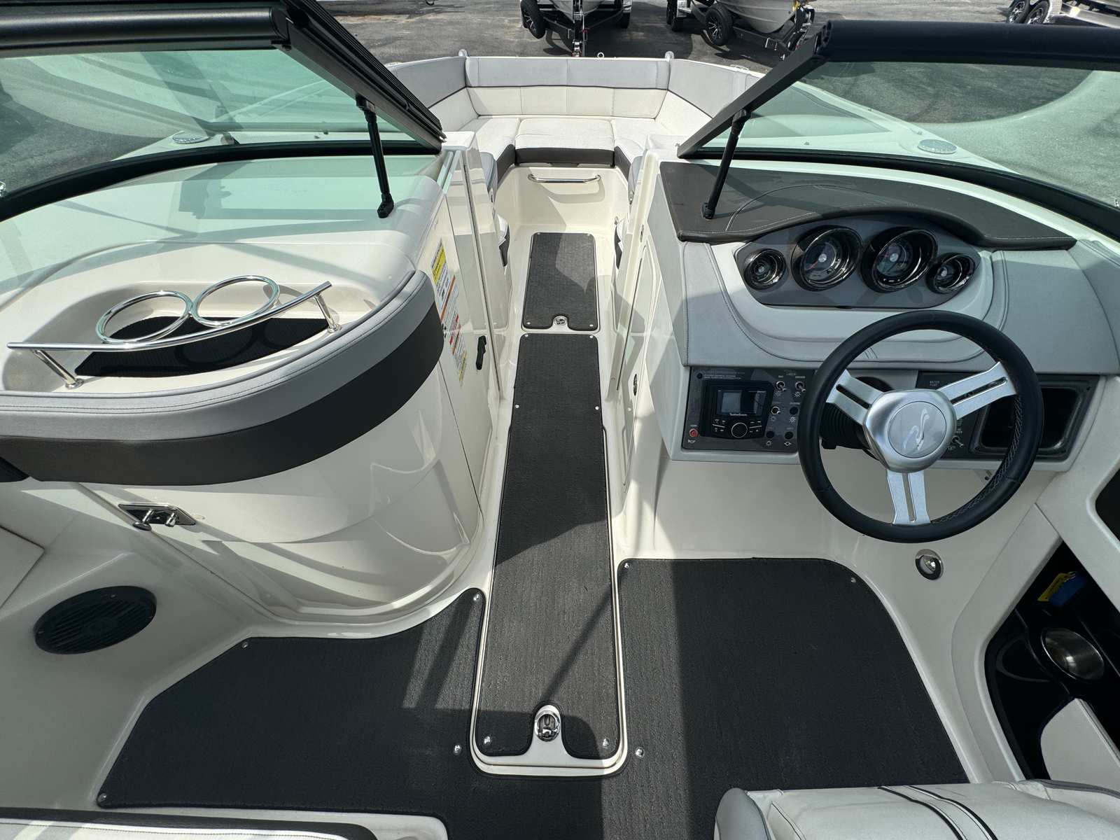 The Sea Ray SDX 240 is designed with practicality in mind, making ownership as enjoyable as the time spent on the water. The tandem axle trailer with swing tongue offers easy towing and maneuverability, whether you’re heading to a nearby lake or exploring new coastal destinations. The cover protects your boat from the elements, reducing maintenance and preserving its appearance. Annual service means you can trust the engine’s reliability, while the dual prop system provides efficient fuel consumption and improved handling. Docking is a breeze thanks to the responsive controls, and the spacious deck offers plenty of room for gear, coolers, and water toys.
