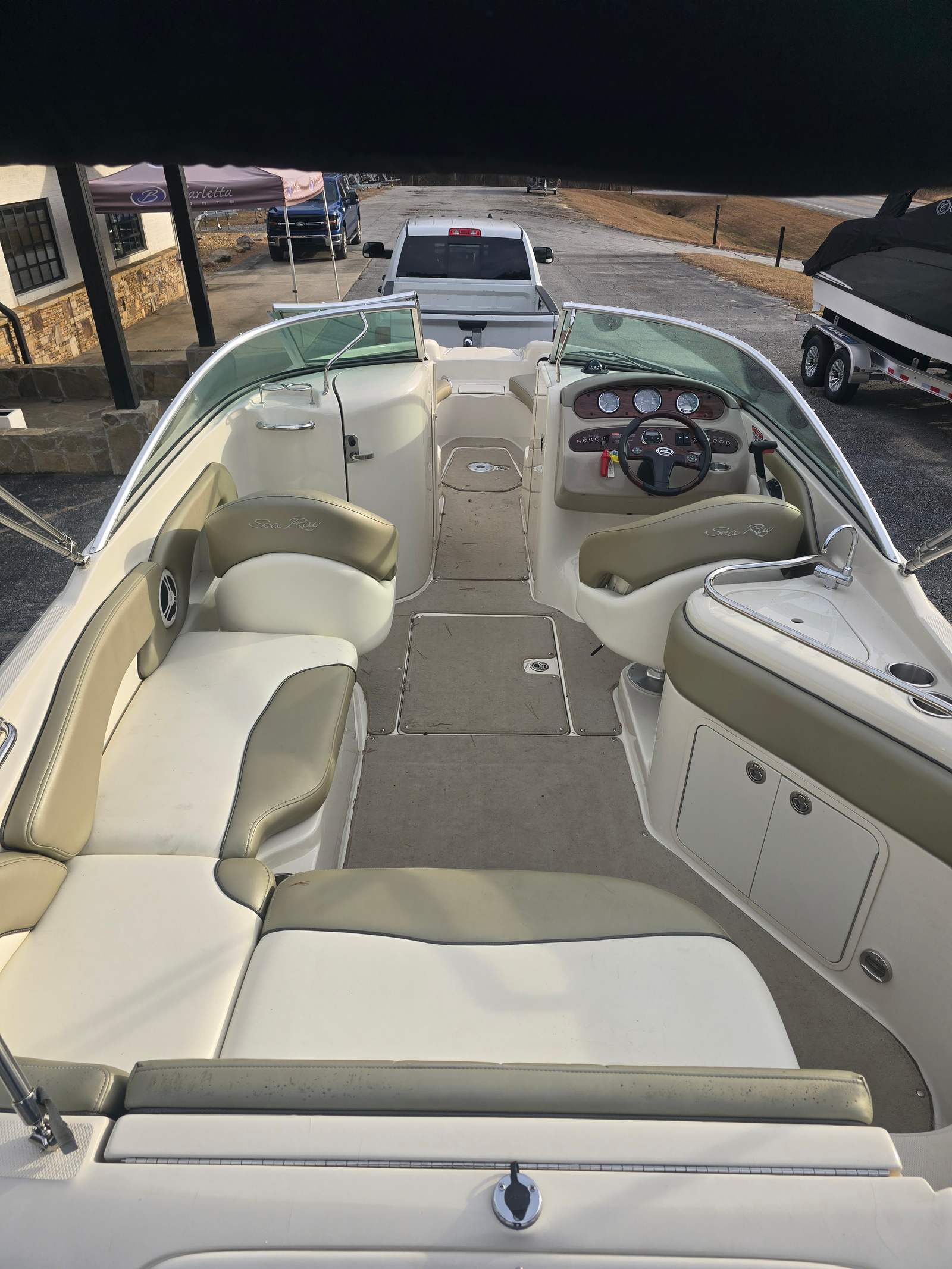 Practicality is at the heart of the Sea Ray Sundeck 240’s appeal. Its manageable size makes docking and maneuvering a breeze, even for those new to boating. The efficient engine ensures you can enjoy extended outings without worrying about excessive fuel consumption. Ample storage compartments throughout the deckboat provide convenient spaces to stow gear, water toys, and personal items, keeping the deck clutter-free and organized. The durable construction and reliable performance mean you can count on this Sea Ray boat for sale to deliver worry-free adventures season after season.