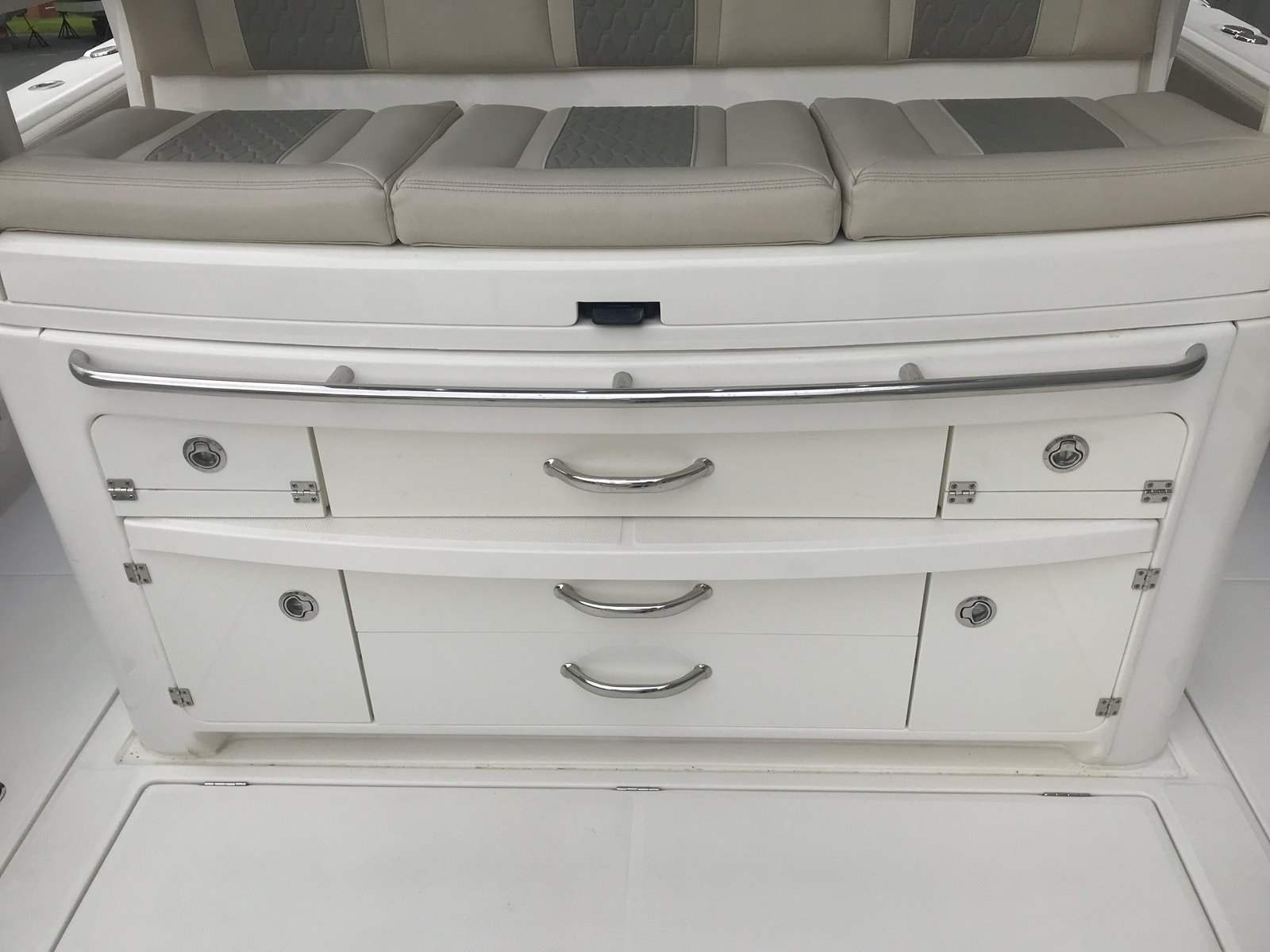 Powering the Solace 41 CS are three Yamaha V8 425 XTO outboard engines, delivering a combined 1275 horsepower. These triple engines, finished in Pearlescent White, offer exhilarating acceleration, smooth cruising, and reliable offshore capability. With the advanced Helm Master system, you’ll enjoy precise control and effortless maneuvering, whether docking in tight spaces or navigating open waters. The low engine hours further ensure that these engines are ready to provide years of dependable performance, making this Center Console boat for sale a smart investment for serious boaters.