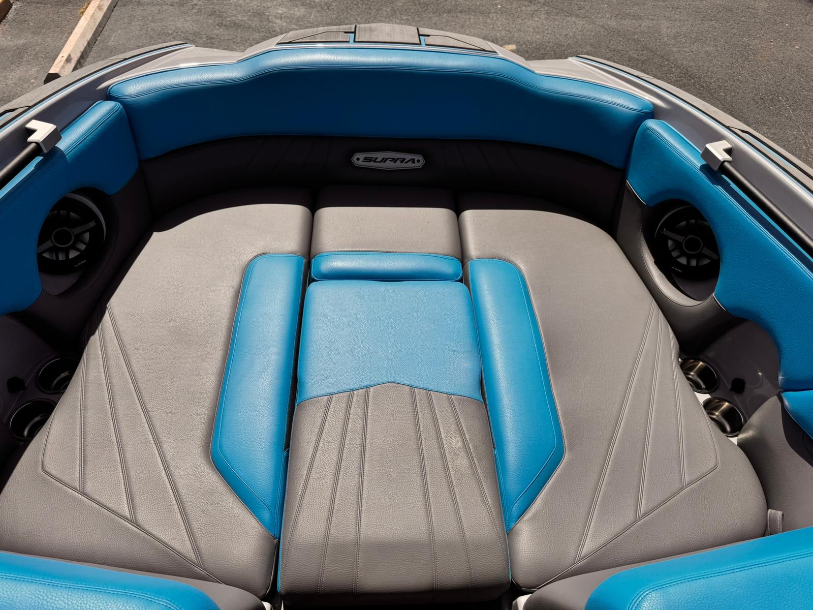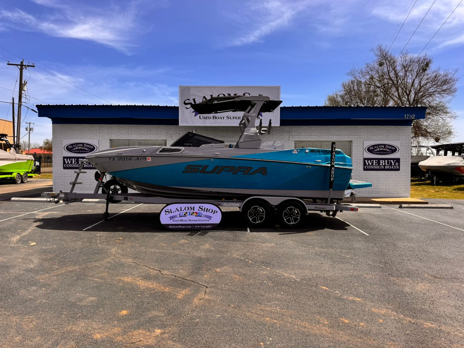 Now available on consignment at our Used Boat Super Center in Lewisville, this 2021 Supra SA 450 is a top-tier surf and wake boat built for elite performance and luxury. Finished in a stunning ultra blue metalflake and light graphite gelcoat with a Pacific Blue and dark graphite ChillTech interior, this SA is powered by an Indmar 6.2L closed-cooled V8 producing 450 horsepower with 236 hours.