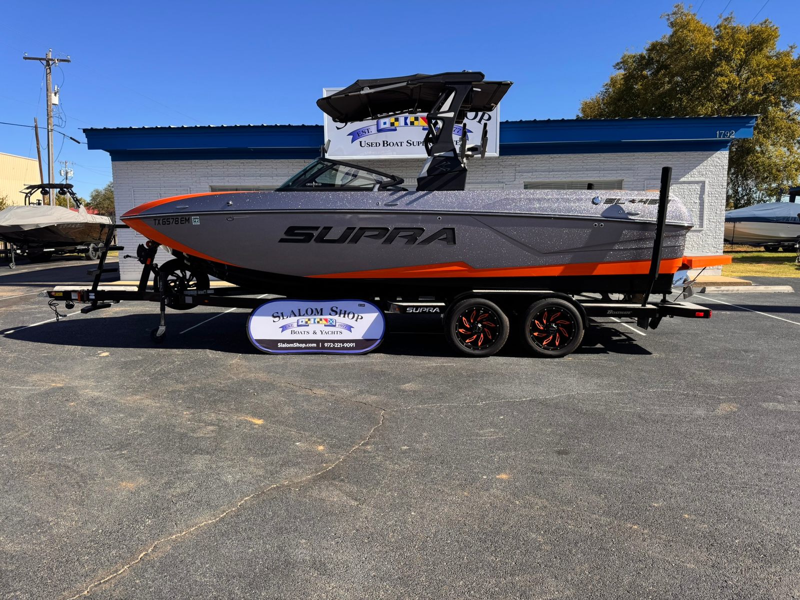 Now available on consignment at our New Used Boat Super Center in Lewisville, this pristine 2019 Supra SL 450 is a high-performance luxury wake boat, designed for surfing, wakeboarding, and family fun. Finished in striking Gunmetal Flake, Orange, and Black gelcoat, it combines cutting-edge technology with attention to detail and superior build quality.