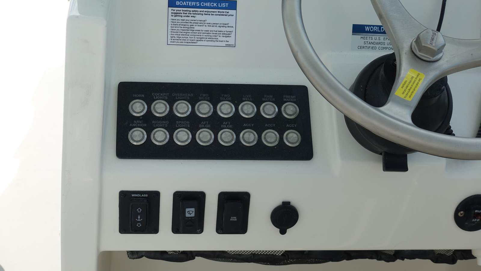 The World Cat 325 DC is packed with premium features that elevate your time on the water. The GARMIN 8616 display offers intuitive navigation and system management, while the B175M-1kW CHIRP transducer delivers crystal-clear sonar for fishing and depth readings. Stay connected and safe with the VHF-115 radio and antenna, ensuring reliable communication wherever your adventures take you. The L-Lounge portside seating provides a comfortable and social space for guests to relax, while the LED underwater light package in blue creates a stunning ambiance for evening cruises.For those who love overnight trips, the overnight package includes a Fisher Panda 6kw diesel generator, offering reliable power for all your onboard amenities. The stereo upgrade transforms your boat into a floating entertainment hub, delivering high-quality sound for parties or quiet evenings under the stars. The 325DC port back-to-back seating maximizes comfort and versatility, allowing you to customize your seating arrangement for any occasion. The Edson wheel, featuring a 14.5" satin finish with power knob and nut, adds a touch of sophistication and ergonomic control to the helm. The hull’s two-toned coastal blue finish ensures you’ll turn heads wherever you go, combining classic elegance with modern flair.